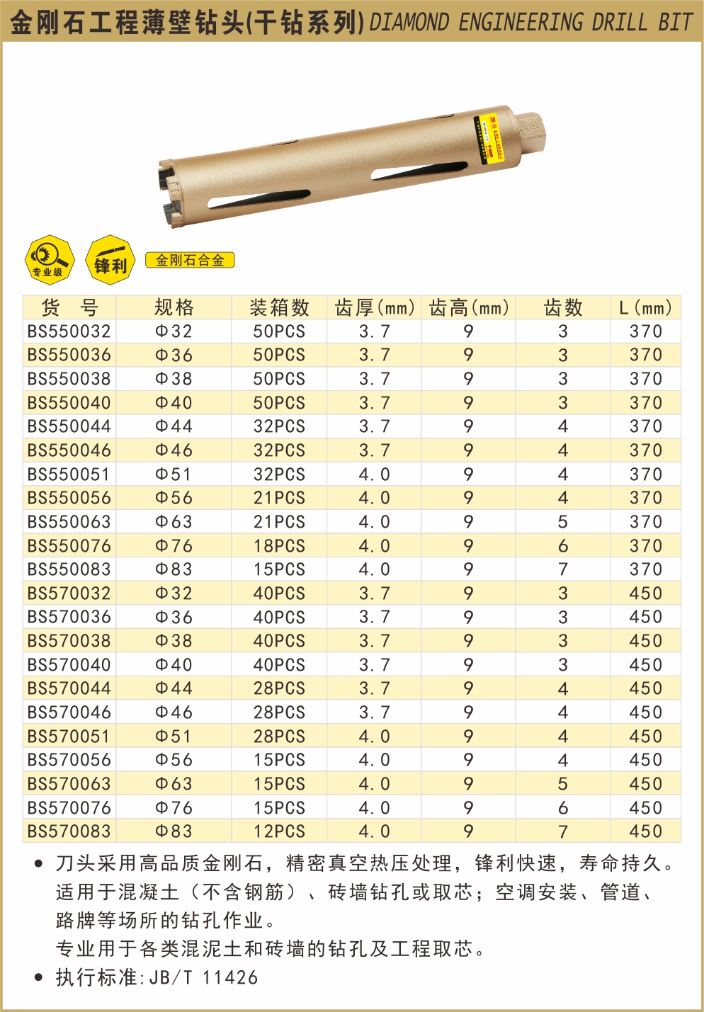 波斯 金刚石工程薄壁钻头 φ83 长450mm BS570083