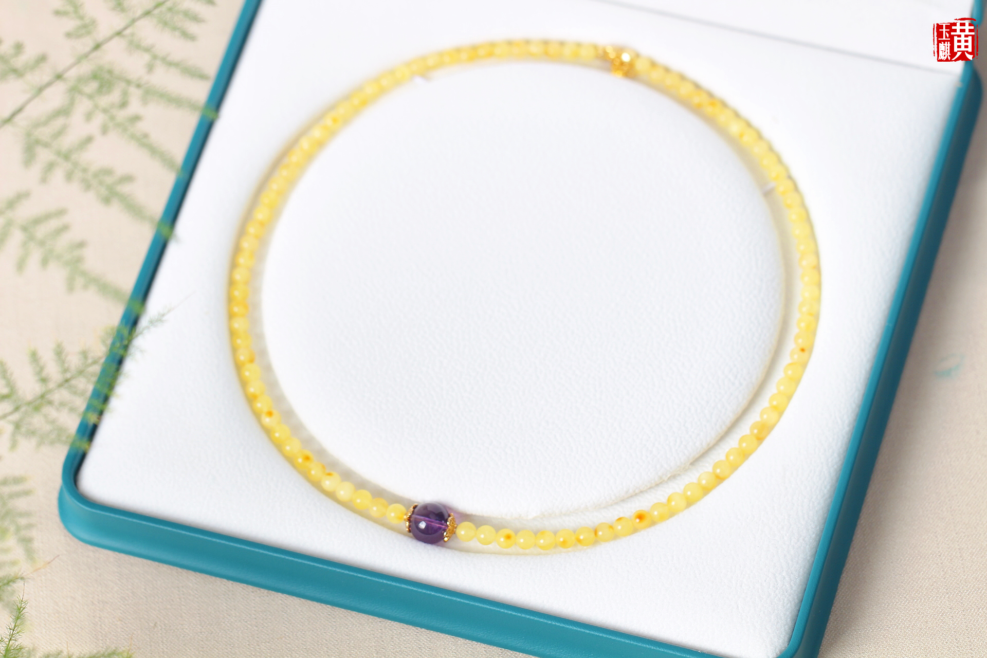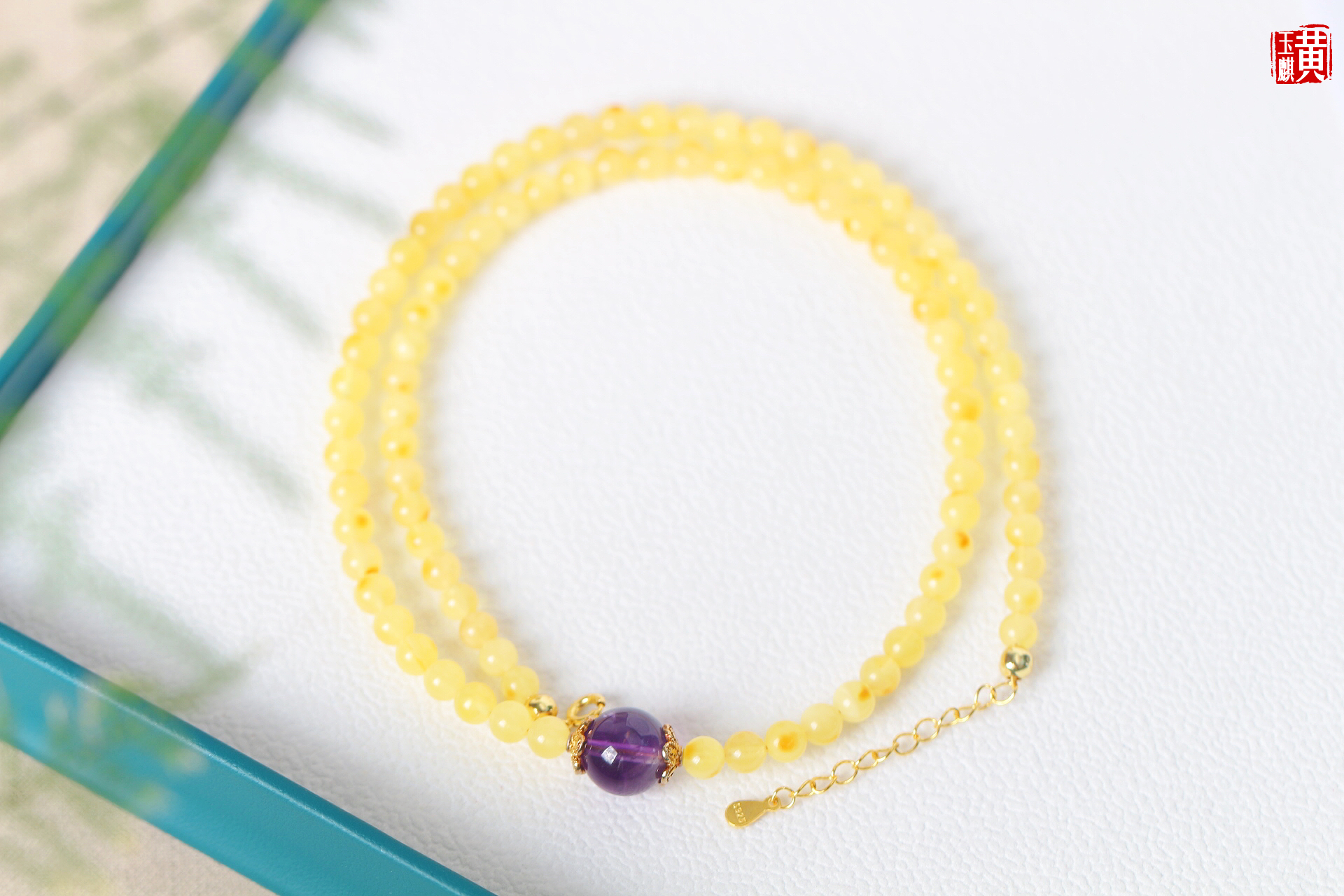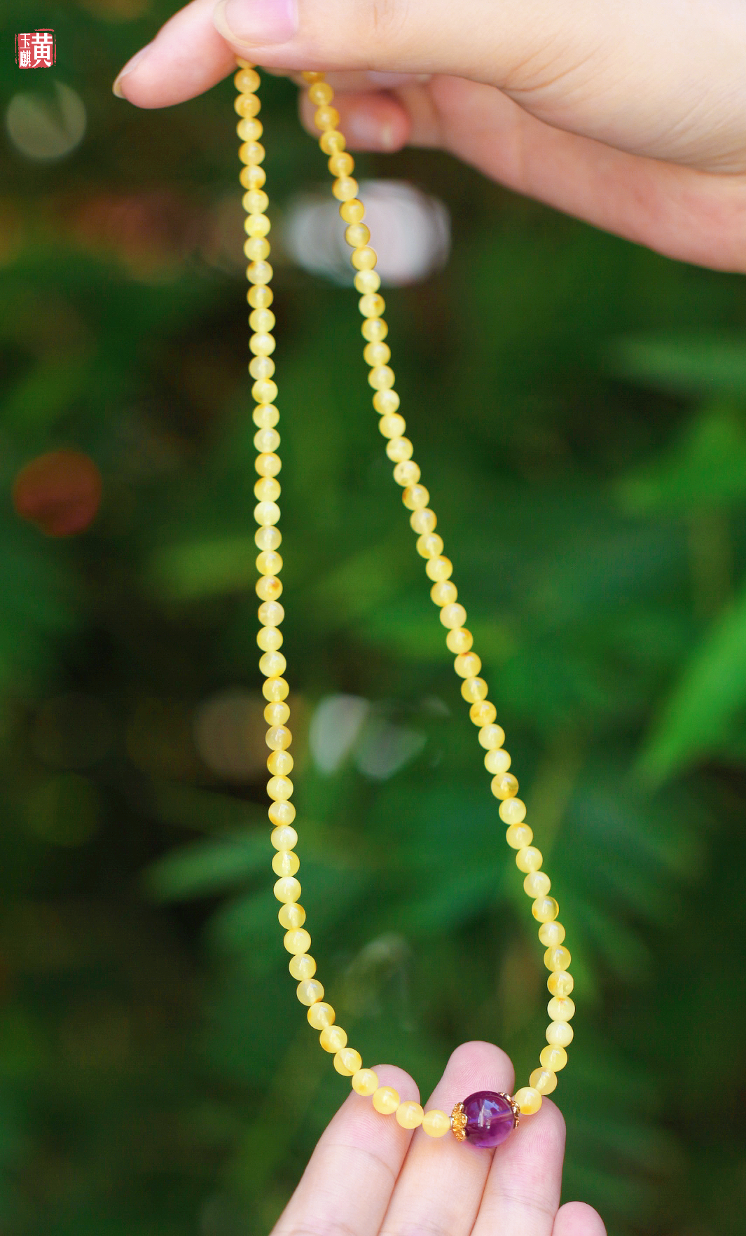 蜜蜡项链,鲜活明亮,柠檬黄色泽,带红皮,灿烂明媚,搭配紫水晶、925银扣链,精美漂亮,佩戴高贵优雅显气质,带礼盒。