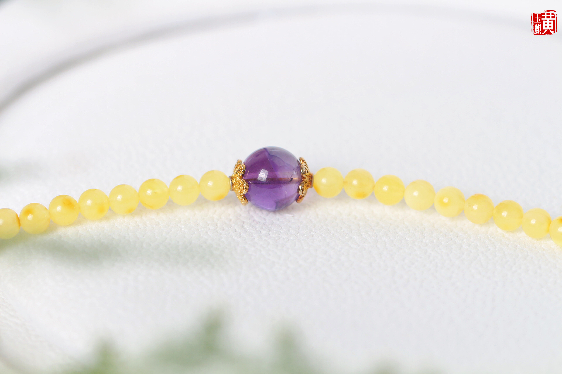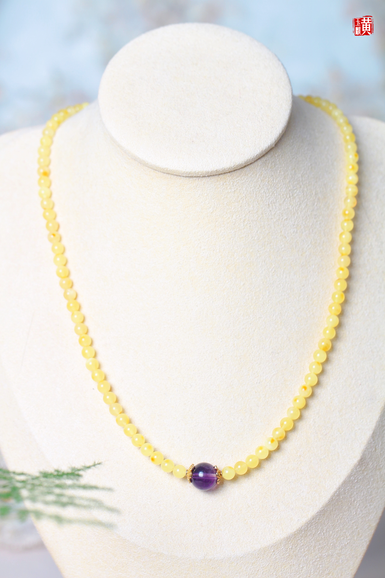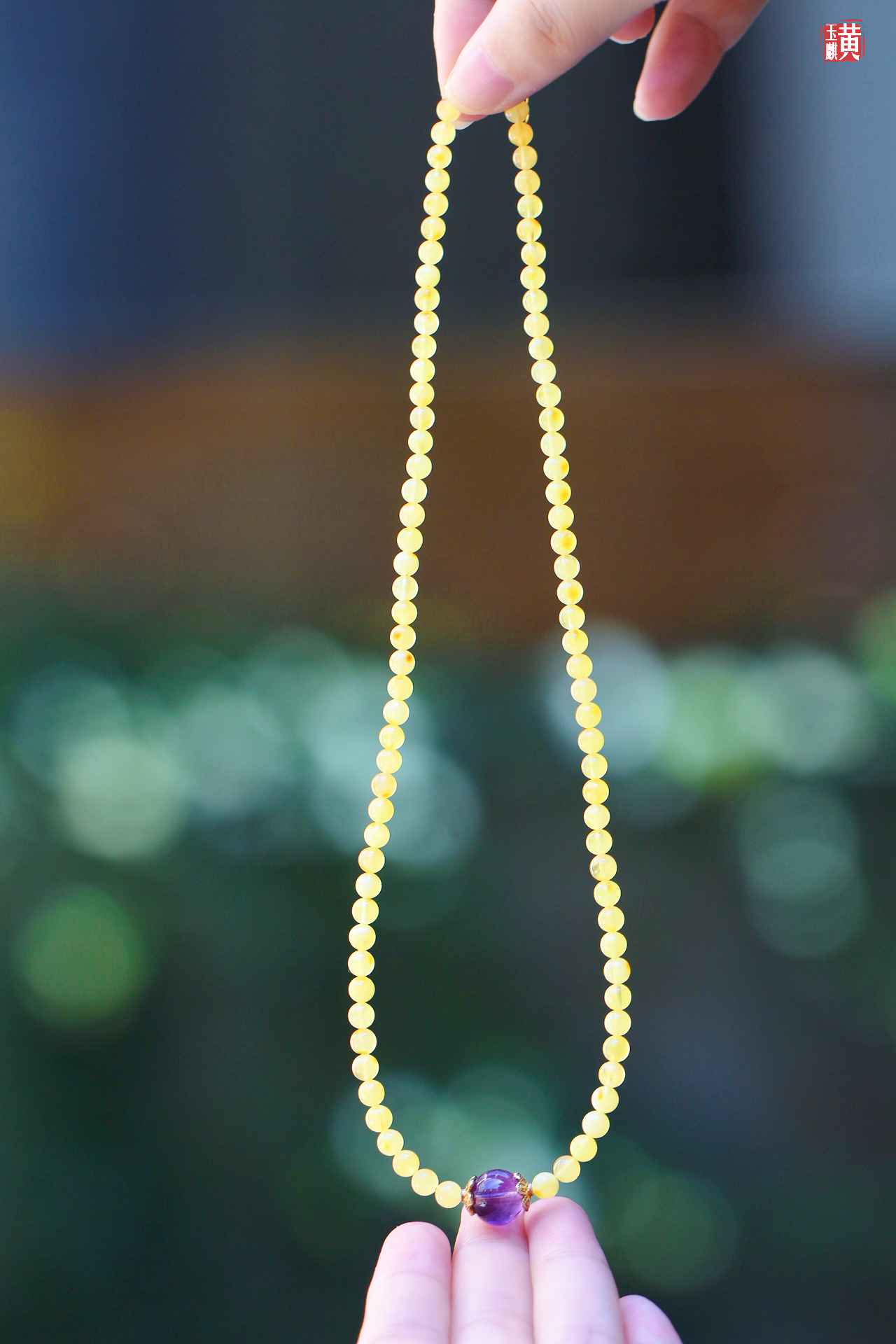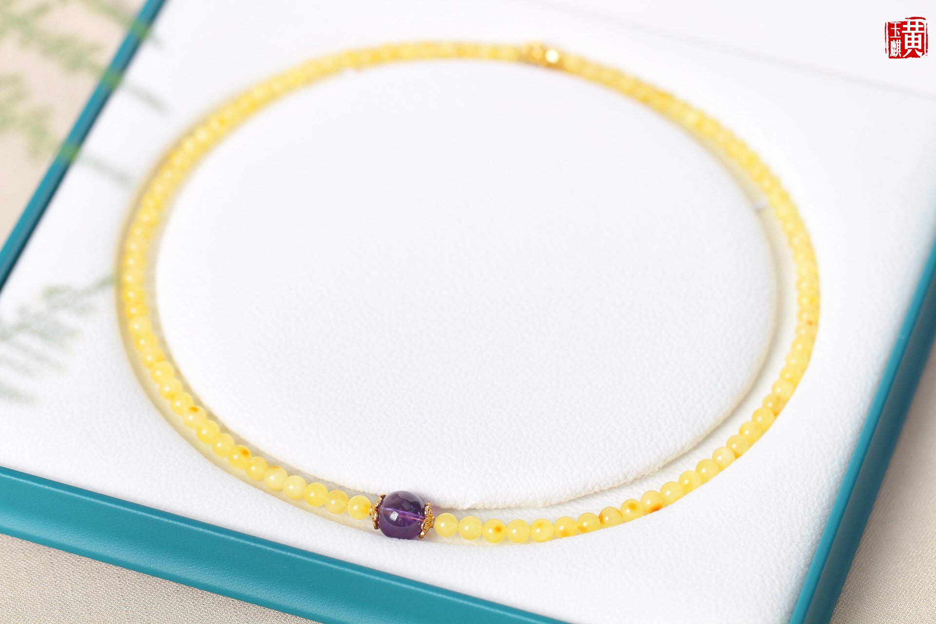 蜜蜡项链,鲜活明亮,柠檬黄色泽,带红皮,灿烂明媚,搭配紫水晶、925银扣链,精美漂亮,佩戴高贵优雅显气质,带礼盒。