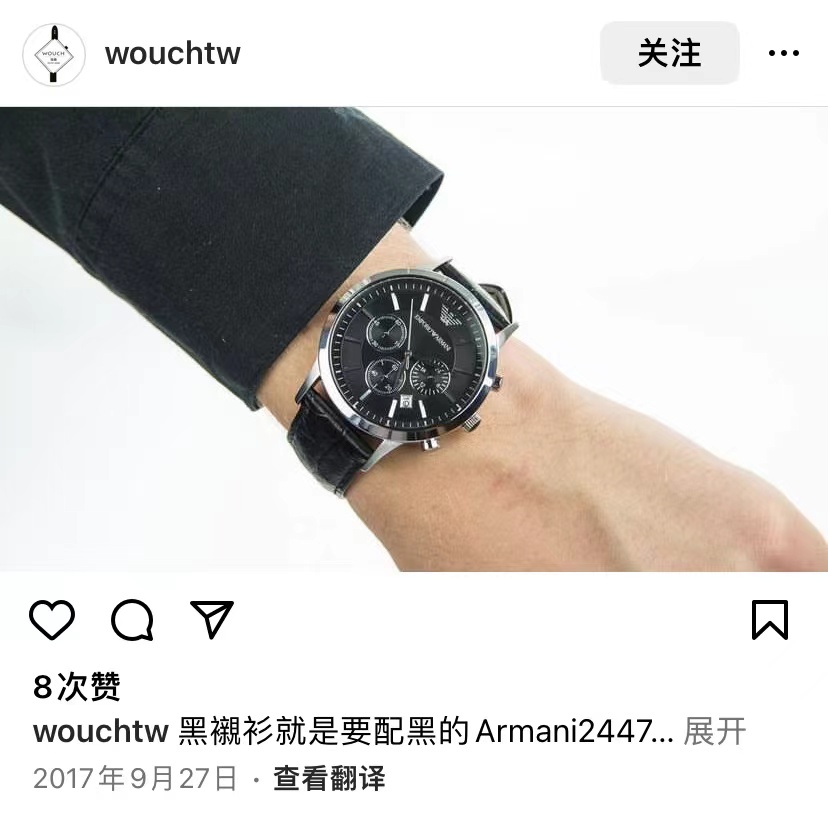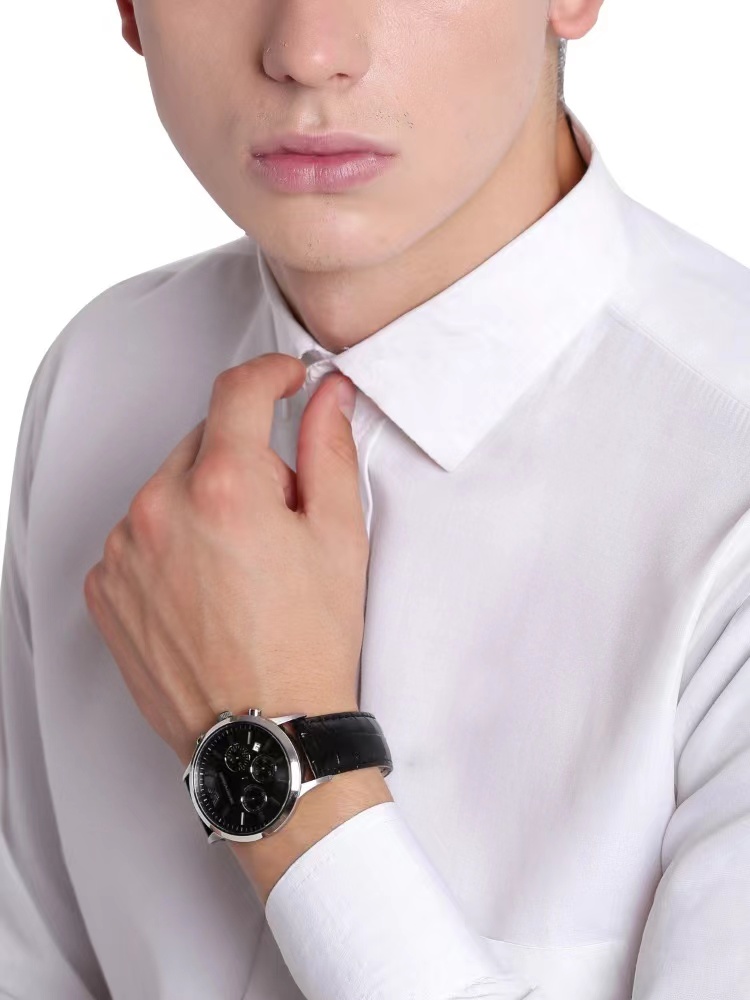 型号AR2447 黑色表盘,三眼设计,小牛皮表带石英表,表盘直径43mm 厚度10mm 强化矿物质玻璃镜面,清晰高透,设计超级精致,表盘表带都十分简约大气,整个气质马上不一样了,小红书剁手款,男神钟爱款,上班不失风度,体现男性硬朗之风和成熟稳重的气质,休闲商务不二之选,生活防水30米。保证正品!配专柜全套包装!