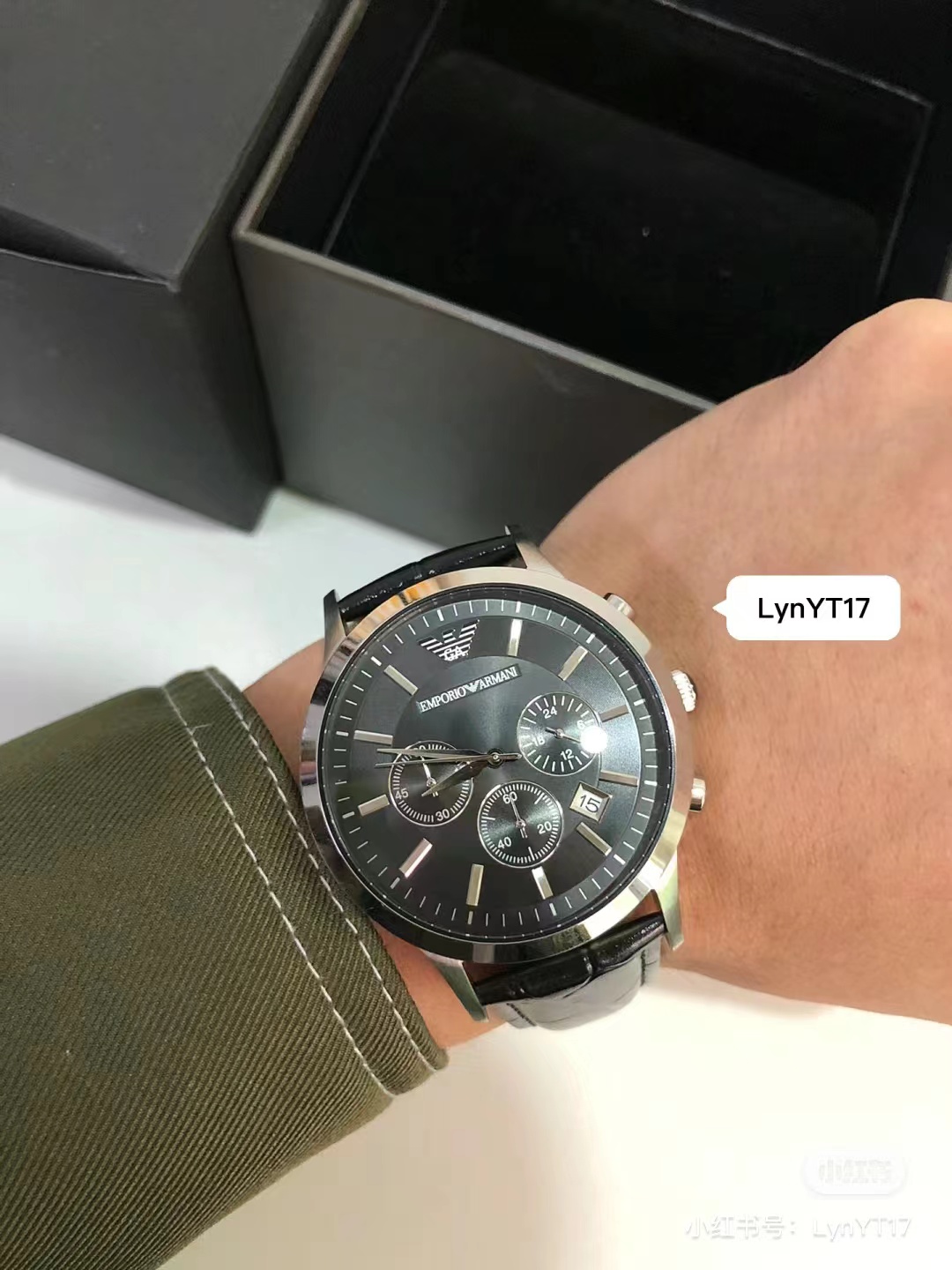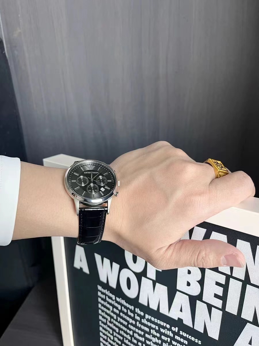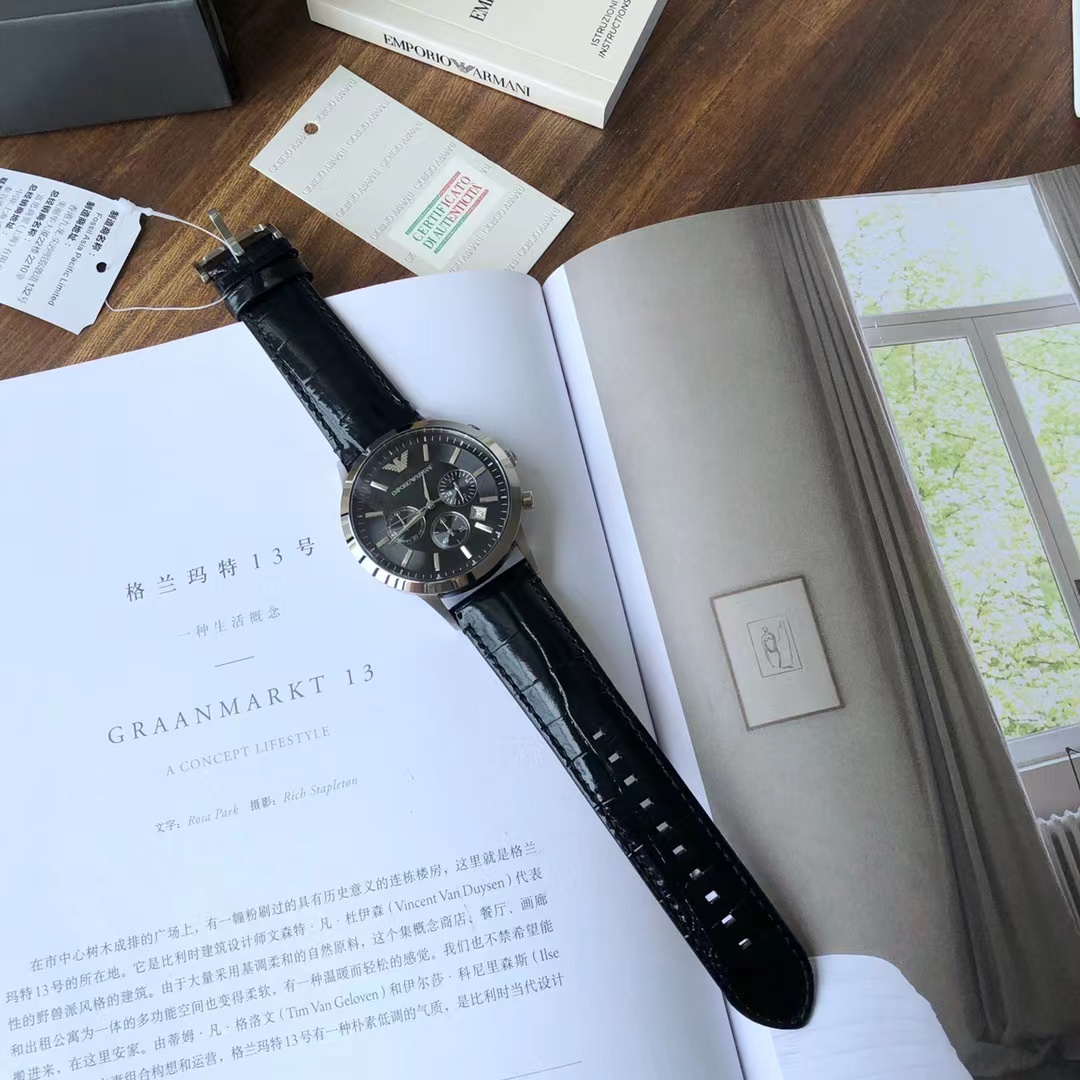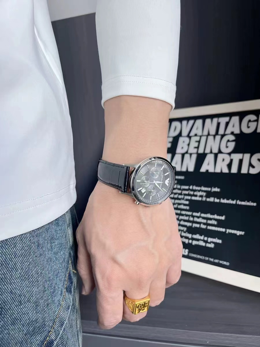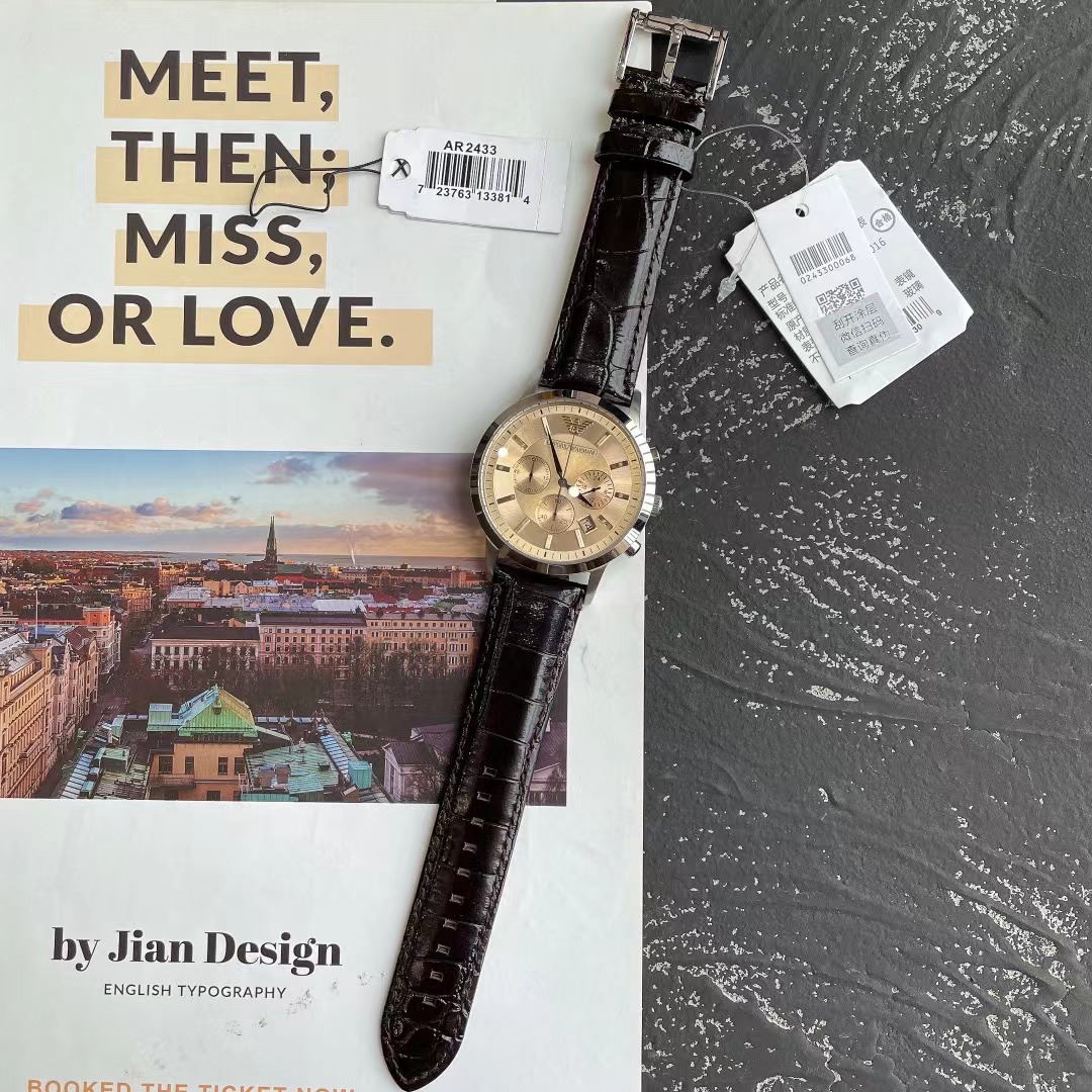 型号AR2432 潮流超酷手表 意大利风格牛皮皮带 计时石英男表 百搭经典配色 适合所有生活场景佩戴 尽显商务风范 直径43mm 休闲男士碗表 生活防水 圆形表盘 原装正品 支持专柜验货 配专柜全套包装