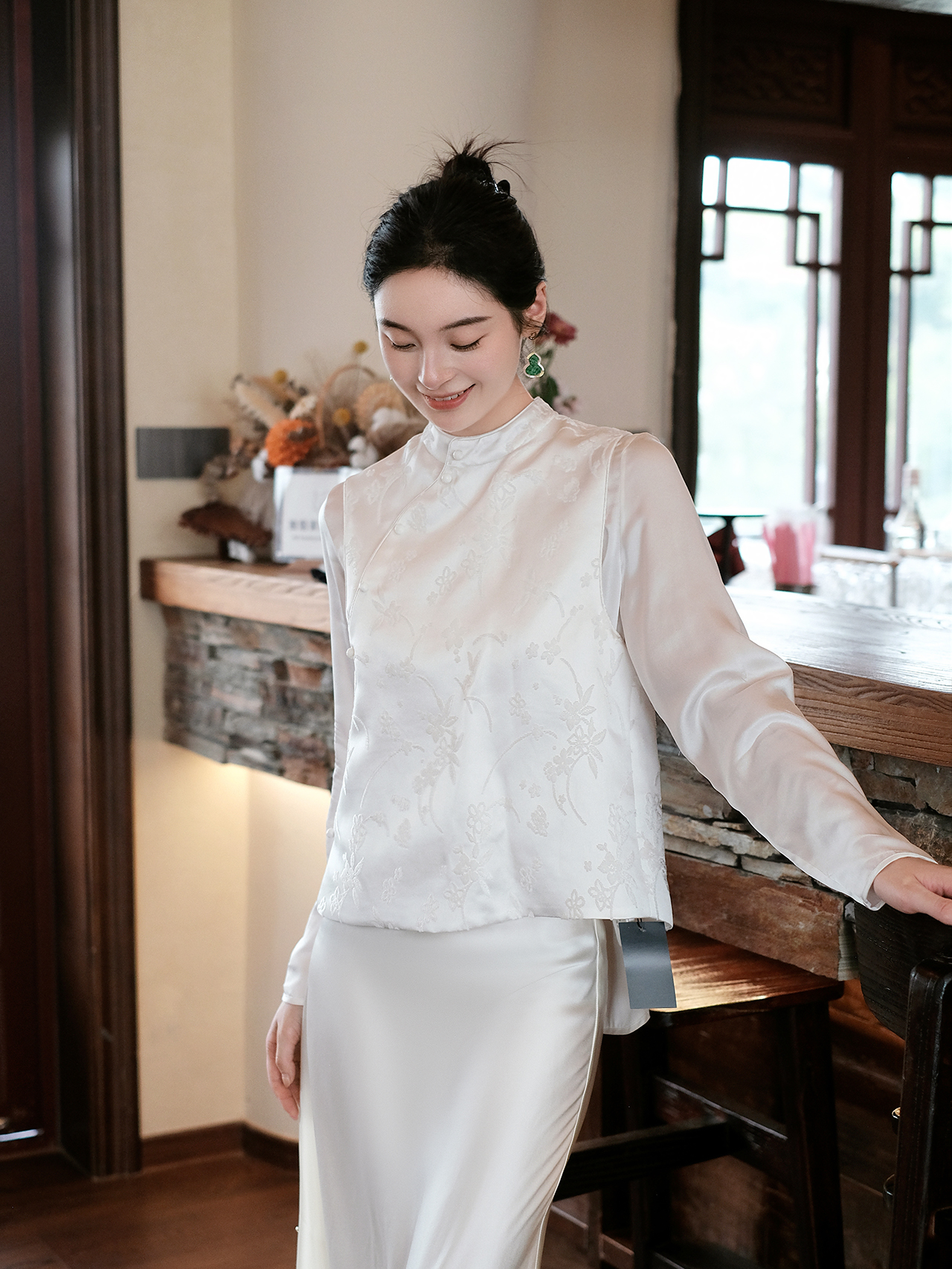 盛唐牡丹 |真丝提花梅兰竹菊偏襟上衣