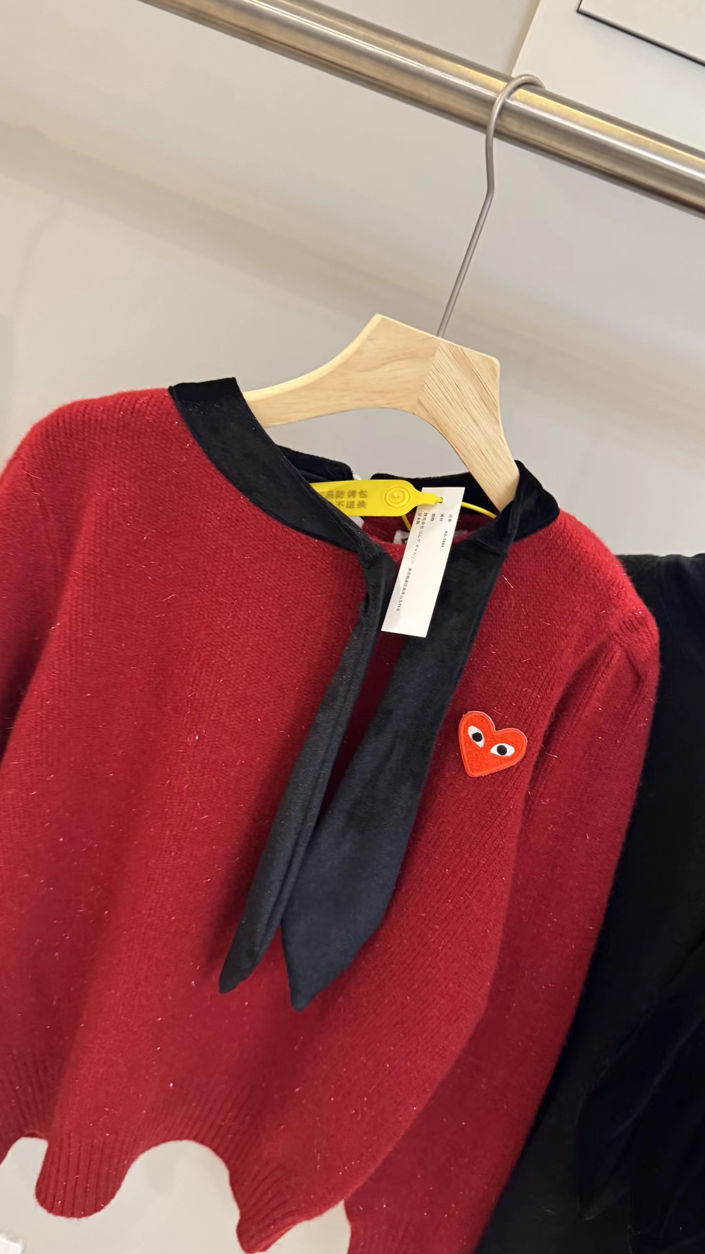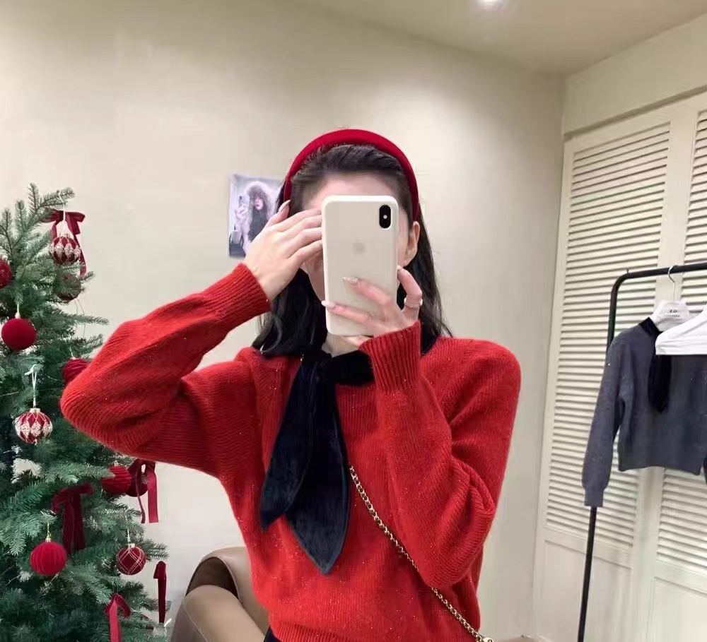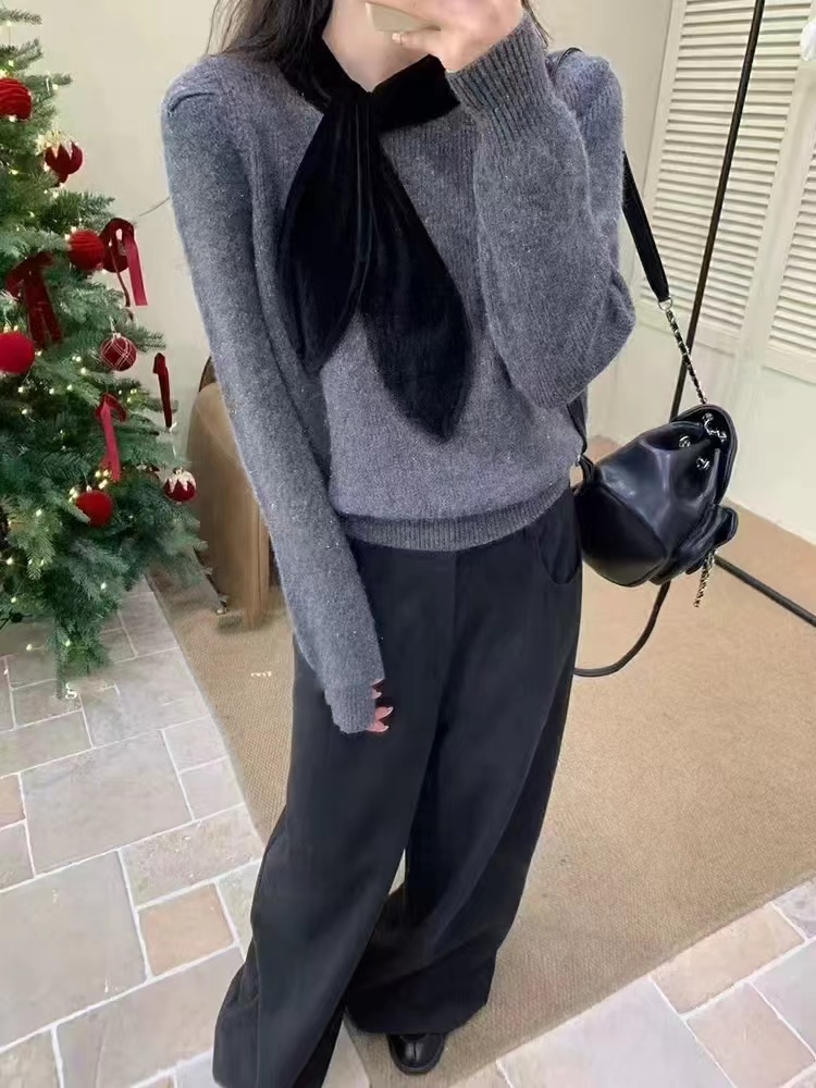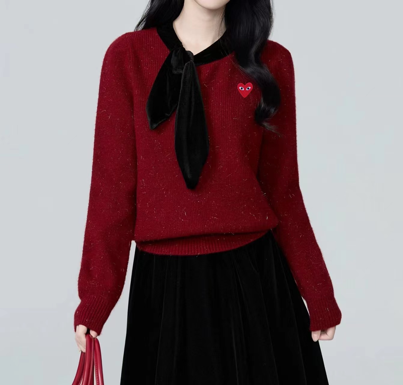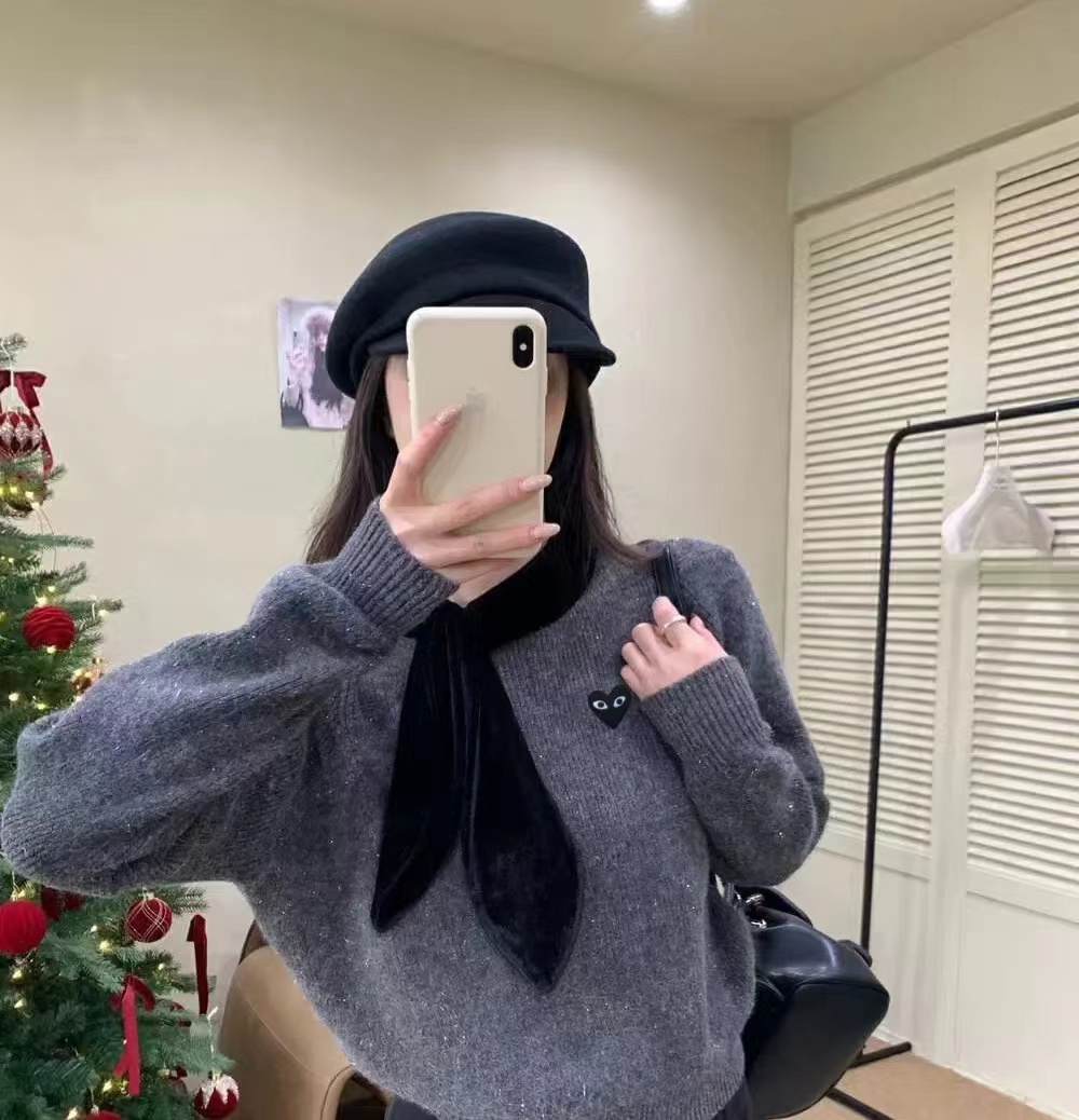温柔甜妹风|丝绒蝴蝶结针织毛衣,软糯亲肤的米白色针织,自带温柔滤镜,宽松版型藏肉显瘦,不挑身材。领口可拆卸丝绒大蝴蝶结,丝绒质感gao级,增添甜美氛围感,可拆卸设计一衣两穿。胸口jing致爱心小标点缀,简约不单调,细节感拉满。灯笼袖设计修饰手臂线条,温柔又减龄,日常通勤、约会都适配。宽松版型,领口搭配可拆卸黑色丝绒大蝴蝶结,胸口有爱心小标,灯笼袖设计,温柔甜美,百搭显瘦。