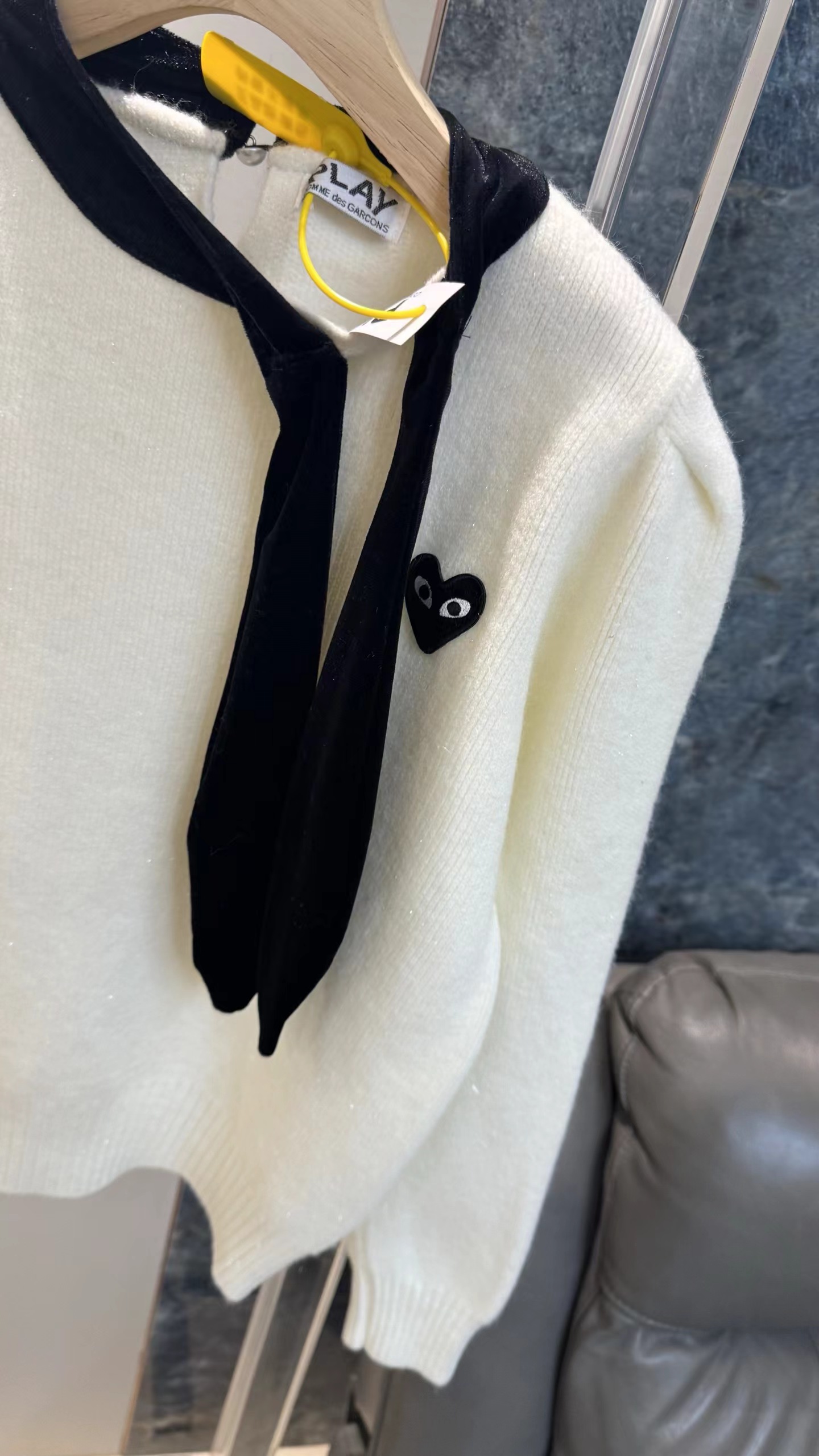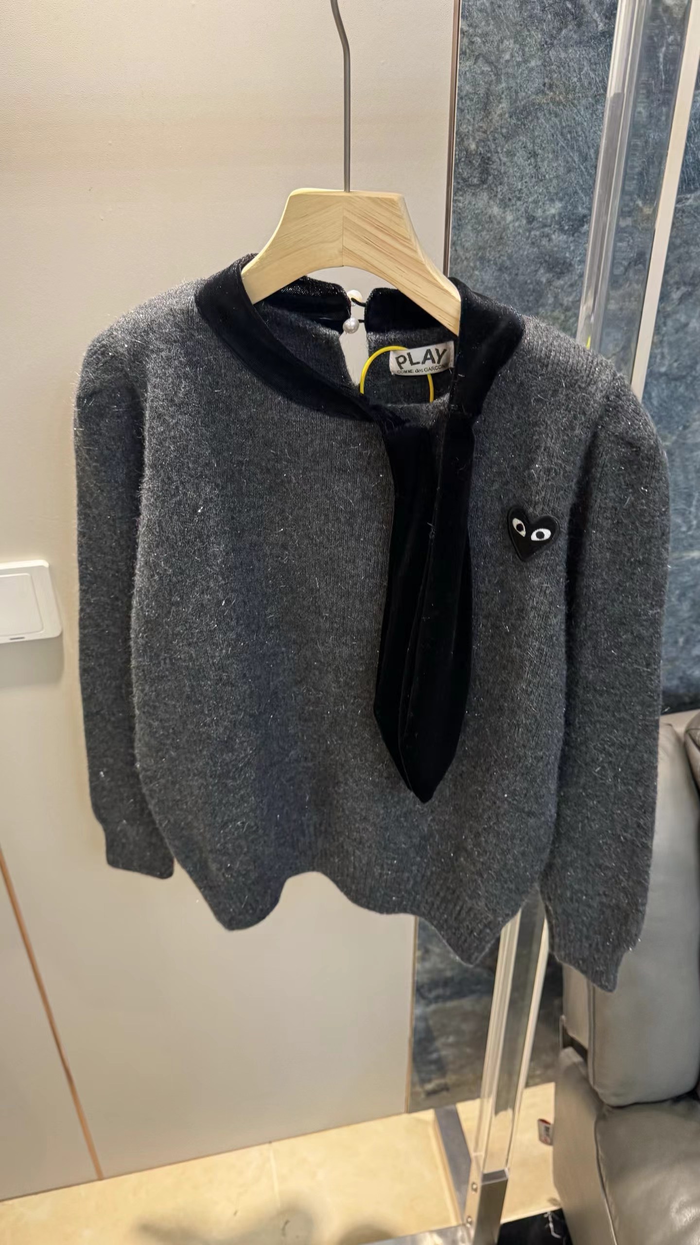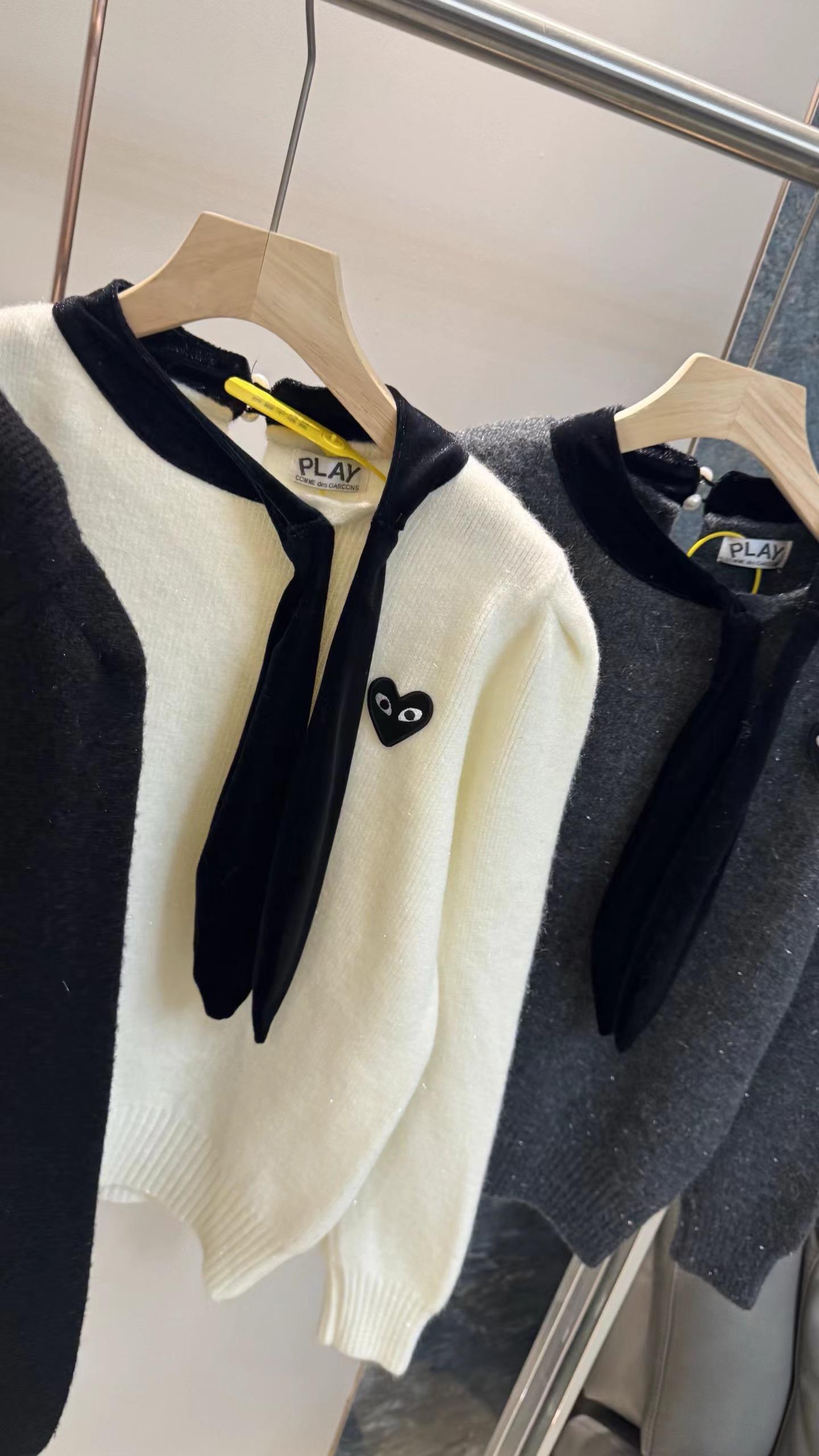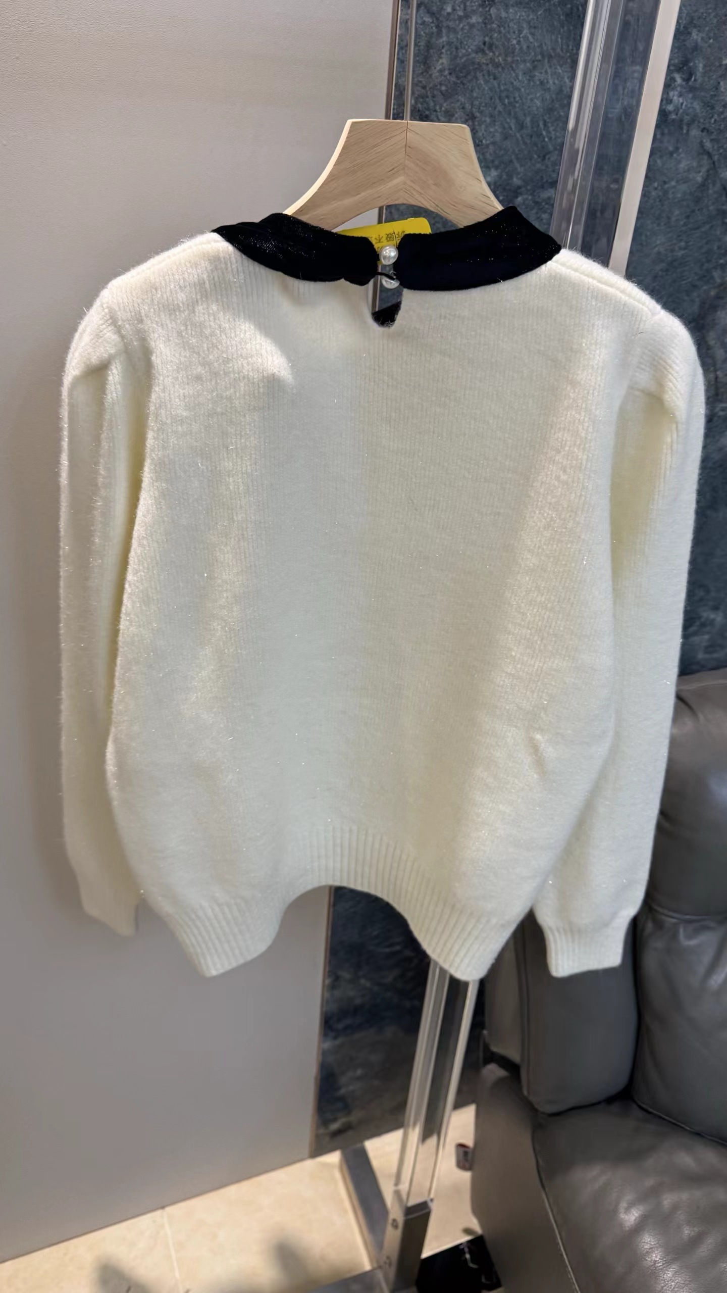 温柔甜妹风|丝绒蝴蝶结针织毛衣,软糯亲肤的米白色针织,自带温柔滤镜,宽松版型藏肉显瘦,不挑身材。领口可拆卸丝绒大蝴蝶结,丝绒质感gao级,增添甜美氛围感,可拆卸设计一衣两穿。胸口jing致爱心小标点缀,简约不单调,细节感拉满。灯笼袖设计修饰手臂线条,温柔又减龄,日常通勤、约会都适配。宽松版型,领口搭配可拆卸黑色丝绒大蝴蝶结,胸口有爱心小标,灯笼袖设计,温柔甜美,百搭显瘦。