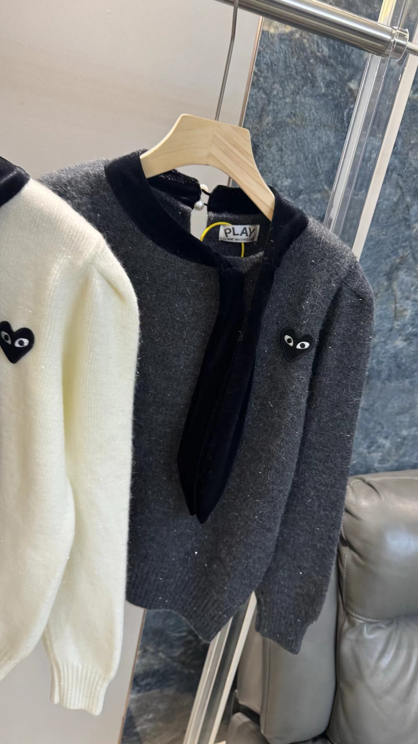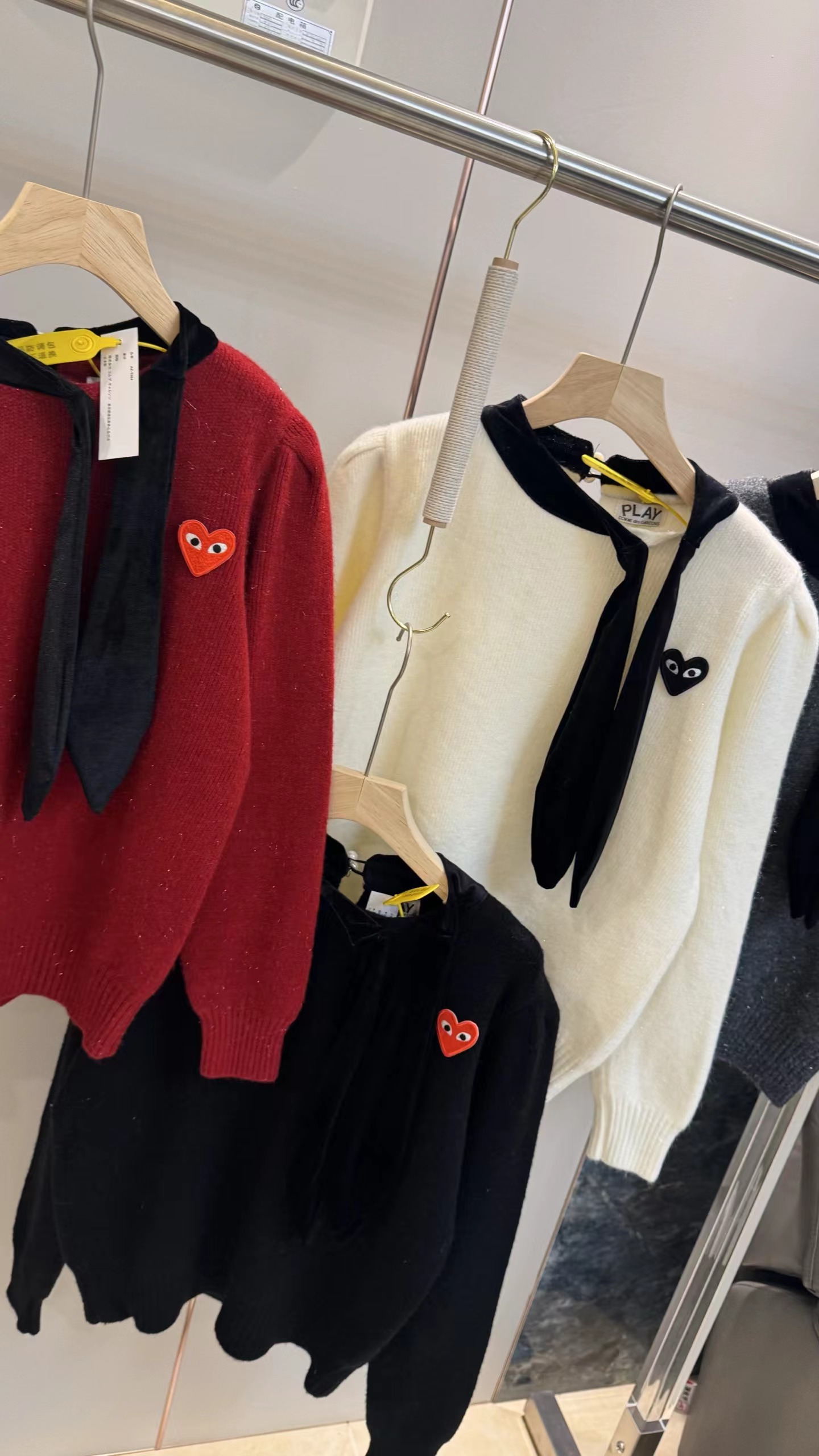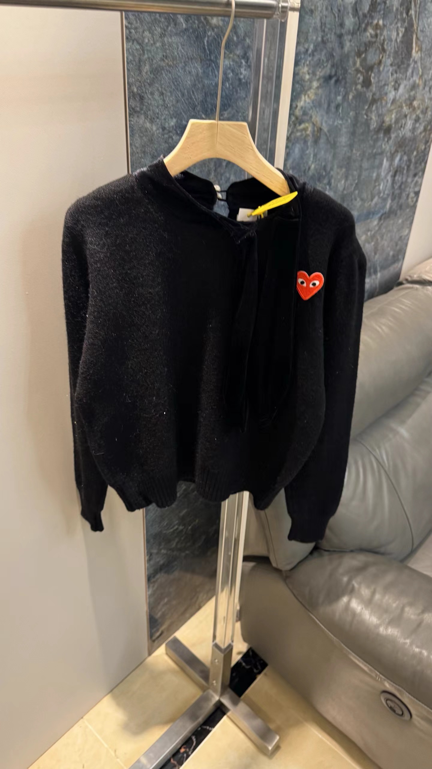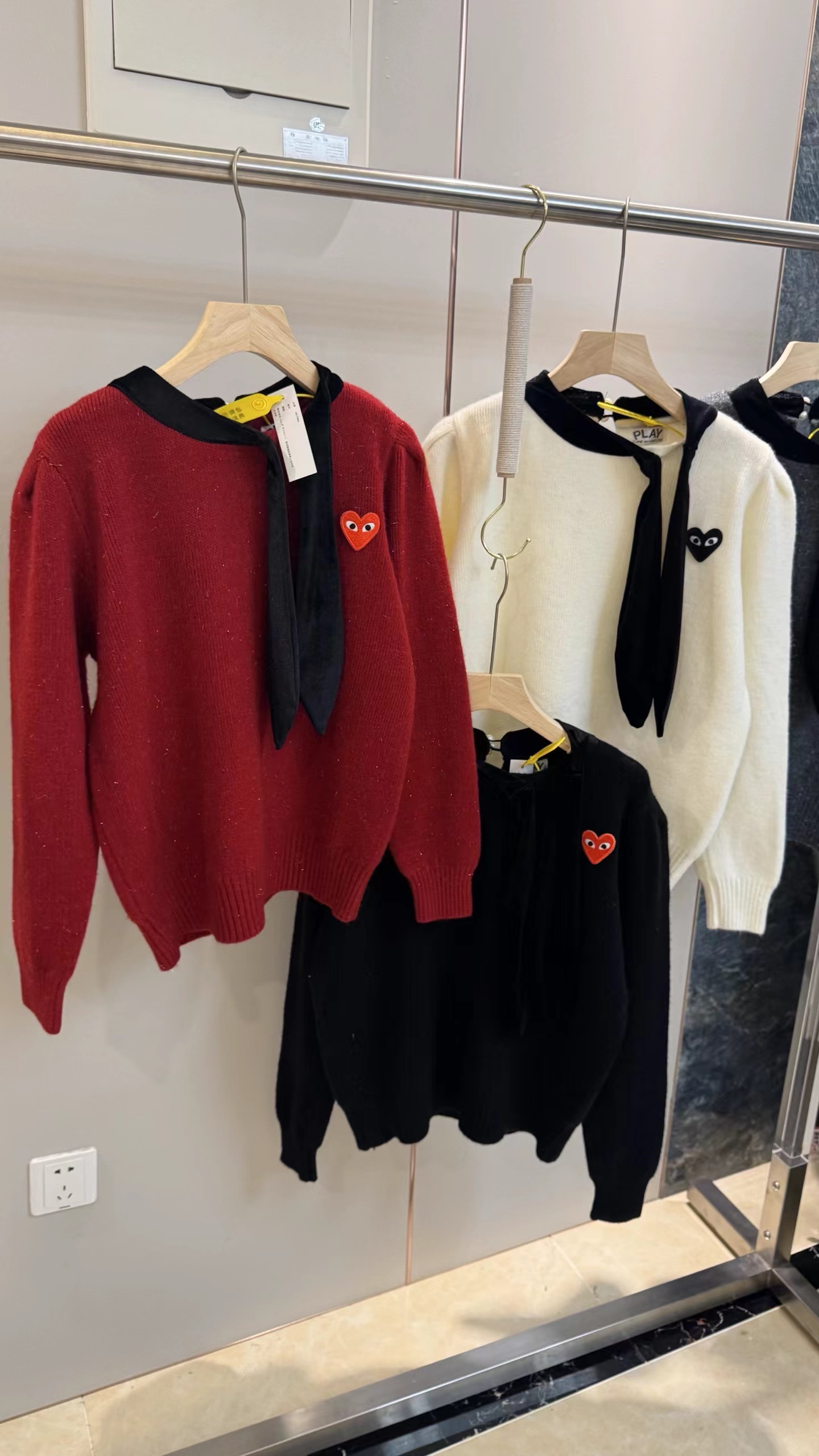 温柔甜妹风|丝绒蝴蝶结针织毛衣,软糯亲肤的米白色针织,自带温柔滤镜,宽松版型藏肉显瘦,不挑身材。领口可拆卸丝绒大蝴蝶结,丝绒质感gao级,增添甜美氛围感,可拆卸设计一衣两穿。胸口jing致爱心小标点缀,简约不单调,细节感拉满。灯笼袖设计修饰手臂线条,温柔又减龄,日常通勤、约会都适配。宽松版型,领口搭配可拆卸黑色丝绒大蝴蝶结,胸口有爱心小标,灯笼袖设计,温柔甜美,百搭显瘦。