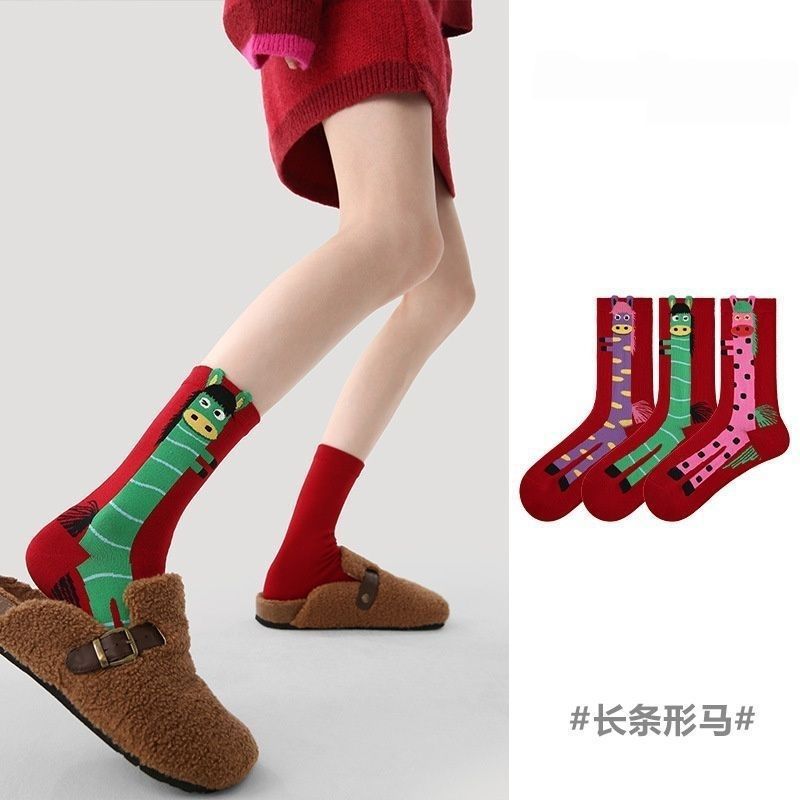 【马年2026本命年❗️冬季新款红袜子】福星高照,把好运穿在身上,双针刺绣男女同款大红袜子马年本命年中筒袜好运袜L