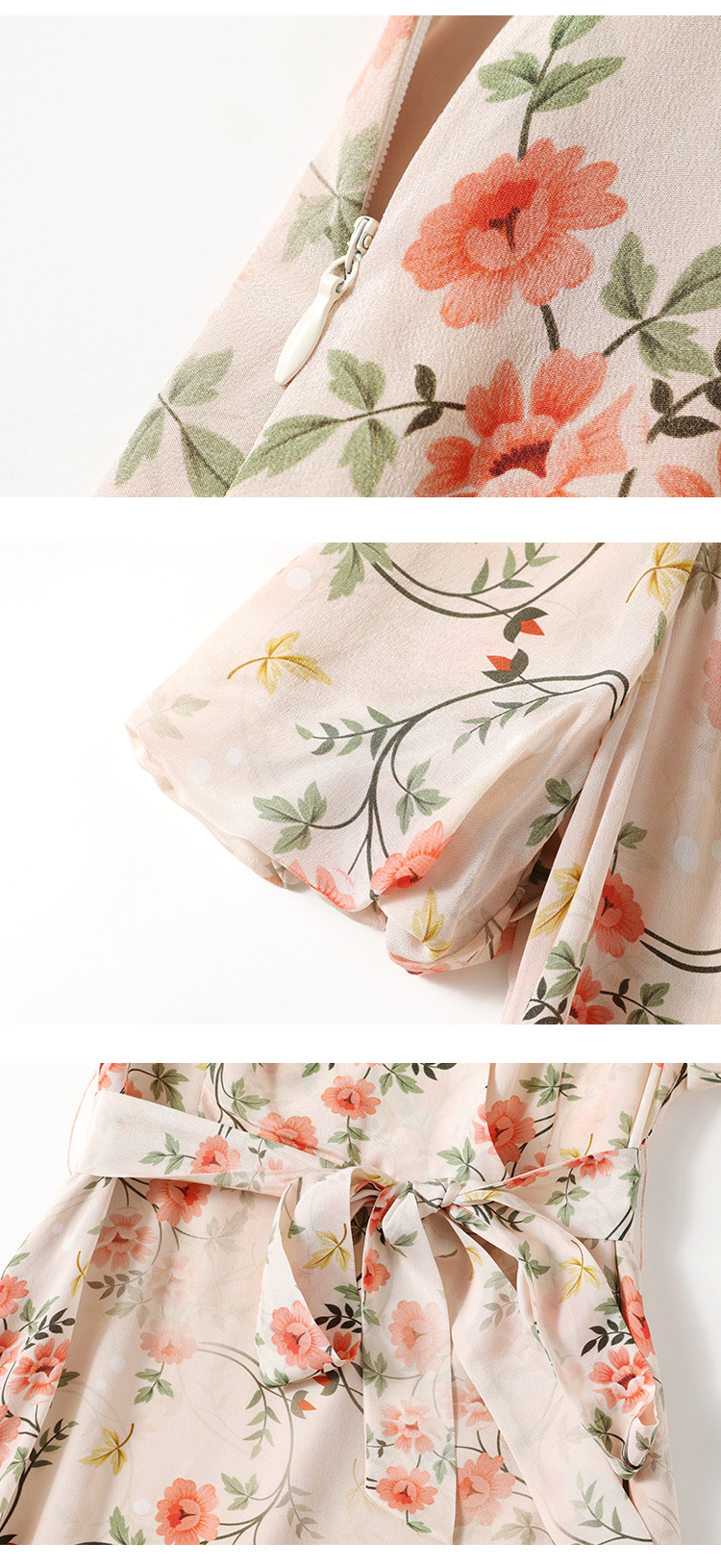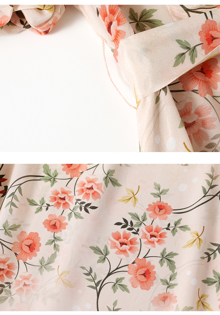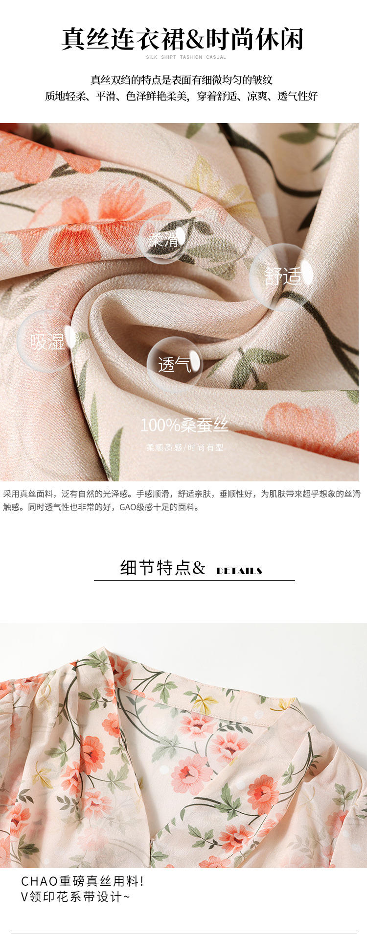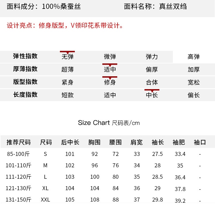 100%桑蚕丝,泛有自然的光泽感。手感顺滑,舒适亲肤,垂顺性好,为肌肤带来超乎想象的丝滑触感,花色柔美雅致提肤色。有内衬一点都不透,小花苞袖筒更包容双臂。