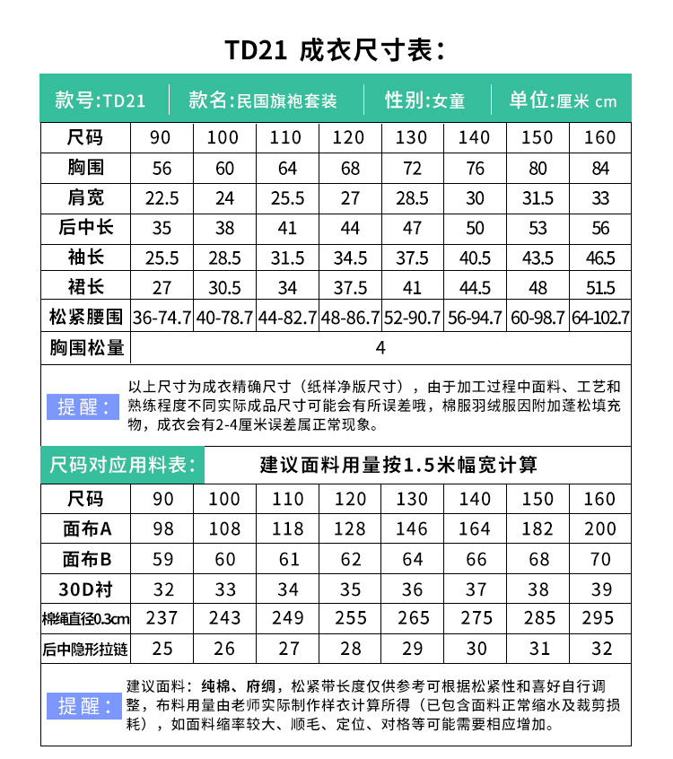 裁缝学苑 TD21女童民国旗袍套装1:1实物服装纸样剪裁图纸牛皮纸样