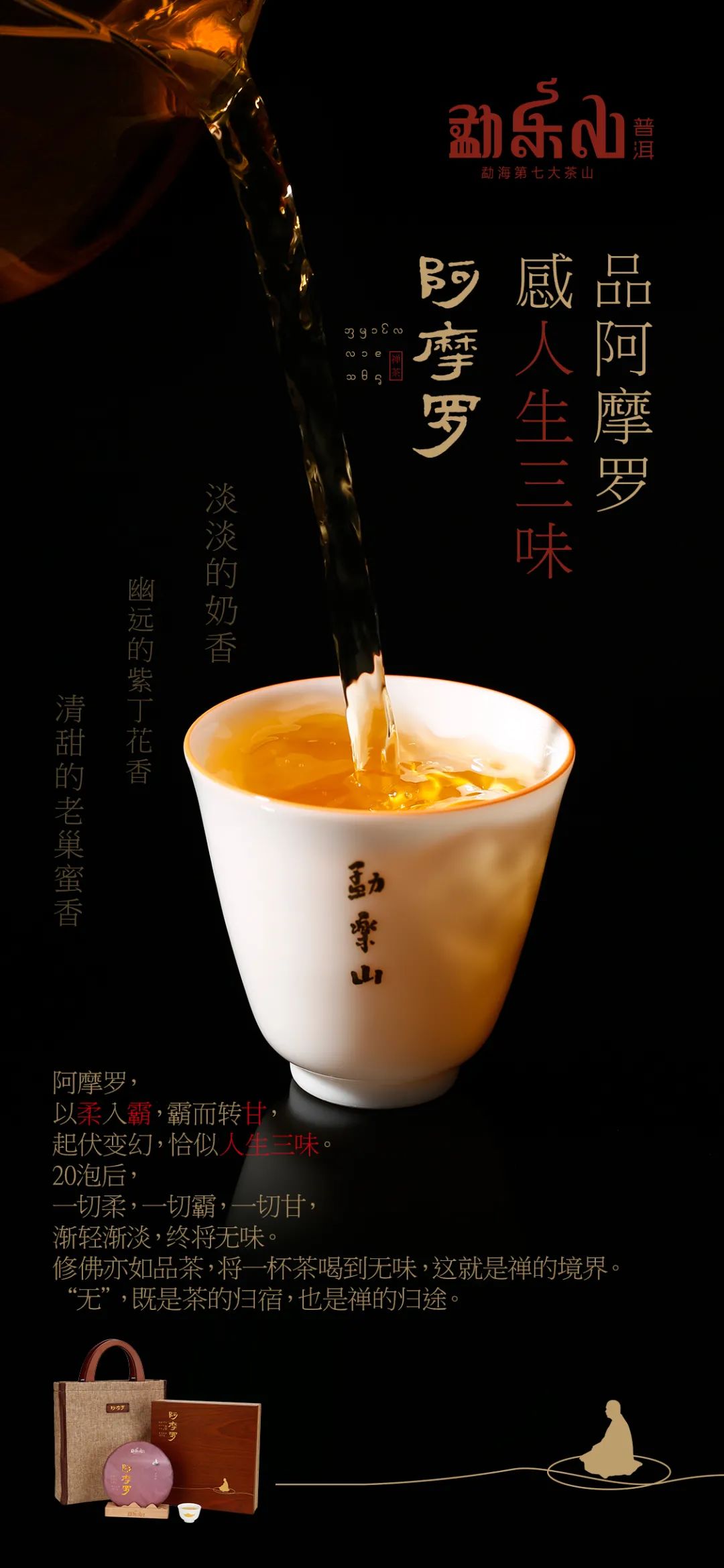 勐乐山·阿摩罗,生于茶叶乐土勐海。你能从一杯茶汤之中,汲取山河之灵气、沐浴天地之风华。茶性洁净,予人悟道,与禅宗提倡的“明心见性,直指人心”的顿悟观有着天然契合。