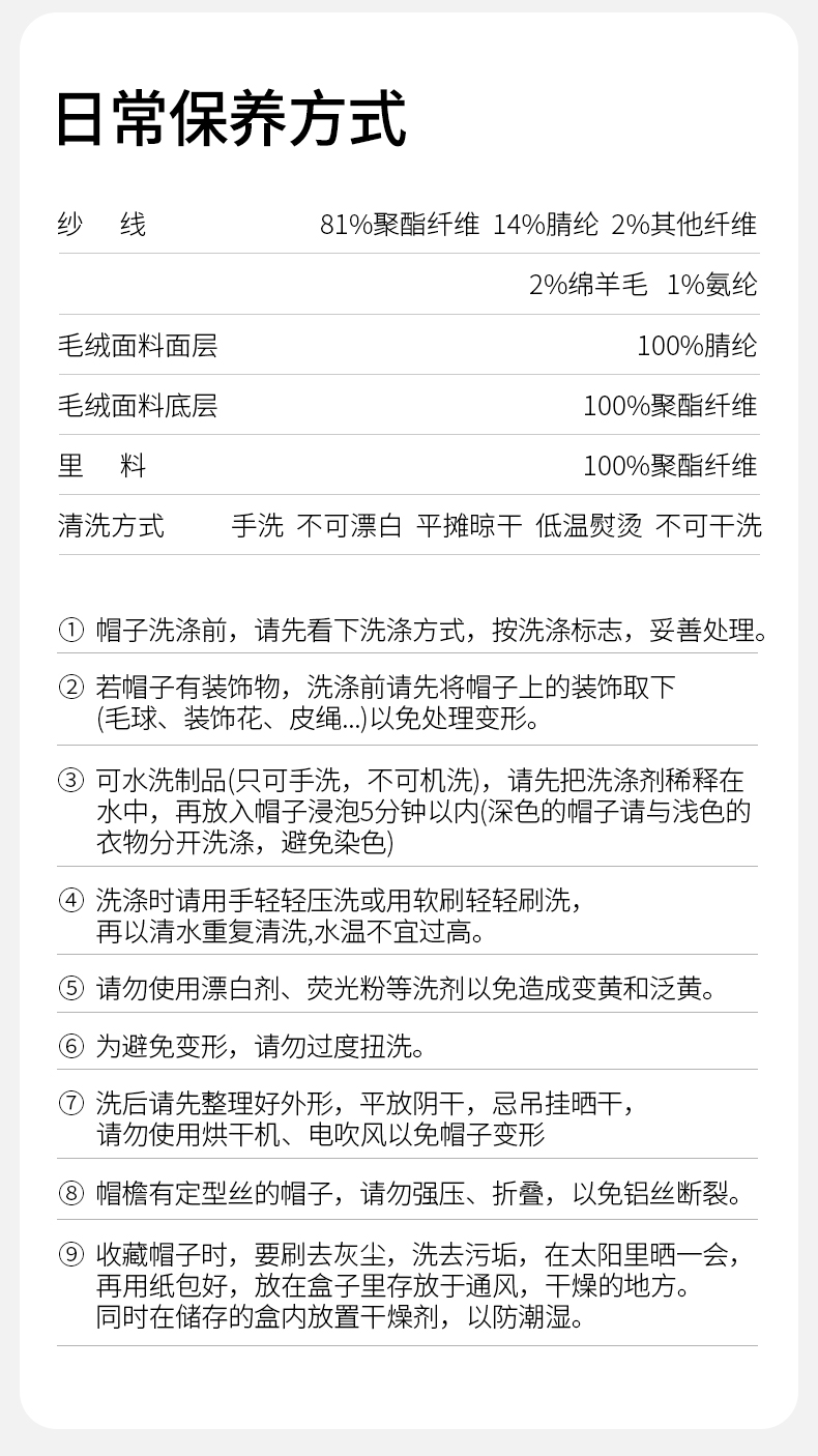 【其他注意事项】注意帽子的洗涤方式,每顶帽子都有吊牌