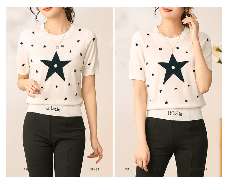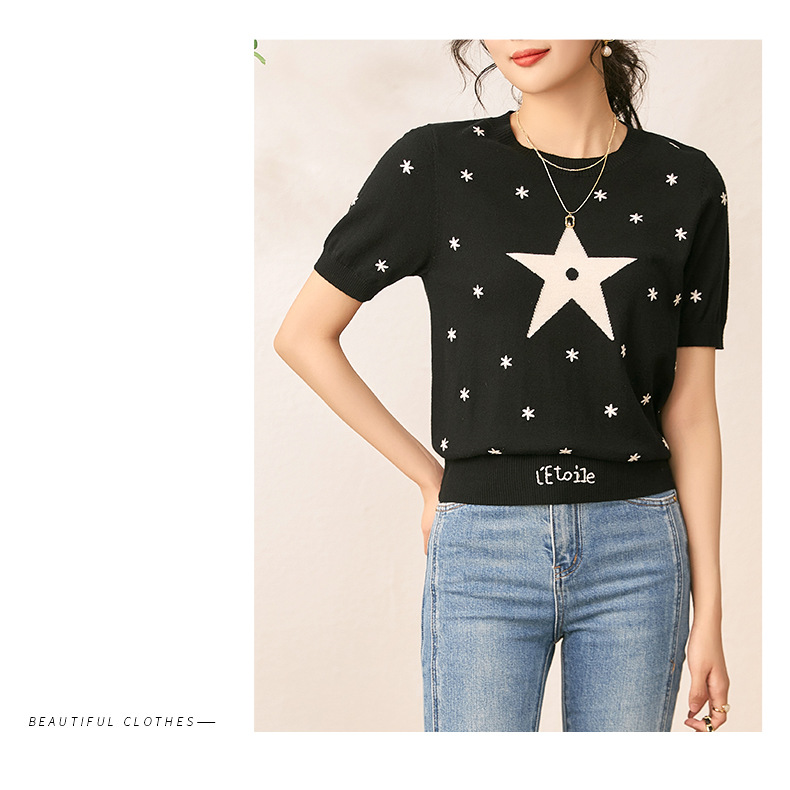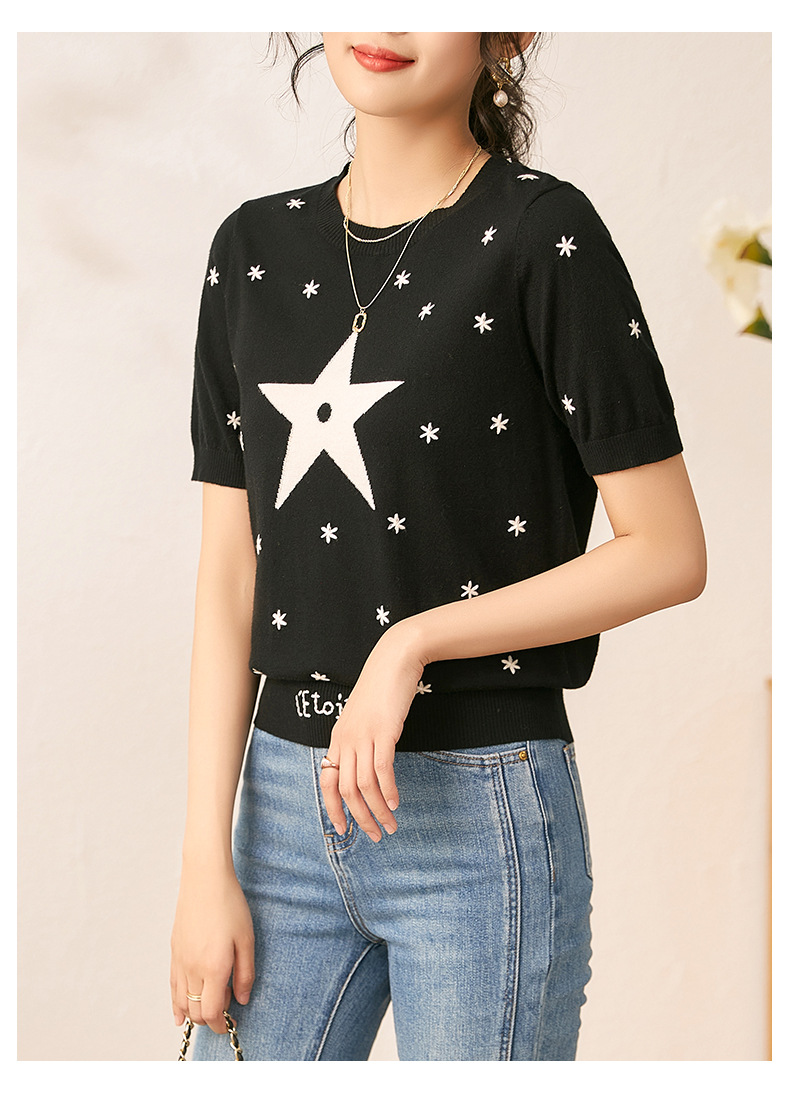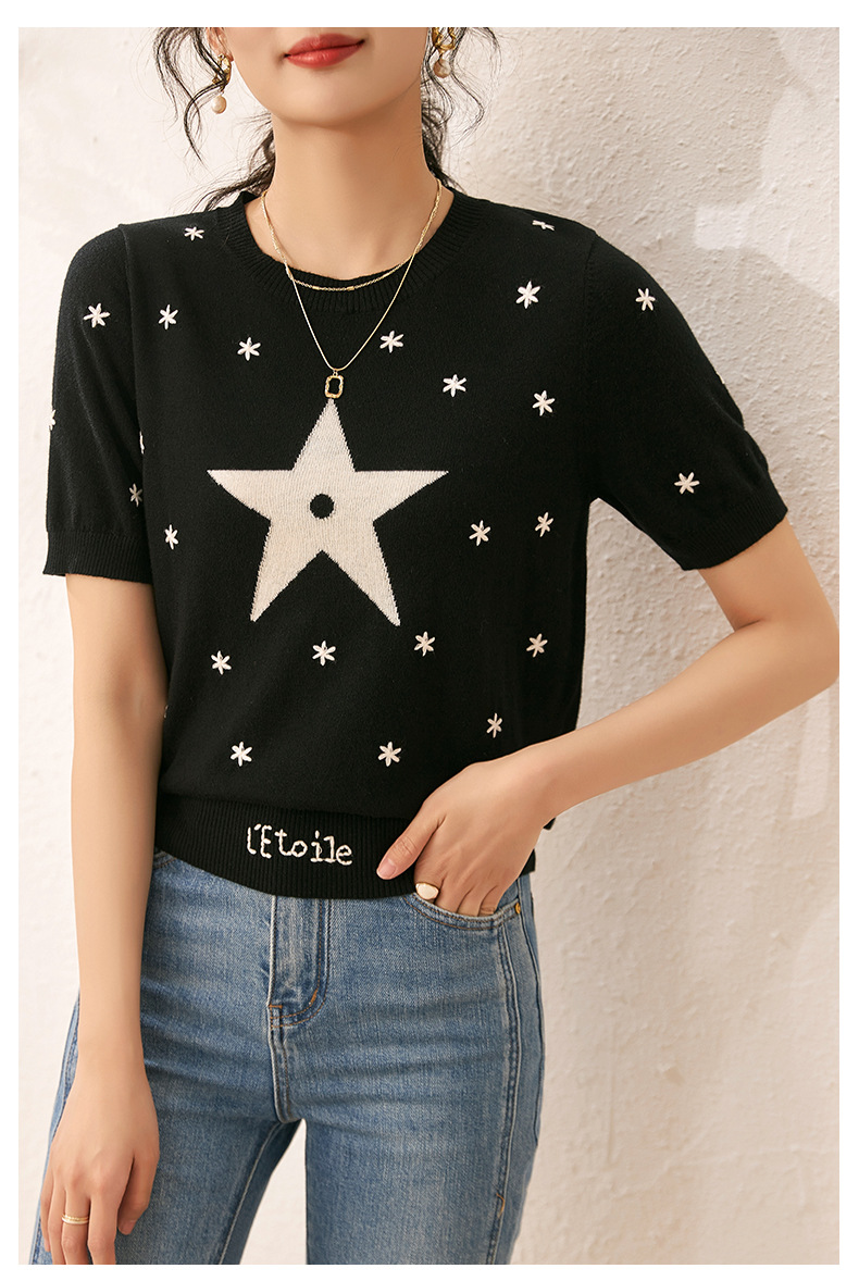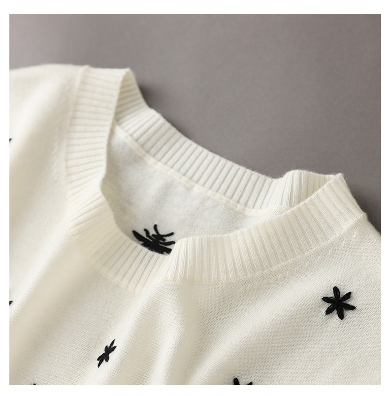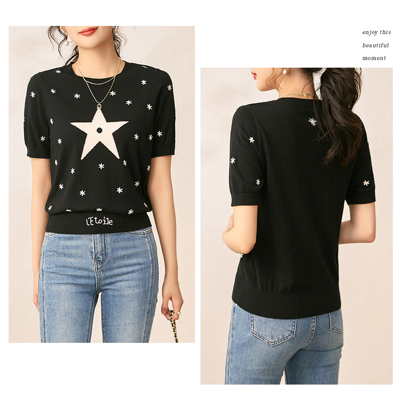薄款短袖T恤上衣,休闲遮肉女轻奢绣花羊毛针织衫WLZD-2302210
