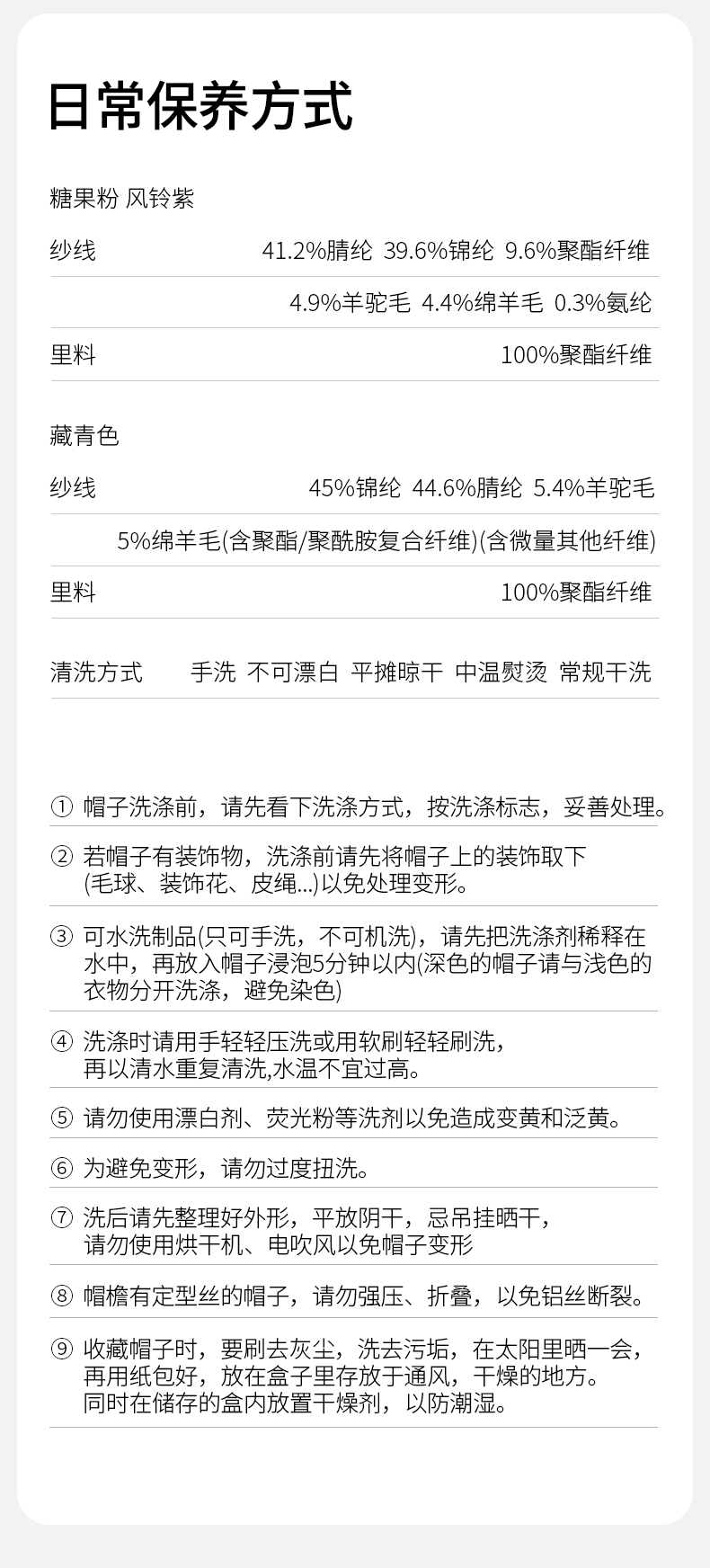 【其他注意事项】注意帽子的洗涤方式,每顶帽子都有吊牌