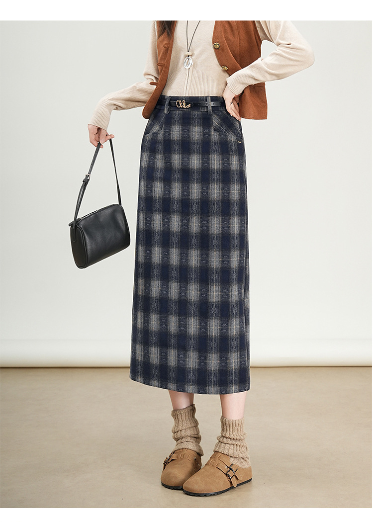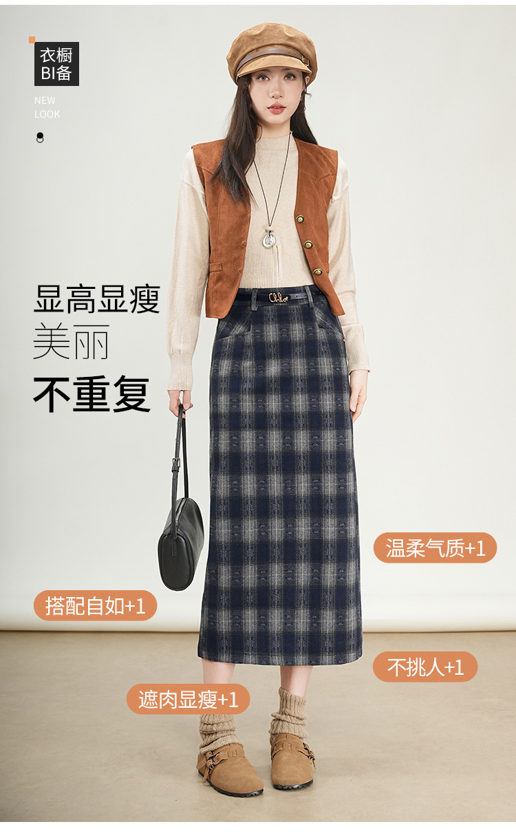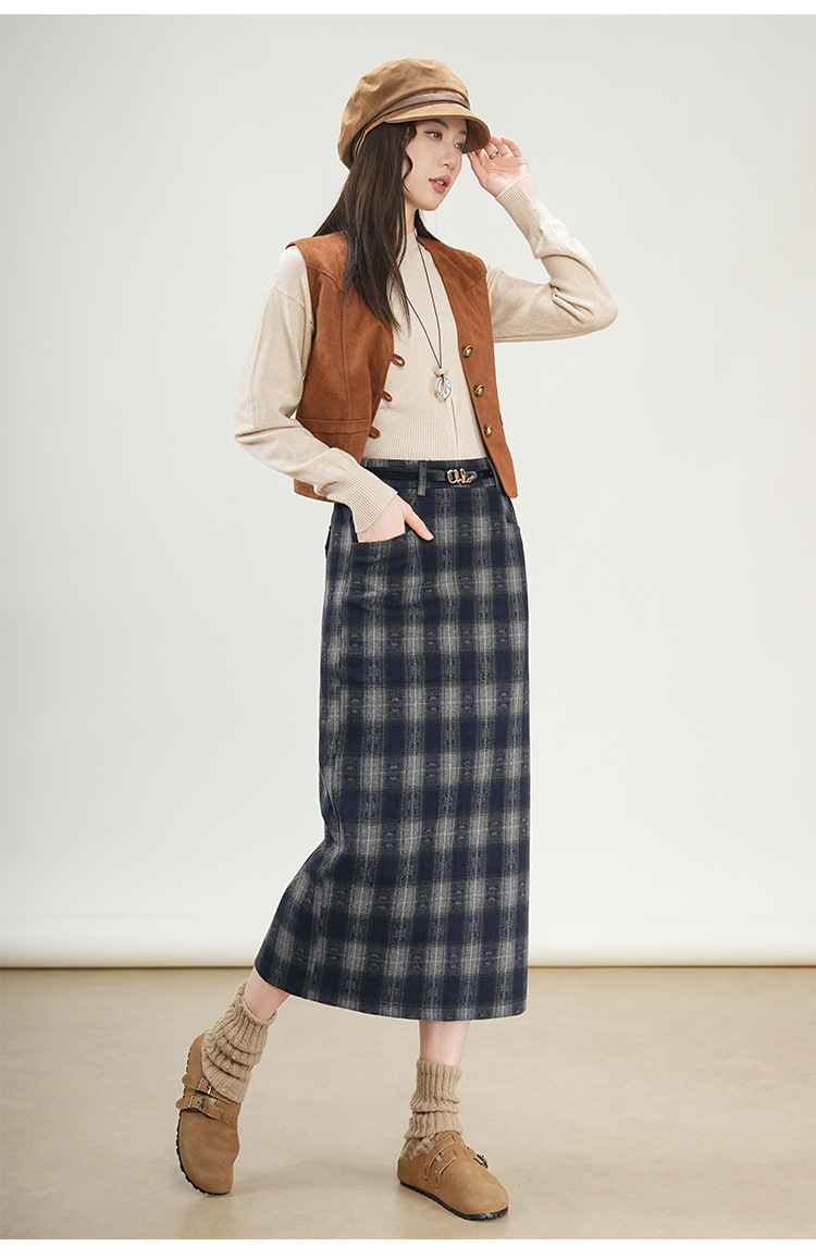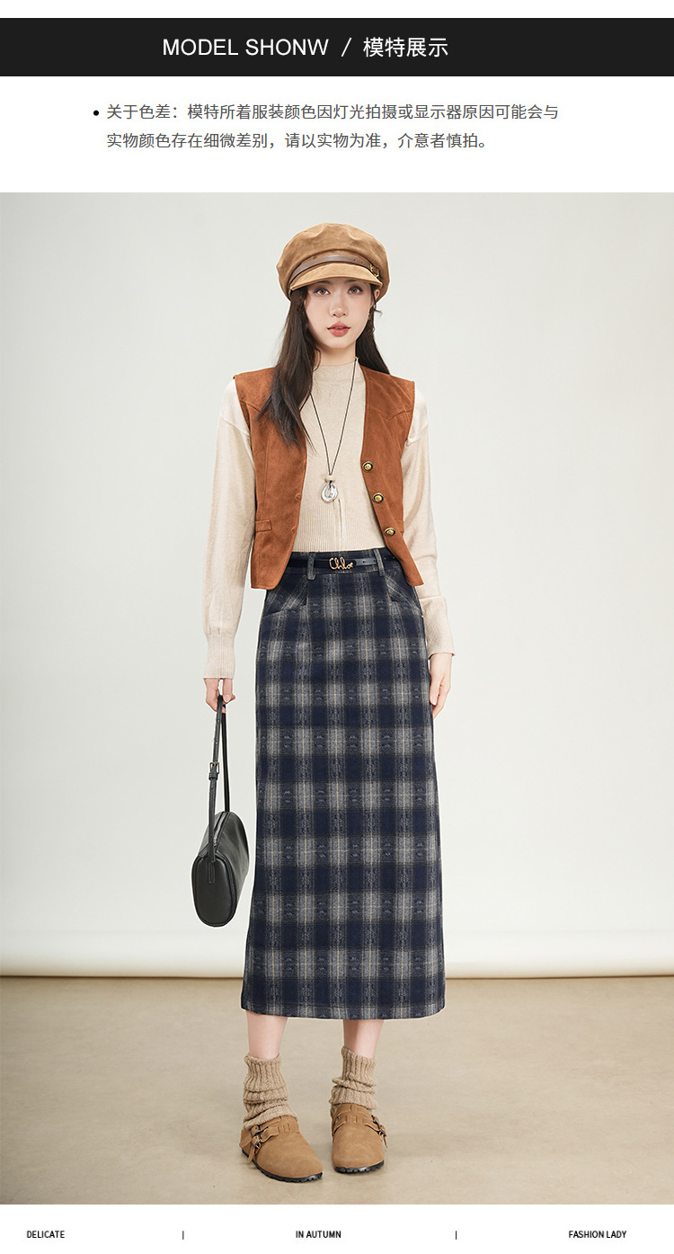 QYM 95837-Y格子直筒半身裙高腰开衩一步裙包臀裙 商品图3