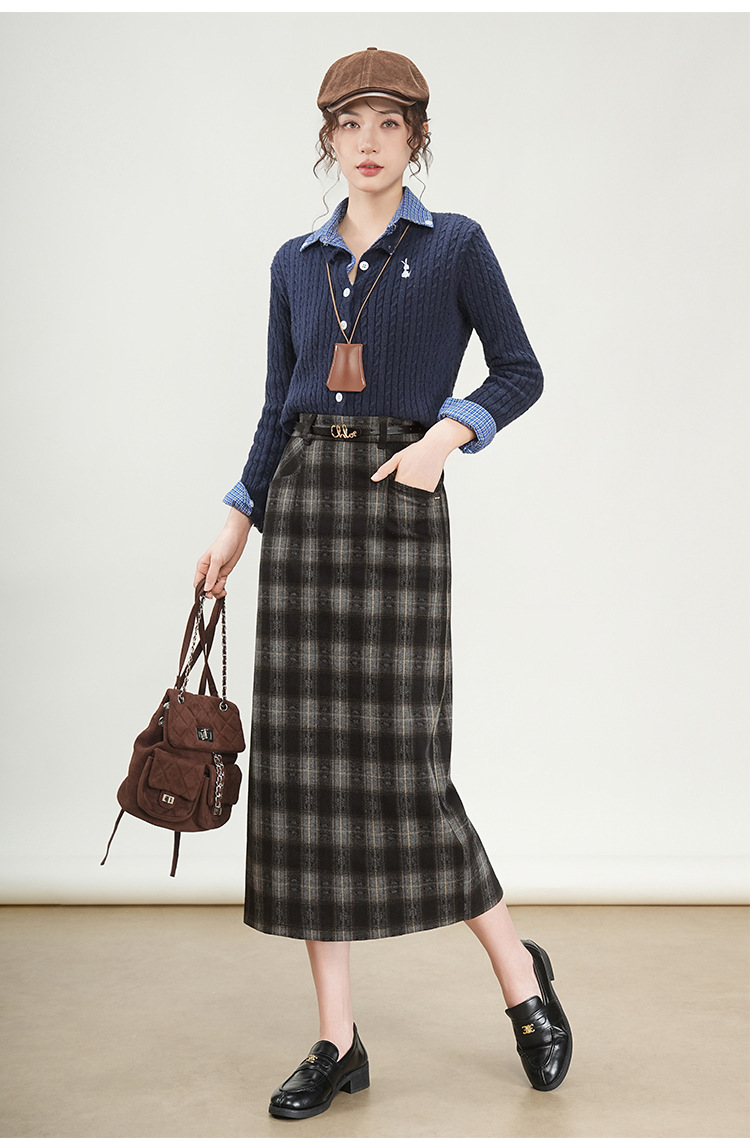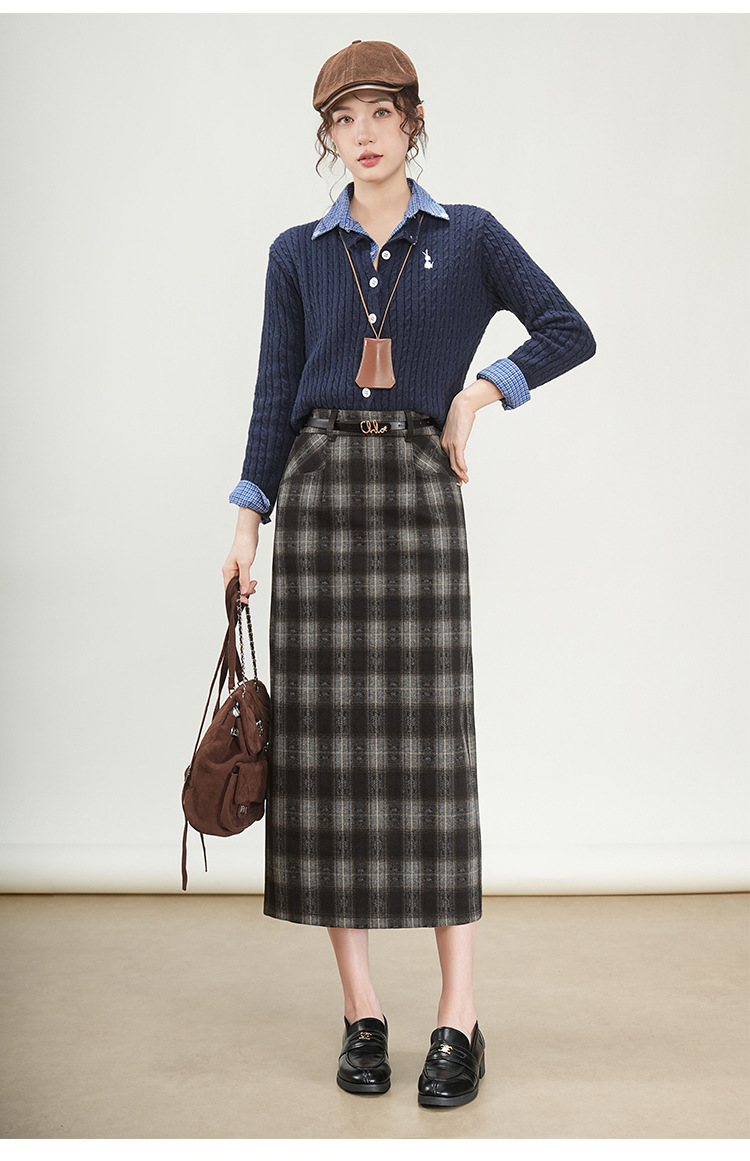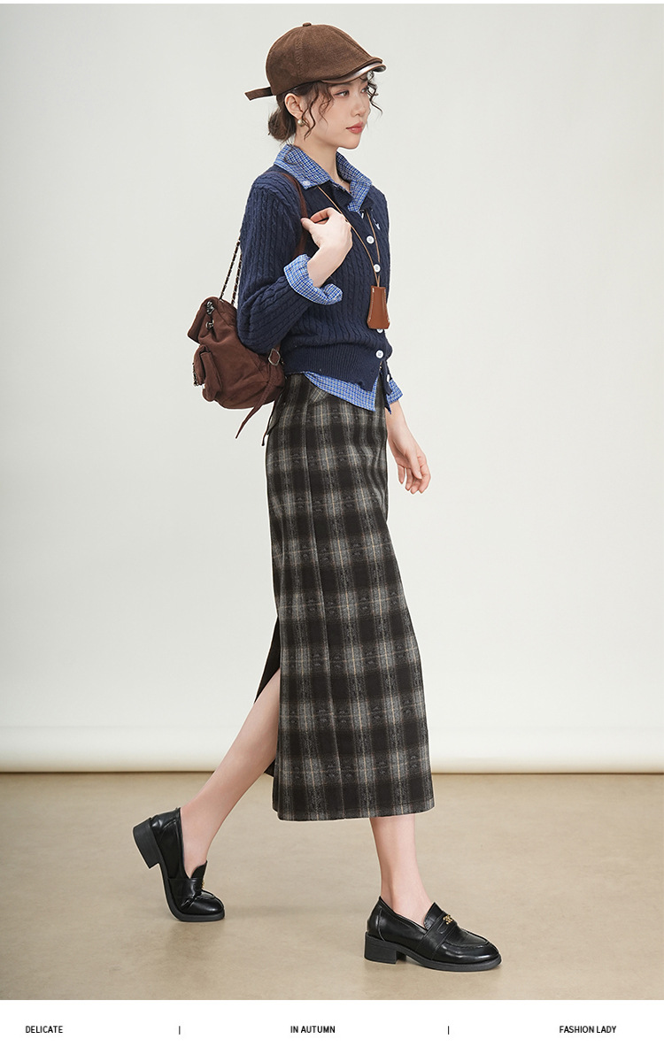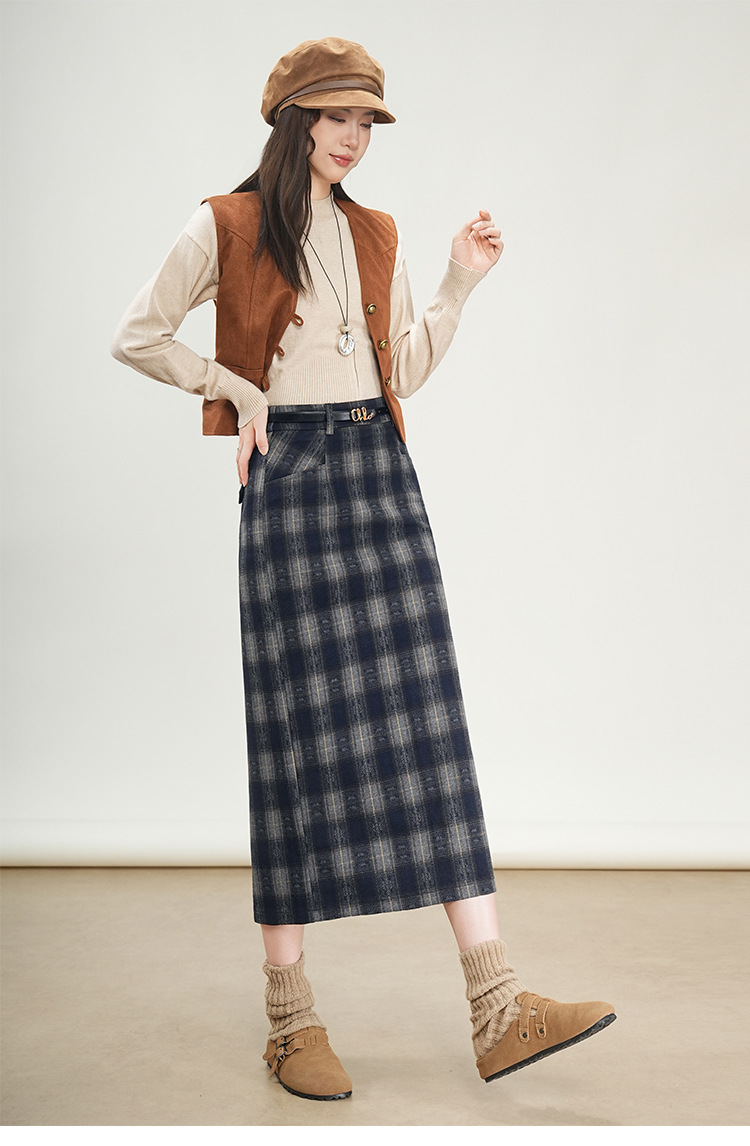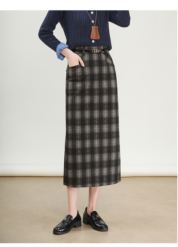 QYM 95837-Y格子直筒半身裙高腰开衩一步裙包臀裙 商品图1