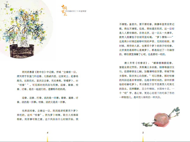 这本书中的二十四节气,写的主要是北京以及北方的情景。但配以南方画家小林的插图,墨渍水晕,尽显南方风情。这也吻合了中国的幅员辽阔,同样的二十四节气,南北两地所呈现的民俗风物不尽相同。