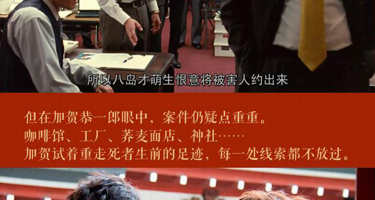 但在刑警加贺眼中,这个案子还有疑点:为什么青柳被刺后没有呼救,却带着胸口的刀走了十分钟,得来到麒麟像下?凶手的动机又是什么?在加贺几乎让同事都受不了的执着努力下,事态渐渐出现了惊人转折。