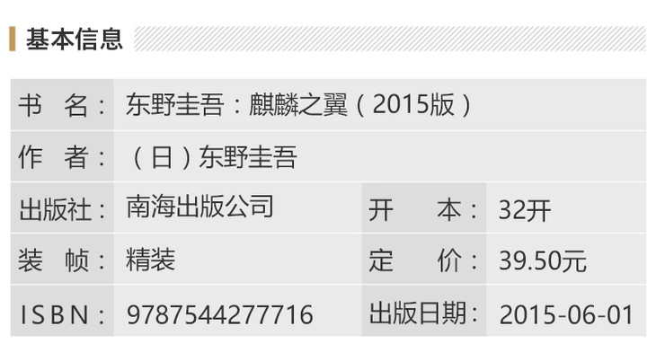 《麒麟之翼》内容简介:推理天王东野圭吾长篇小说,“加贺探案集”第九案,东野圭吾认为《麒麟之翼》是加贺探案集*杰作。。