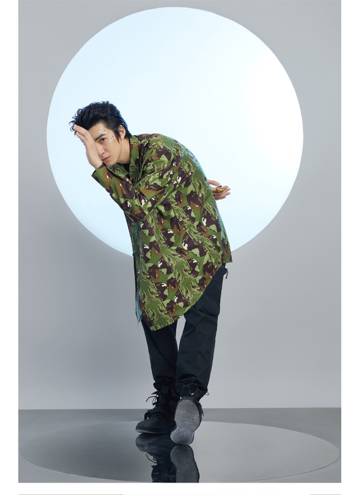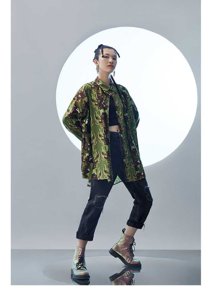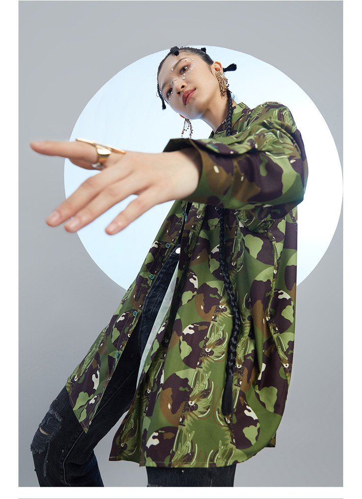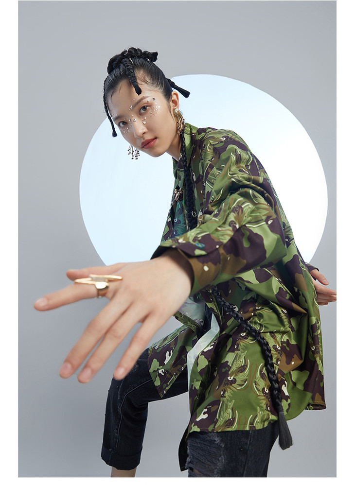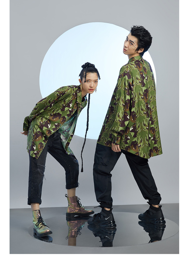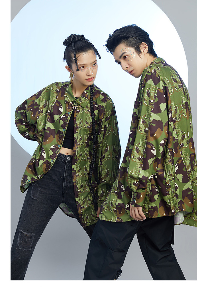 混沌亚宙MUA绿迷彩龙男女同款oversize宽松印花衬衫#此商品参加第十一届北京惠民文化消费季