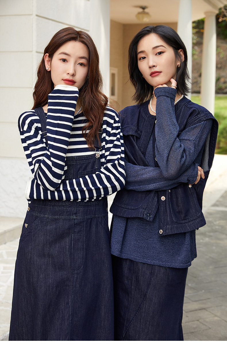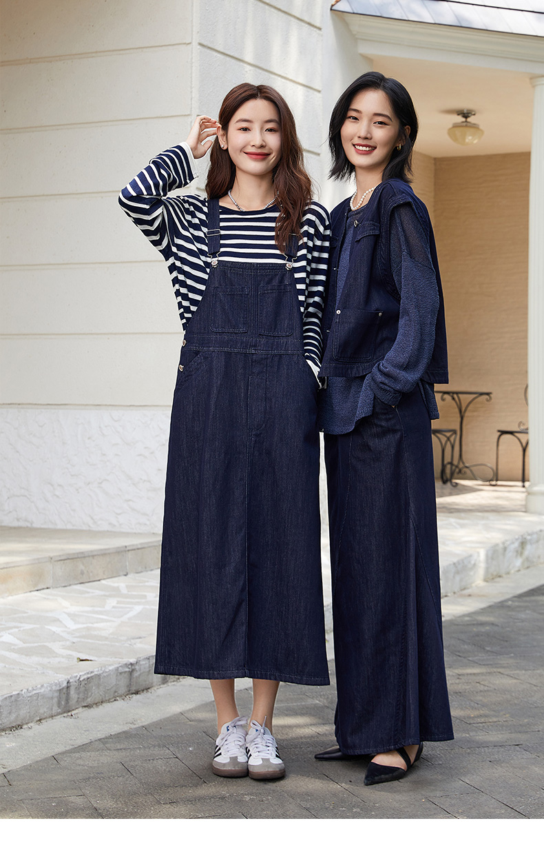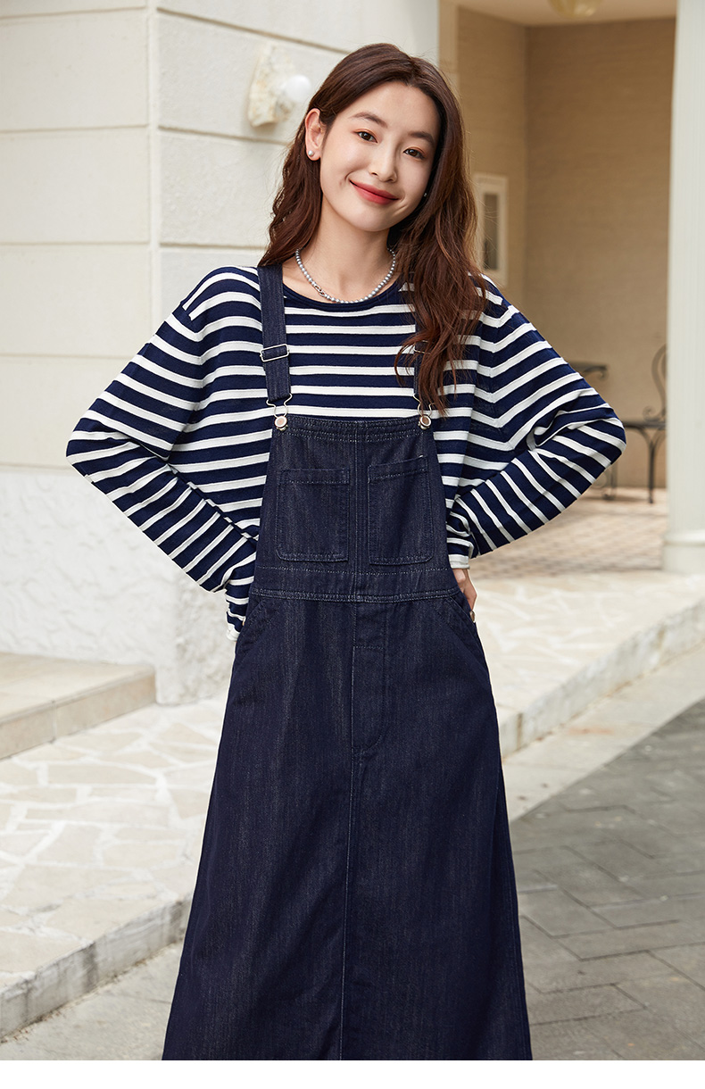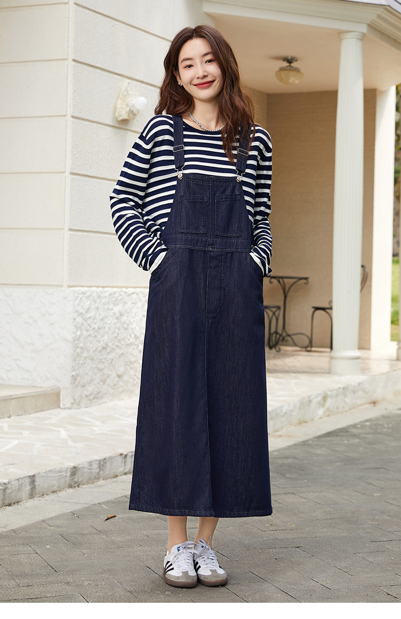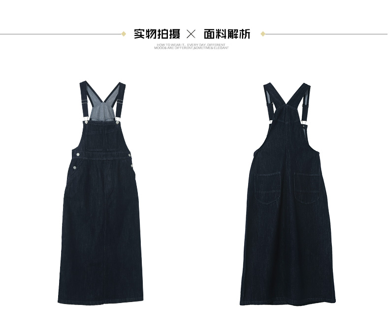 复古回潮!深蓝色牛仔背带裙 交叉背带 减龄长款连衣裙