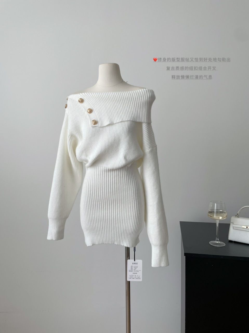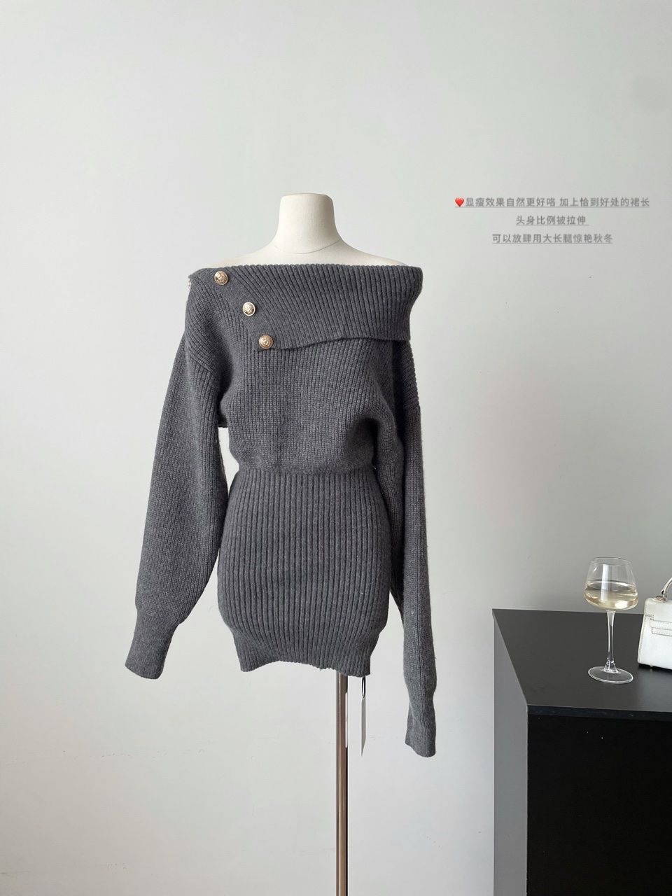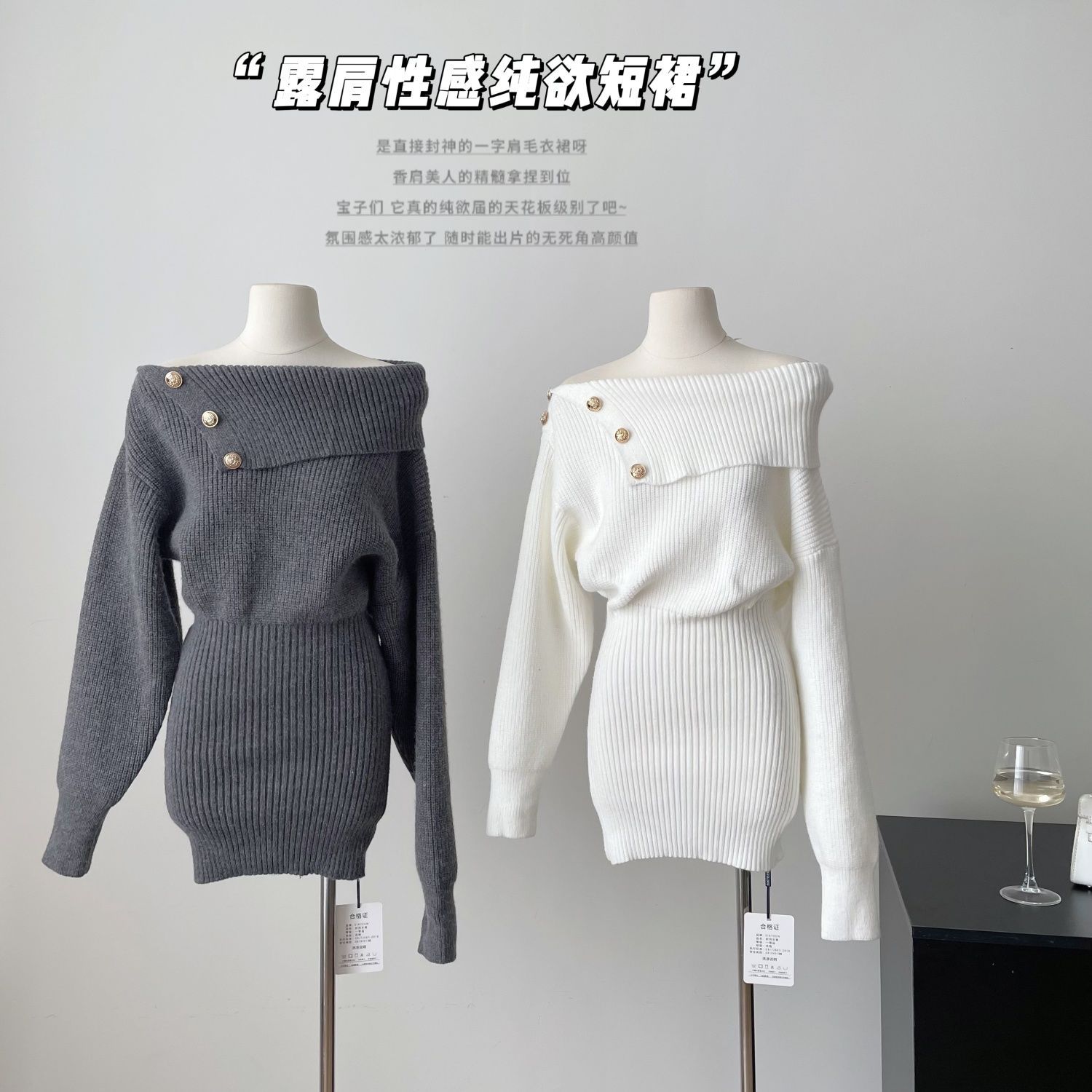 【亲肤保暖舒适❗️时尚简约百搭】纯欲风斜肩长袖针织连衣裙女春季修身灰色短裙显身材收腰包臀裙子。jc