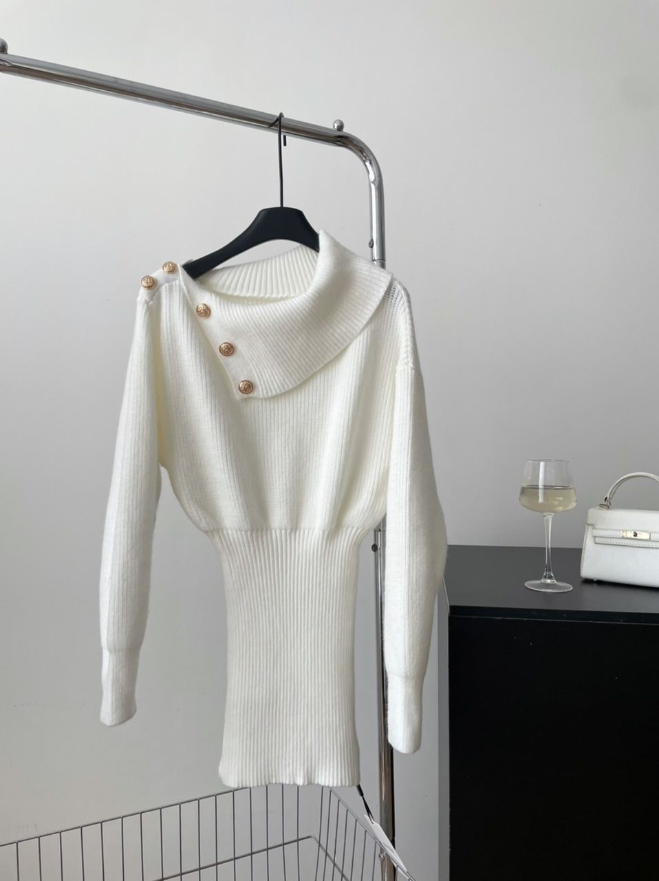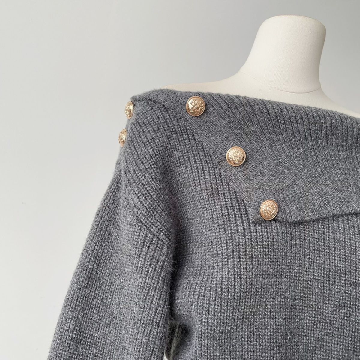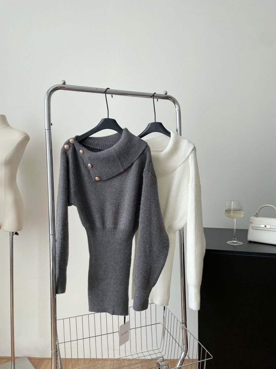 【亲肤保暖舒适❗️时尚简约百搭】纯欲风斜肩长袖针织连衣裙女春季修身灰色短裙显身材收腰包臀裙子。jc