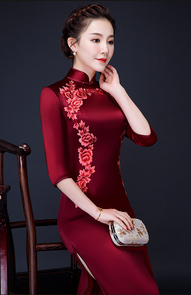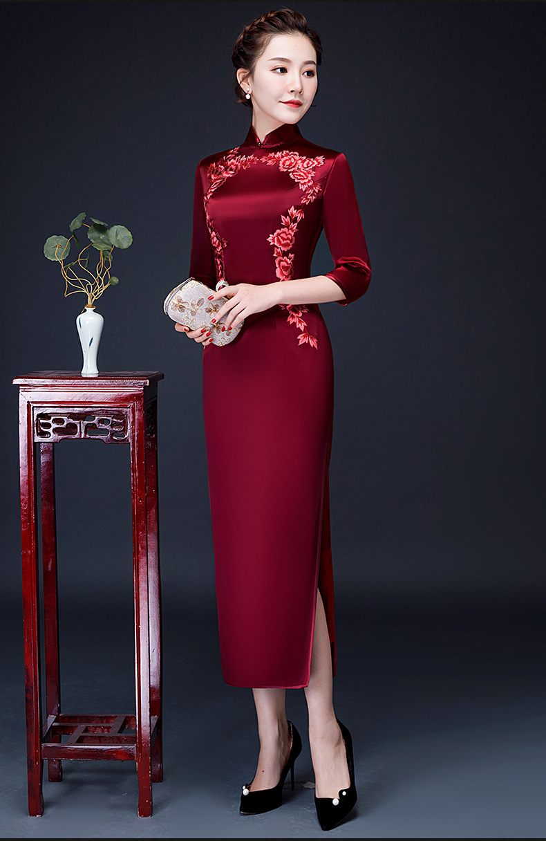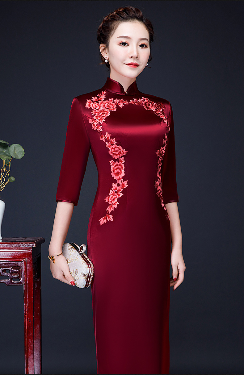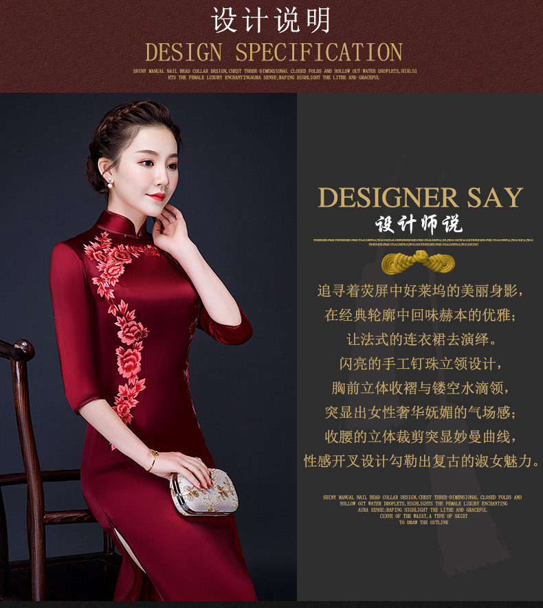 上海旗袍厂LHS-1001冬季新款加厚妈妈装长款旗袍婚宴宴会旗袍裙礼服改良七分袖秋1001