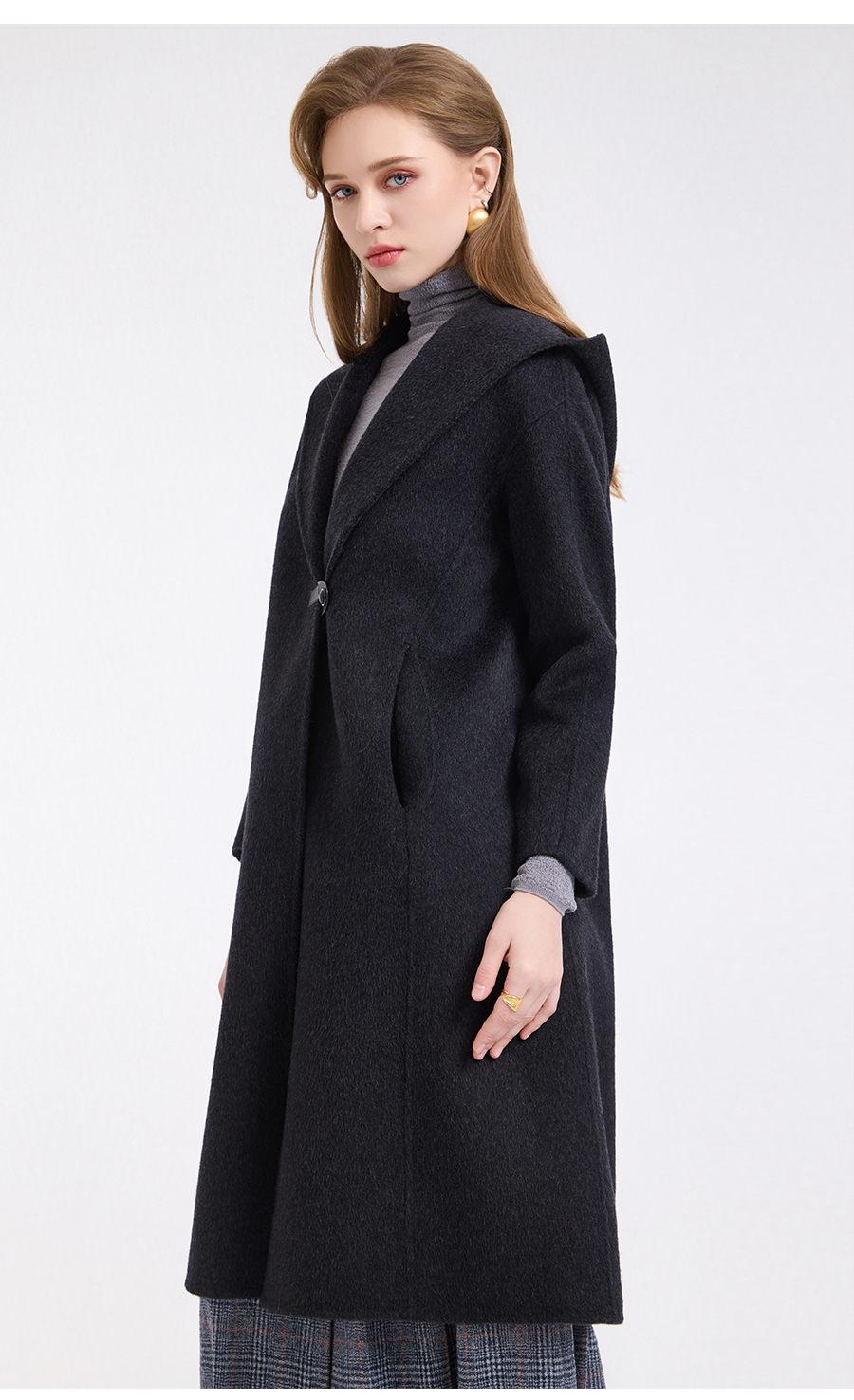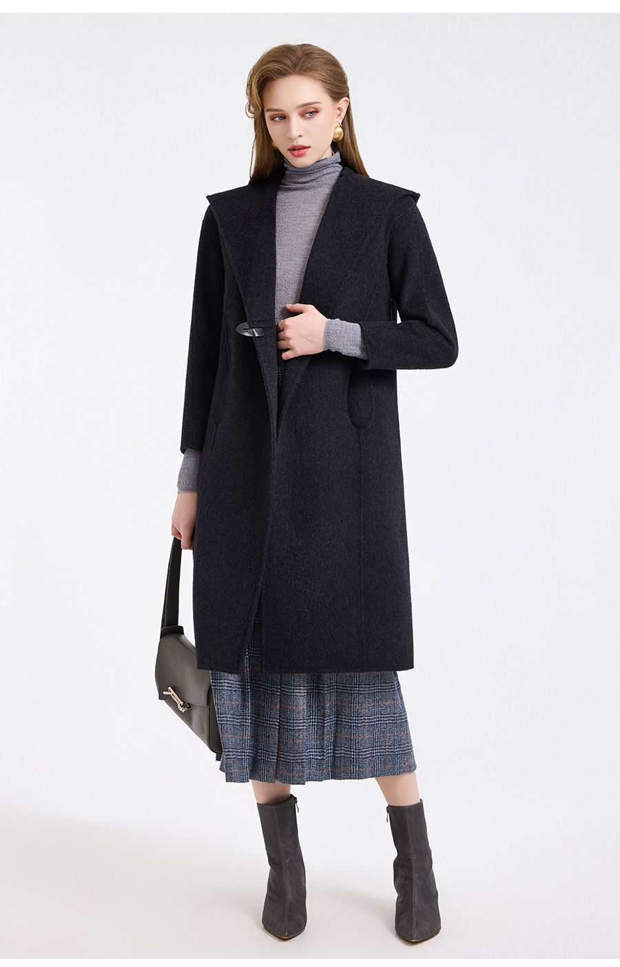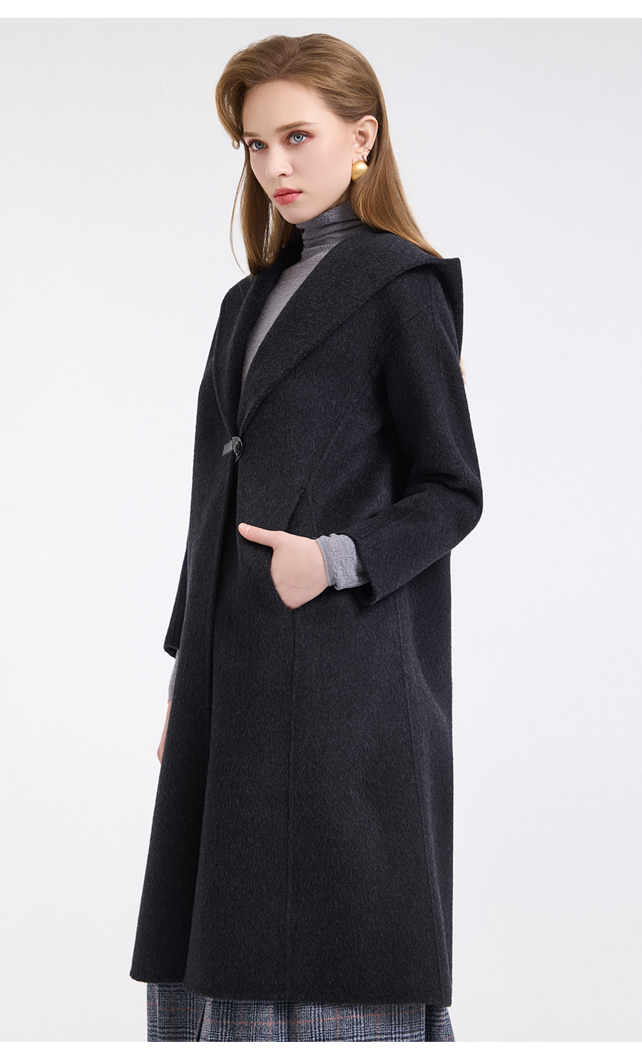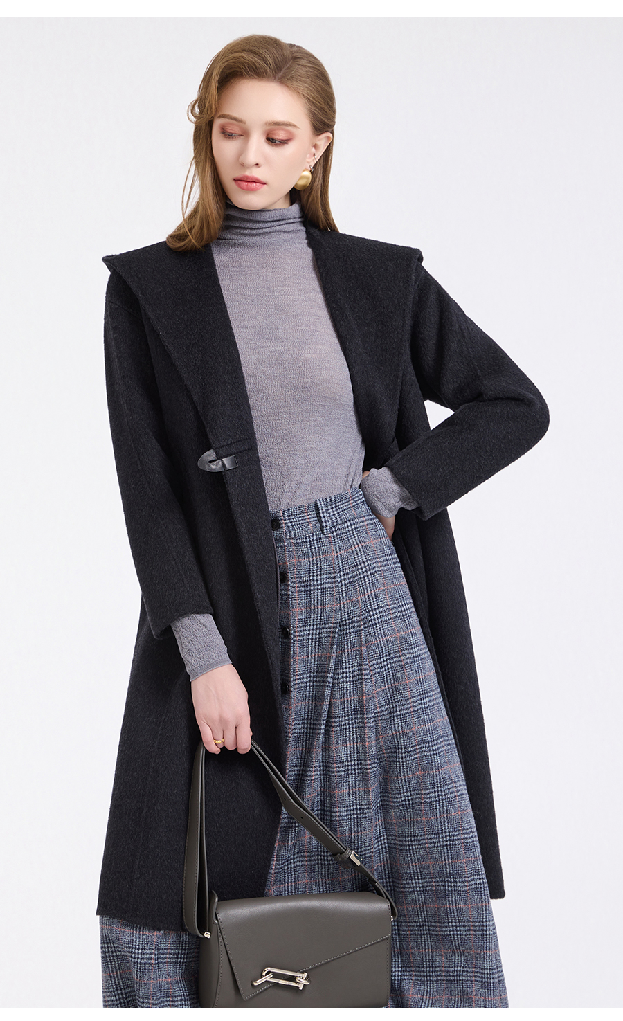 乔万尼连帽设计气质优雅感烟草灰宽松中长款羊毛大衣ED4A781901