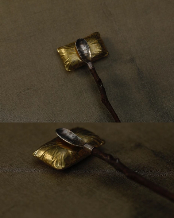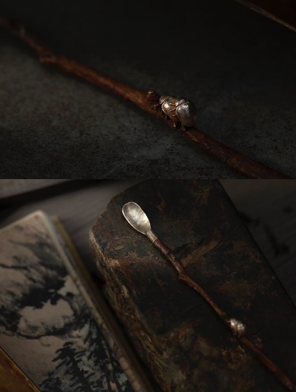 一支铜柄银勺,可作茶拨、也可做香勺。也可以让桌上增添自然的气息。当然它在你手上还有更多的用途,柄是黄铜,雕刻的细节可以处处见考究:有树皮脱落的地方,有枝桠结节的结构。这些仿品都是做不来的。树皮脱落的色泽会越用越传神。这款树枝上多了2只小甲虫,多一份活跃的气息,甲虫也有富甲一方的含义。