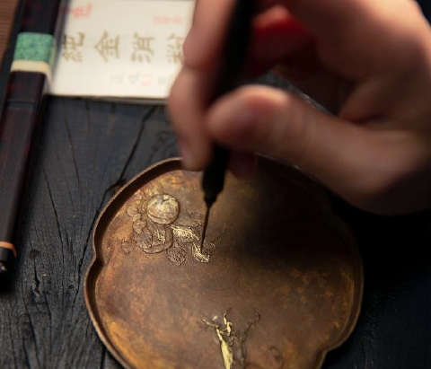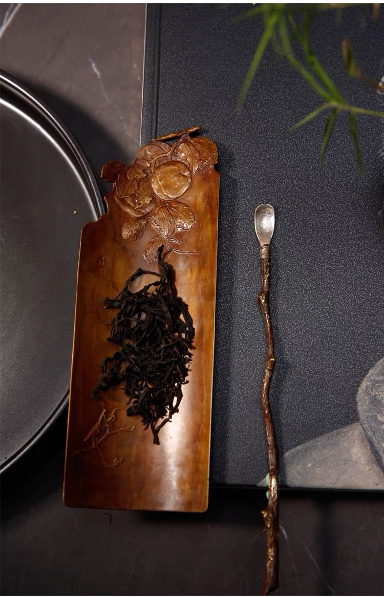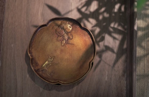 茶则表面做了大漆的工艺,表面是漆,有铜的质感但没任何气味。螳螂贴上纯金。让整个画面更活跃有趣。