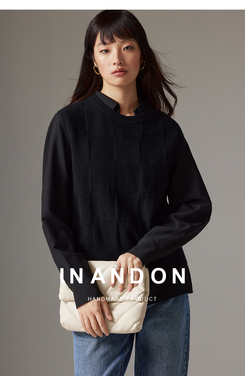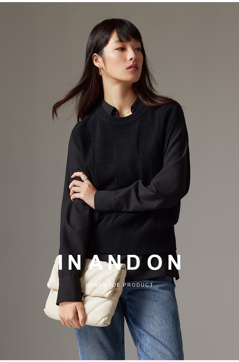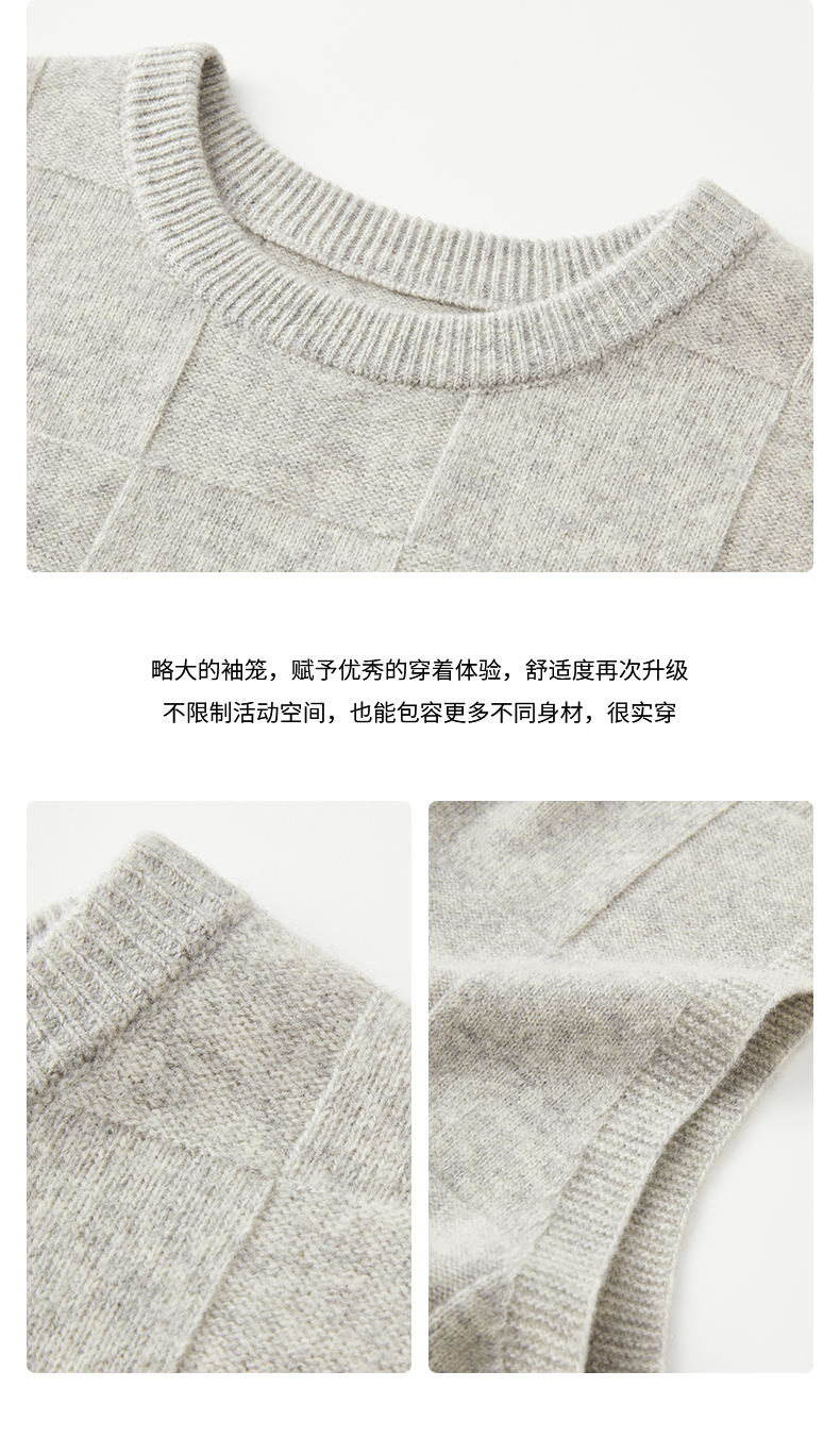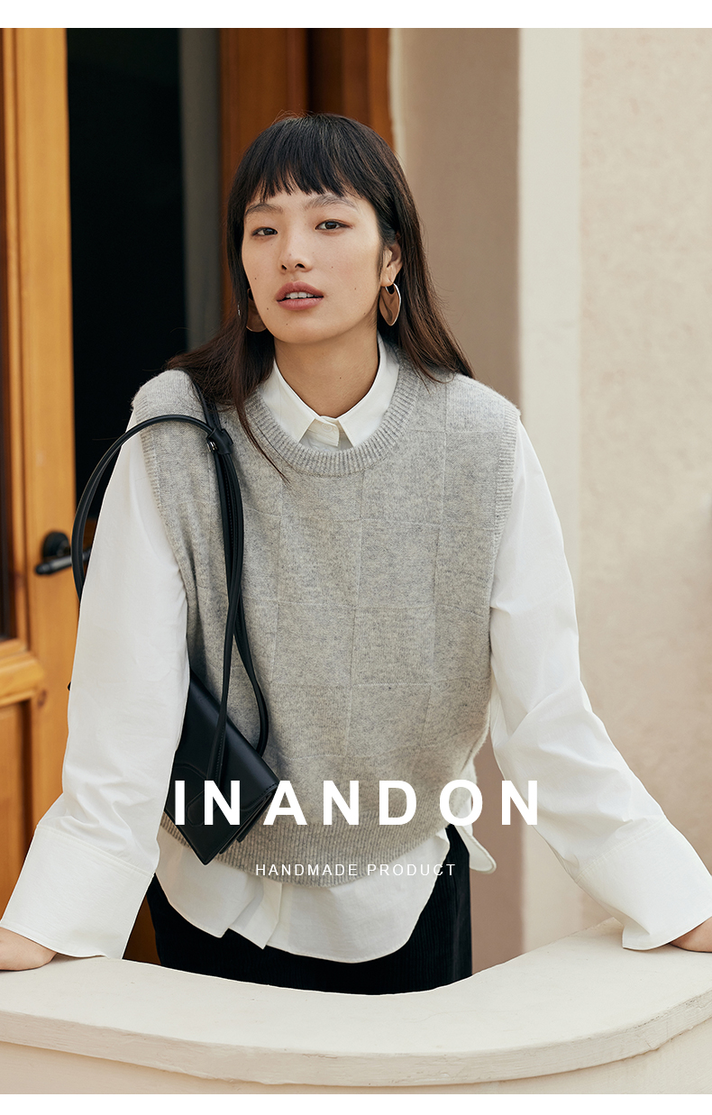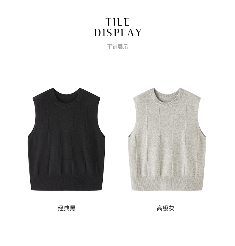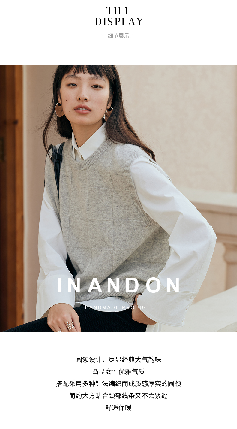 IN AND ON 全绵羊毛针织马甲女2023秋季新款灰色格纹叠穿圆领背心53629