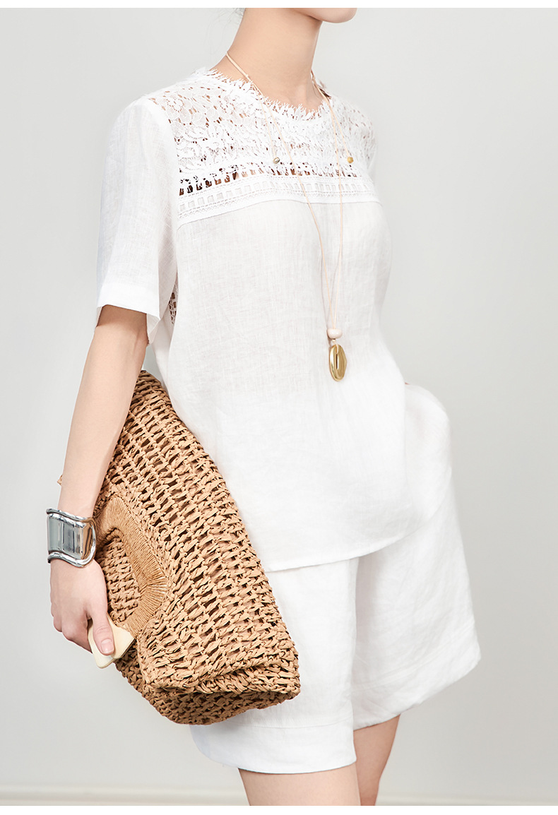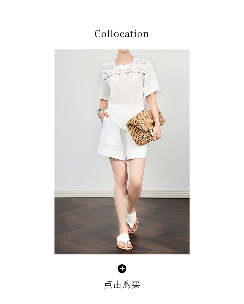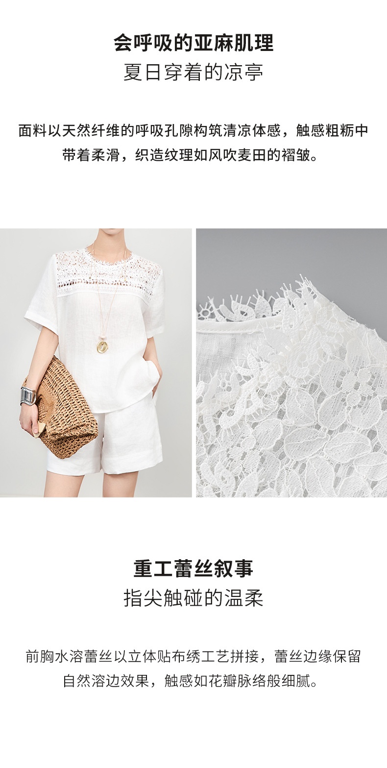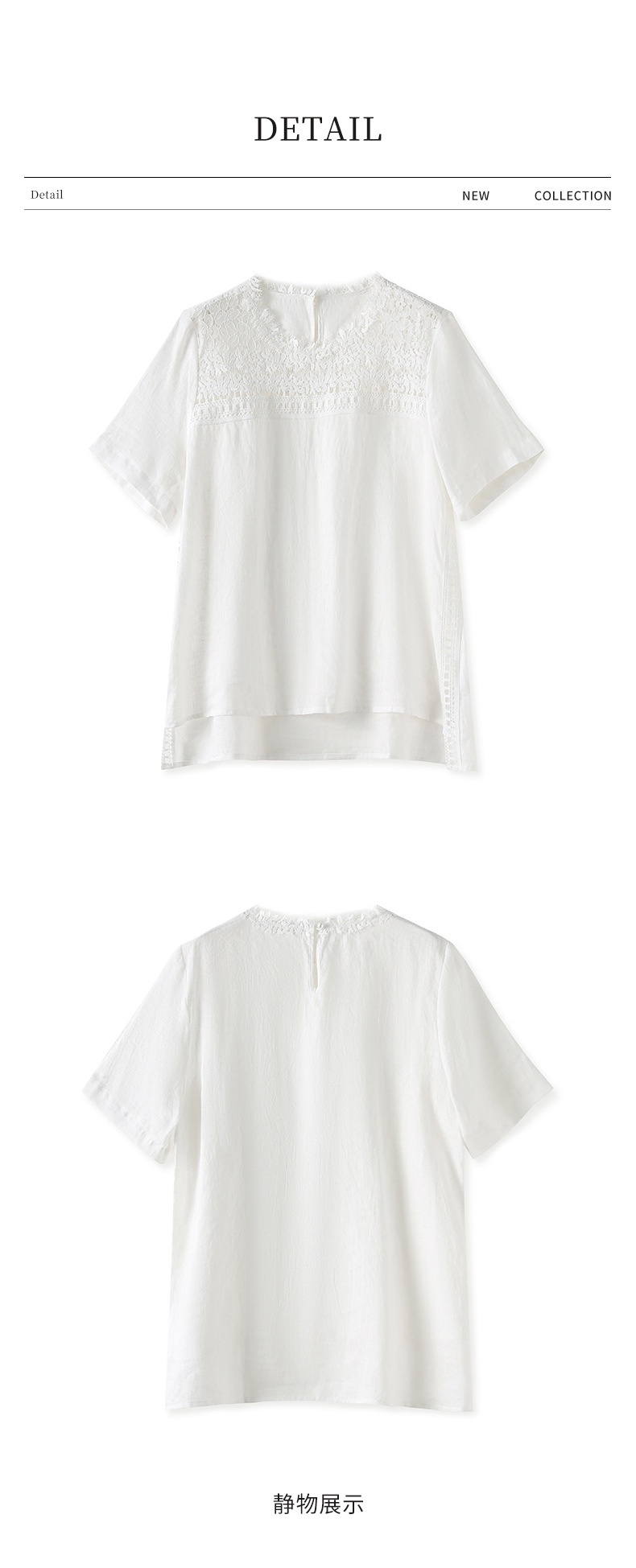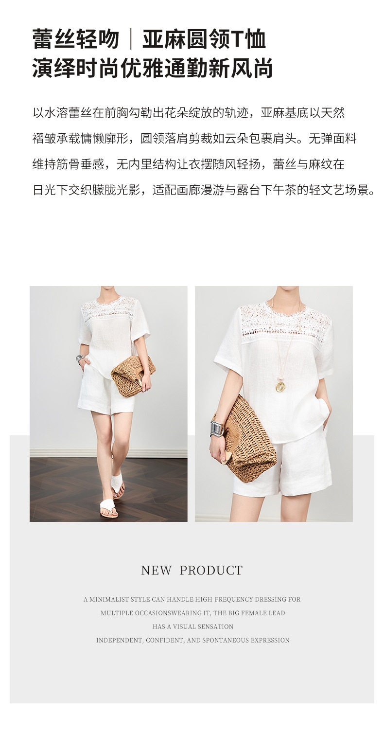 「高货wl」全新升级【铂金会员293/天猫399/差价106】(99407)洛诗琳亚麻重工水溶蕾丝T恤2025夏季宽松圆领短袖上衣女