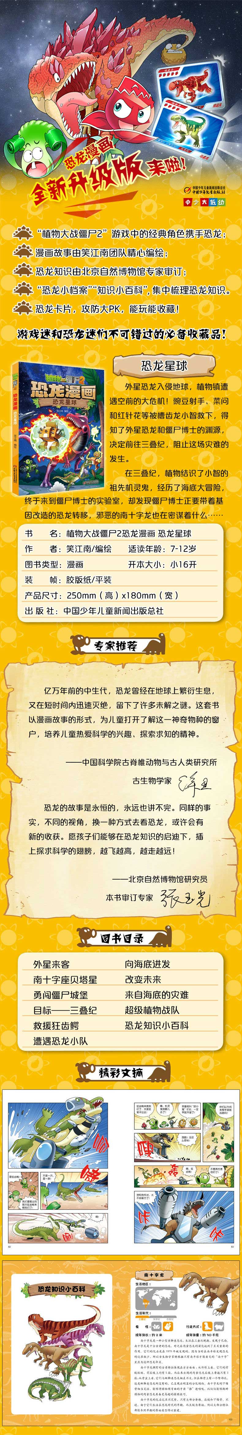 1、将《植物大战僵尸2》游戏中的角色和神奇的远古生物恐龙结合起来,题材新鲜有趣,是植物大战僵尸迷和恐龙迷备的收藏品。2、以多格漫画的形式,讲述植物与恐龙一起冒险的故事,情节跌宕起伏,引人入胜;知识点植入自然巧妙、不教条,且经过专家严格审订,难度适中,小读者在轻松读故事的同时,还能了解准确的恐龙知识。