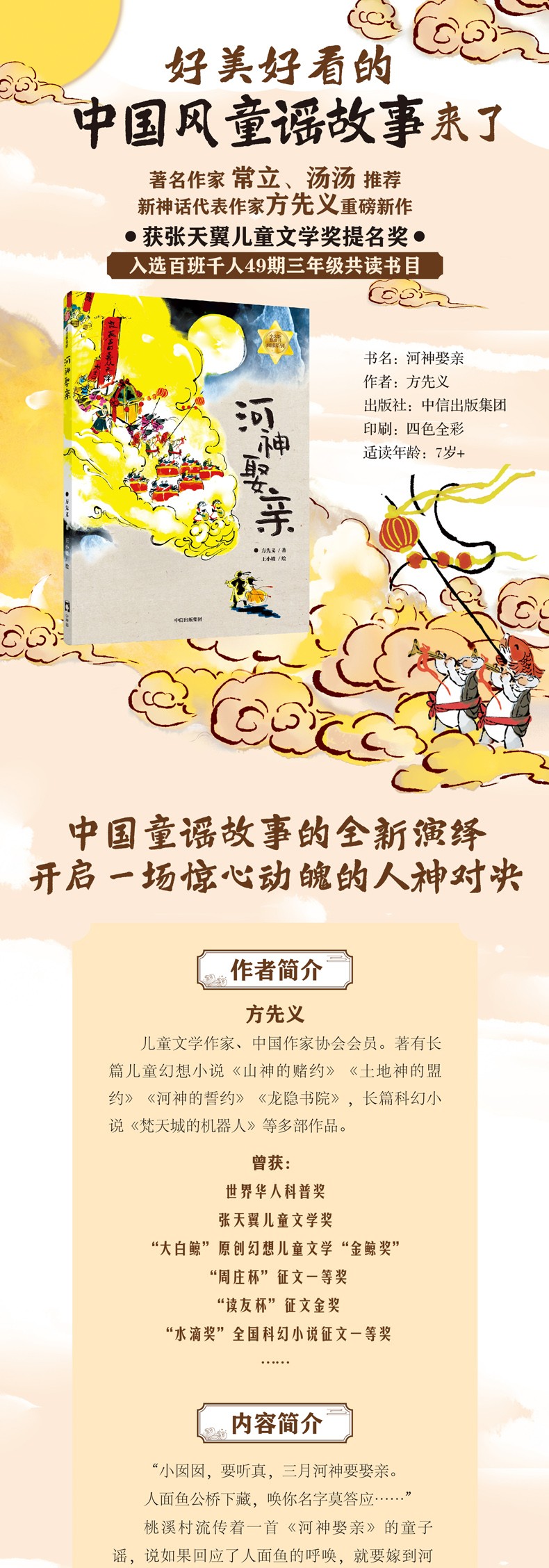 《河神娶亲》是一部让人惊艳的国风儿童文学作品,入选百班千人49期三年级共读书目,获第五届张天翼儿童文学奖。它取材于中国传统民间故事和童子谣,又加入了自己的创造,讲了一个曲折离奇的新版河神娶亲的故事,赋予传统文化新的活力。