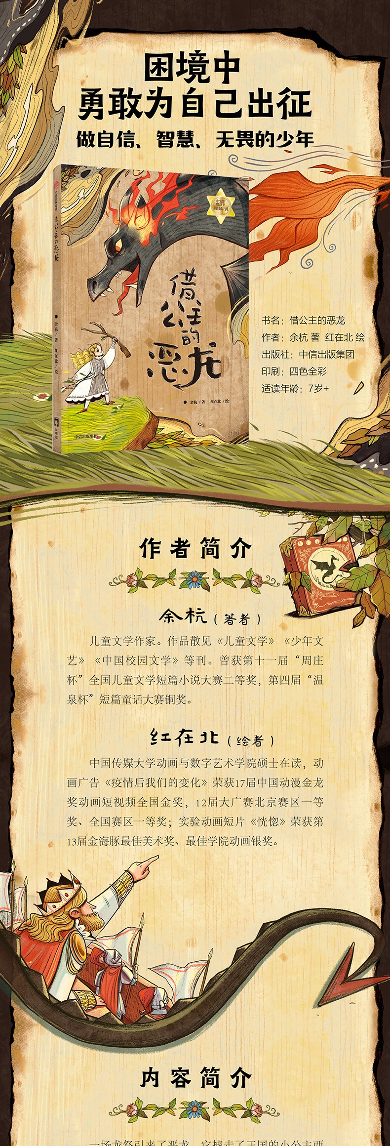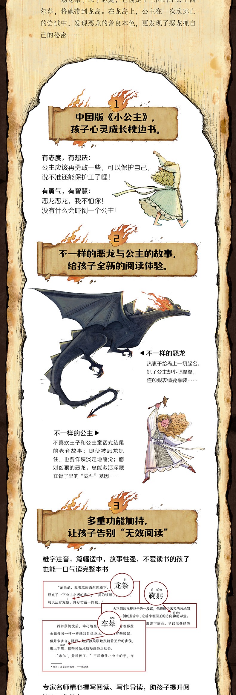 公主与恶龙是西方儿童文学中的典形象,在他们的故事中,通常都会有一位勇敢的骑士,他打败了囚禁公主的恶龙,将公主解救,从此和公主过上幸福的生活。这本书中,作者另辟蹊径,创造了一个勇敢自救的公主形象。不仅如此,这位心地善良的公主终还“拯救”了那只“恶龙”。作者用考究的遣词造句,将小公主和恶龙的心理描写得绘声绘色,文字有张力,辅以动画般的插画,足以惊艳每位读者。