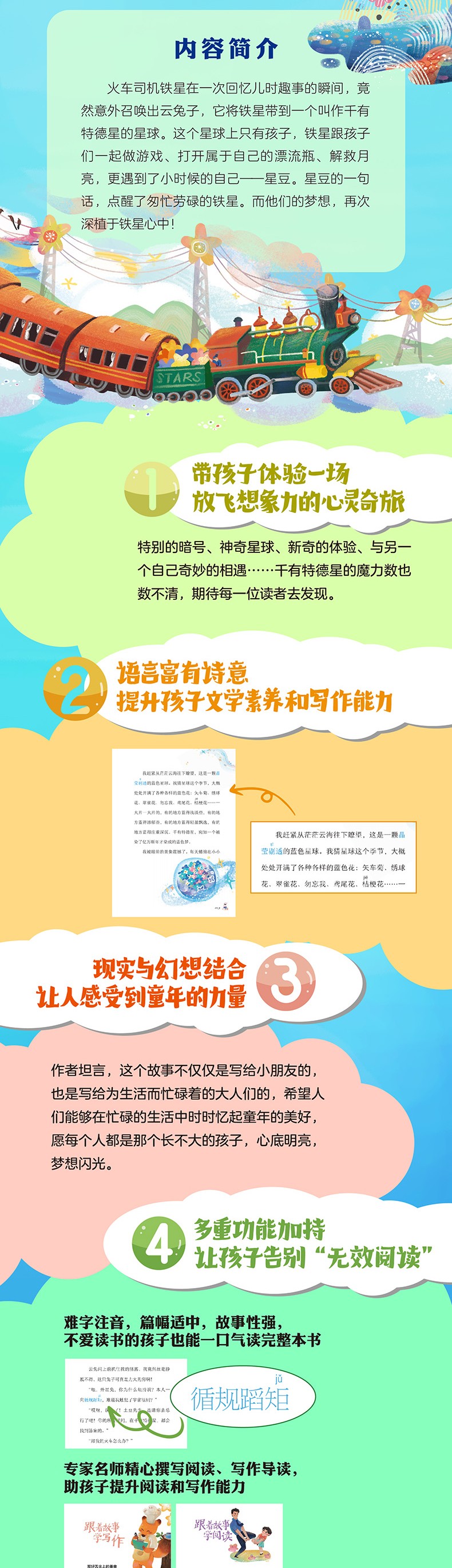 ⭐雁阵老师不光是一位奔跑在两点一线的司机,也是一位儿童文学作家,这部作品既是他致敬童年的作品,又是写给孩子的故事。他想告诉孩子们,童年的力量给人直达心底的精神滋养。当后星豆问铁星,铁星你有没有成为威风的火车司机时,每个人的内心为之一振,原来每一颗梦想的种子,都是在小时候萌芽的。
