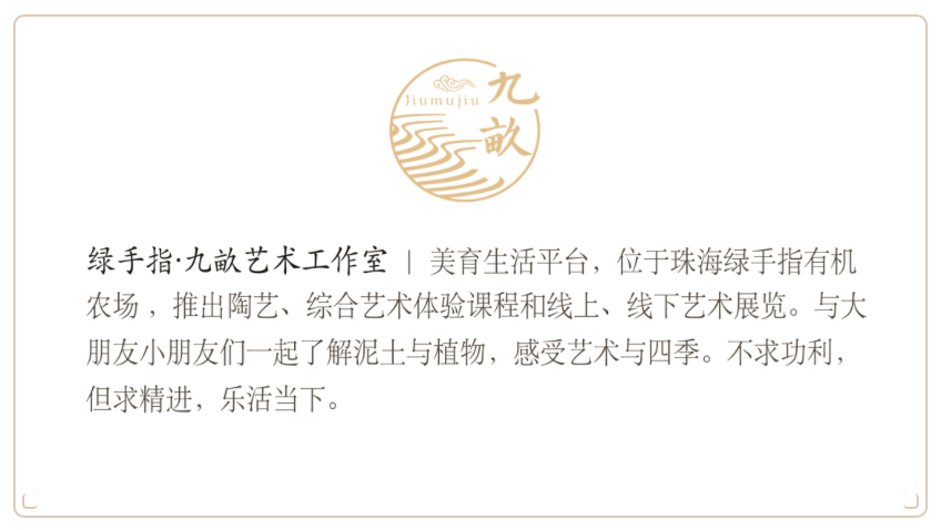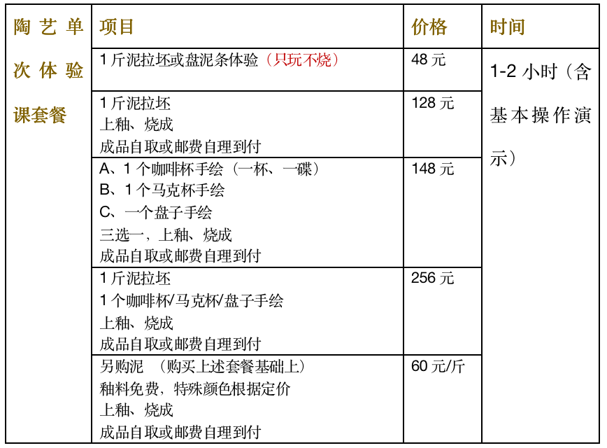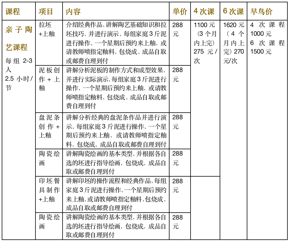 Pottery(Long term classes) 价活动费用: 4次课程:1100元(6月前早鸟价1000元) 6次课程:1620元(6月前早鸟价1500元) 单次体验:288元 参课时间: 逢周三/周六/周日 下午14:30-17:00开放 活动注意事项: 1、名额有限,报完即止,请参课前与老师确认时间。 2、陶瓷烧成后会缩小11%-15%体积,器皿边缘可能会有小裂缝,属手作陶瓷正常现象。如器皿在完全干燥之前开裂,属操作不当,会询问作者是否进行烧制。如烧好后出现严重裂痕,将补送老师手作器皿一份,或下次体验赠送等比例斤数的泥料包烧(这种成型方式开裂情况比较少)。 3、陶瓷器皿如无法自取,可选择邮寄,会将作品包装好通过货到付款的方式寄送,邮费和包装费按快递公司收费标准,陶瓷属于易碎品,邮寄过程会有破碎风险,工作室不承担由此造成的后果,建议自取,请务必知晓。 4、因疫情原因,进园请佩戴口罩,并需要测量登记体温,采摘活动由工作人员统一带领,希望您能理解。 5、保护田地,尊重农民劳动,请到开放的区域、根据工作人员指引采摘指定品种,避免踩踏、伤害到蔬果植株。采摘的果蔬请过称后再食用,请勿边摘边吃。 6、活动费用不含餐费,大家可在方野农园预约有机午餐,报名活动的家庭预约方野有机餐每桌可获赠前菜一份(菜品随机,惊喜不断)! 预约电话:15018336122,1501599057 PS:报名参加活动的大家再方野农园用餐每桌可获赠一前菜或者甜品哦!