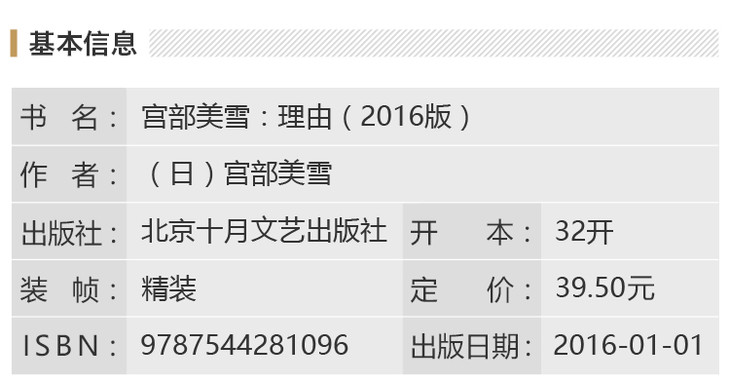 《理由》是日本作家宫部美雪的代表作品,全票获得20届直木奖,日本销量突破160册。直木奖评委认为:《理由》取材于现实社会弊病,故事架构新颖巧妙,主题刻画沉郁厚重,终以全票获得直木奖,十分罕见,又众望所归。 《理由》内容简介:雨夜,住宅美好新城里发生了一起血案:住在2025号的四口人惨遭灭门。 警方侦查发现,四人既不是2025号的户主,也不是租客,姓名、职业、长相不详。入户调查发现了更多疑点:卧室、沙发、电器都蒙着布,衣物都放在便携纸袋里。翻遍整套房子,既找不到一张他们的照片,也没有信件,四人仿佛只是小心翼翼地暂时居住在这里。 他们究竟是谁? 2025号的真正户主在哪里?