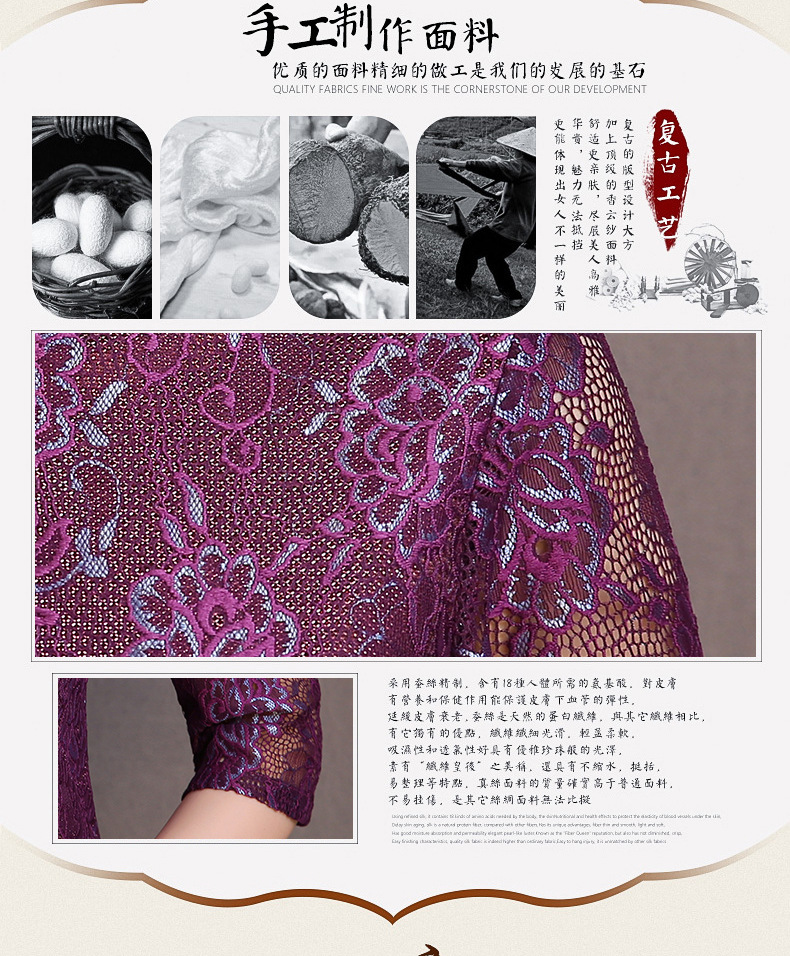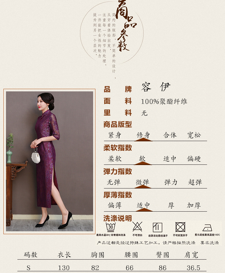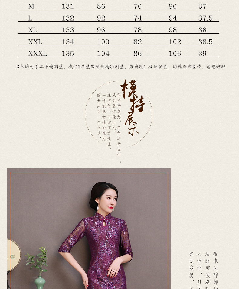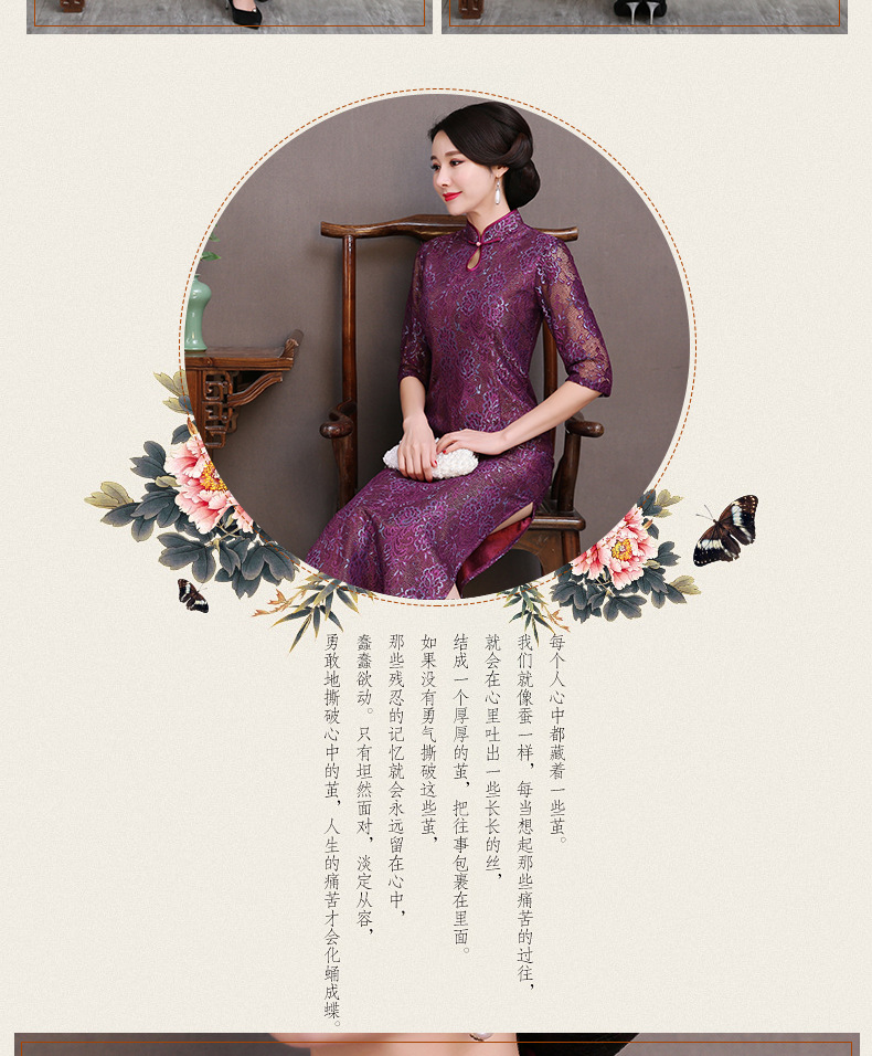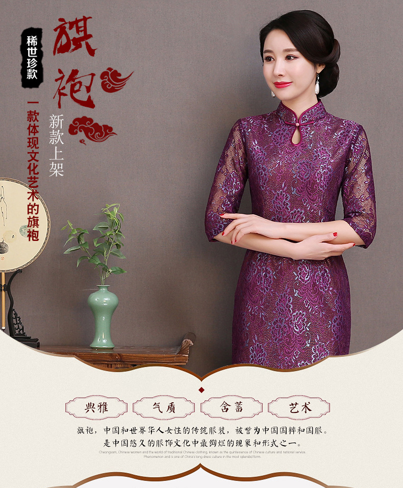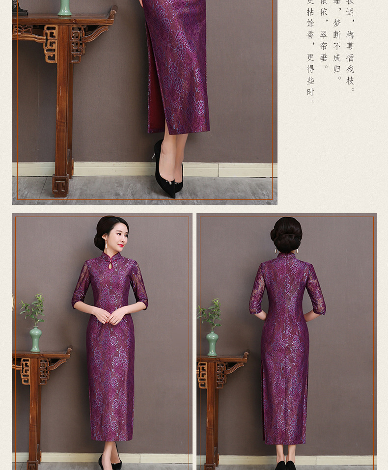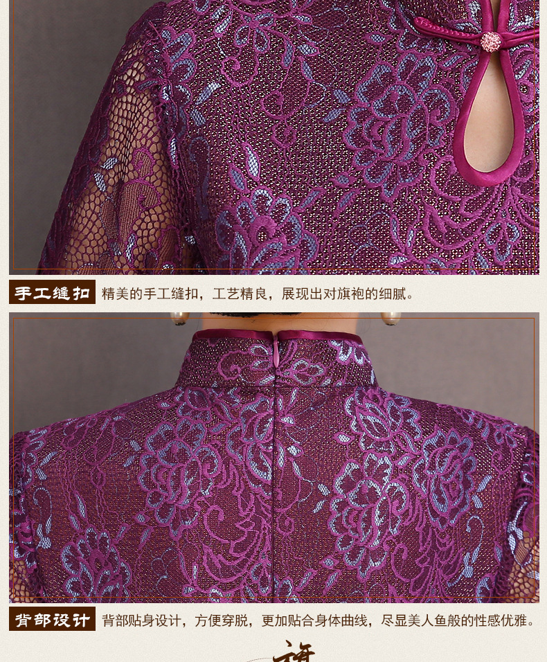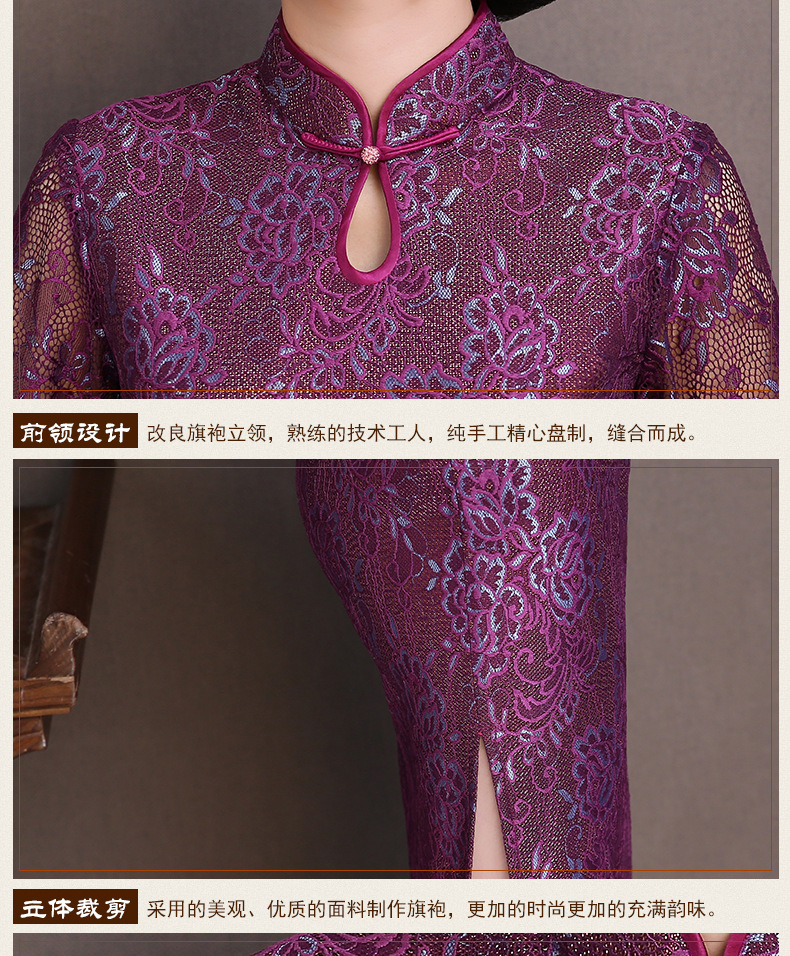 RY-11203新款中袖立领紫色长蕾丝旗袍
