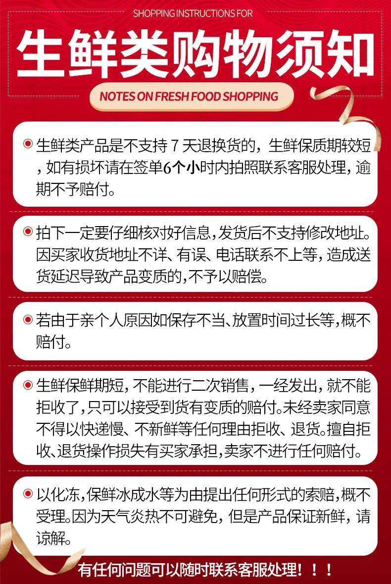 4、售后时间逾期或未按要求提供资料的不予售后,因顾客个人原因如地址不详,电话不通,放置取货点,蜂巢代售点不及时取货等原因导致海鲜腐烂变质,不予售后,私自拒收的不售后