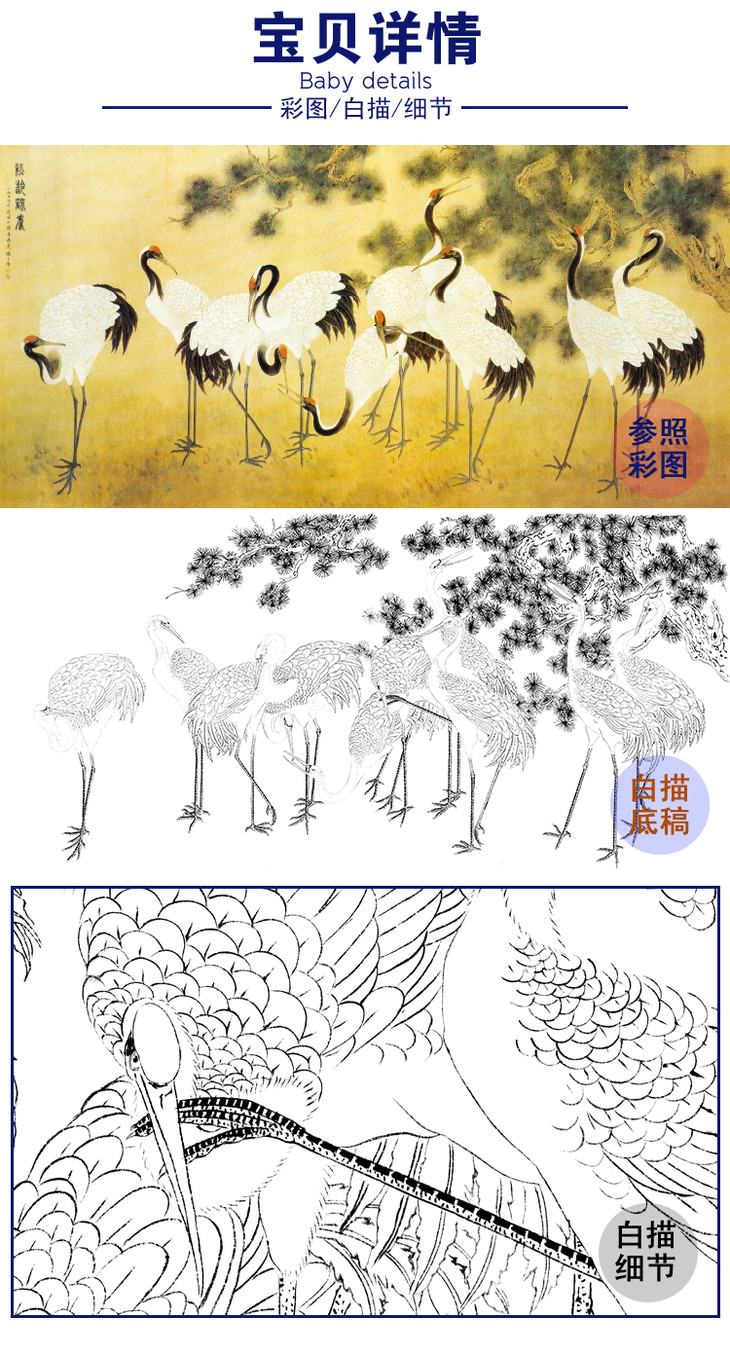 横幅工笔鸟动物白描底稿-陈之佛-仙鹤《松龄鹤寿》-多种白描尺寸可选-QA11
