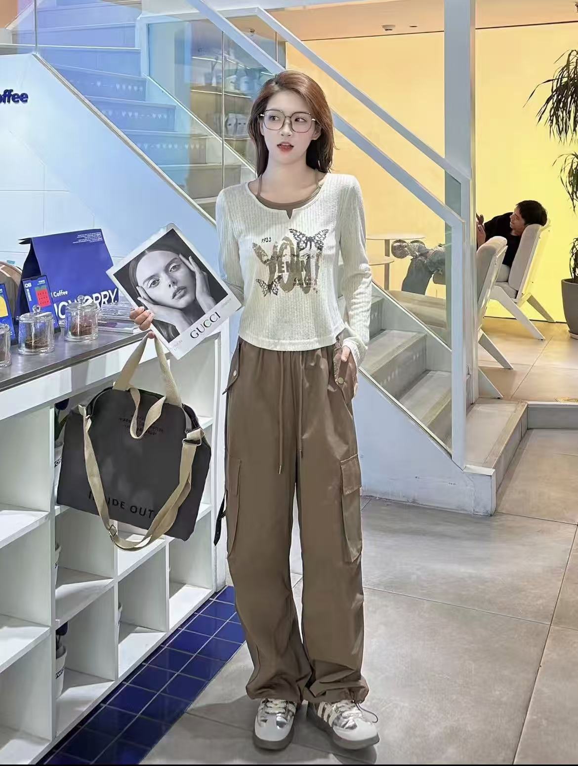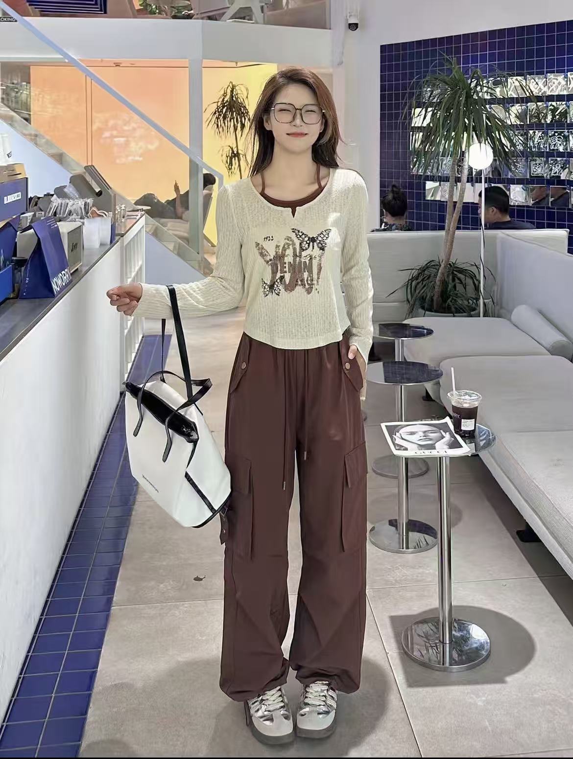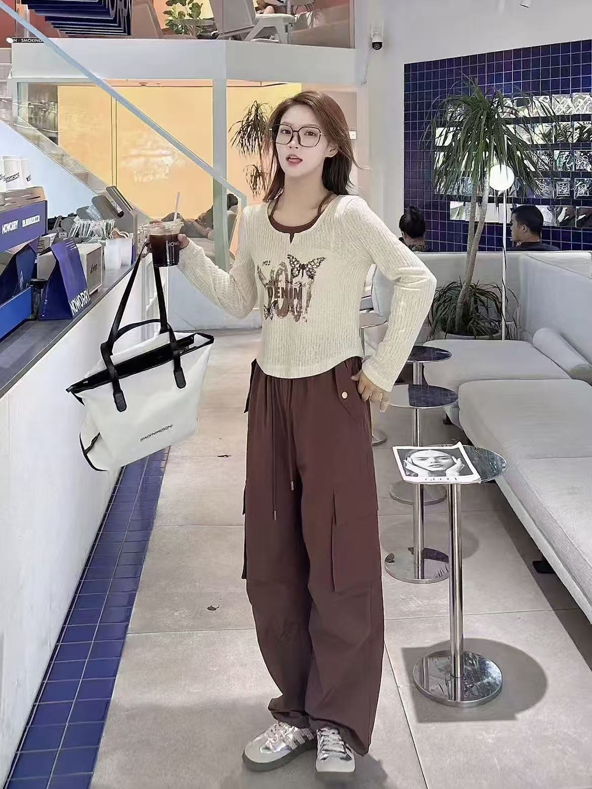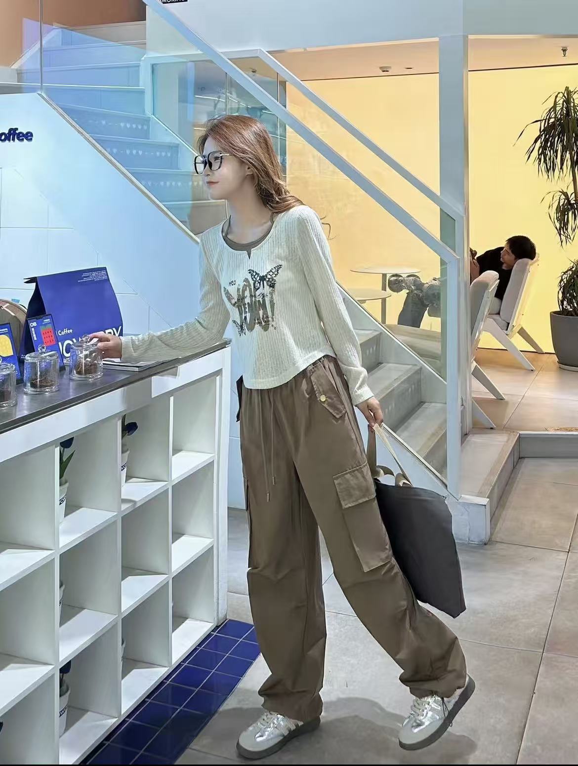 418良粉节|2026 活动爆款【自营】衣周期~(二件套)Q63米色假两件长袖上衣➕休闲两穿工装裤套装-喜出