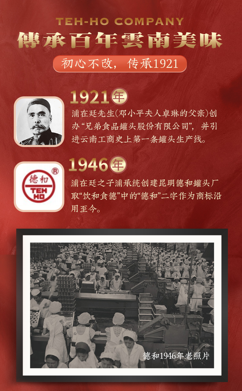 - 昆明德和罐头厂是中国最早开始生产制造罐头的企业之一,至今已有九十八年的悠久历史,现已形成以罐头食品为主,腌腊制品、糕点月饼等为辅的云南省规模最大和最具影响力综合食品制造企业,奠定了云南罐头行业的基石。