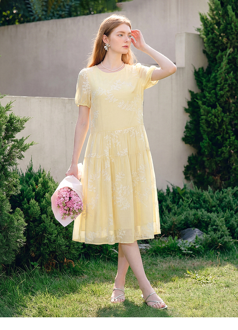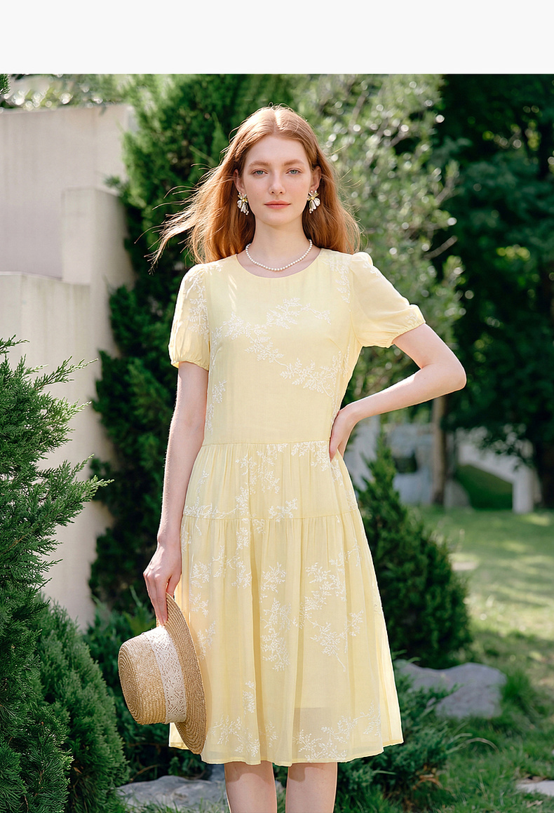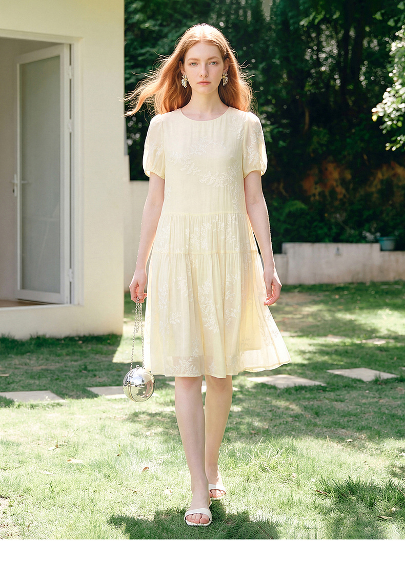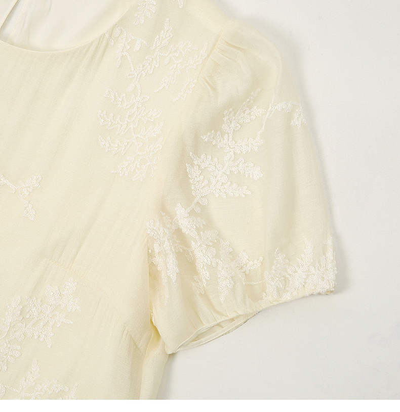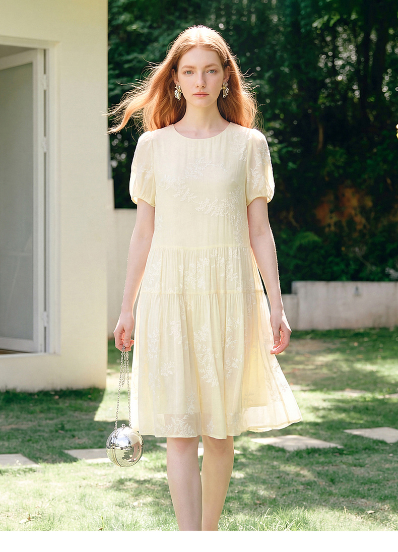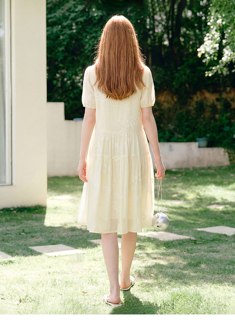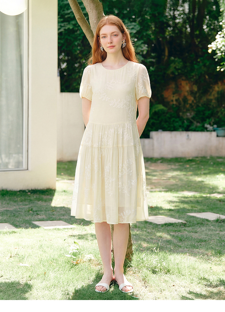 天猫同步【轻奢!中式淡雅】拉夏贝尔/La Chapelle圆领刺绣花朵后背一粒扣短袖连衣裙显瘦遮肚宽松连衣裙