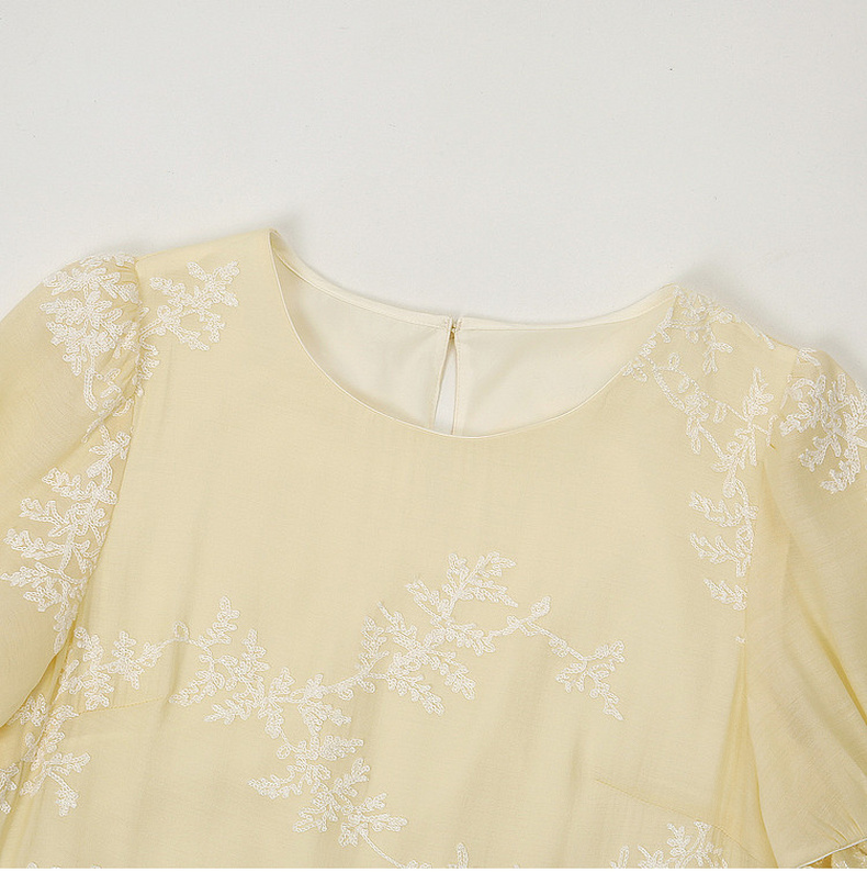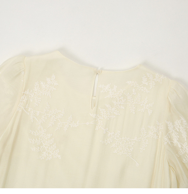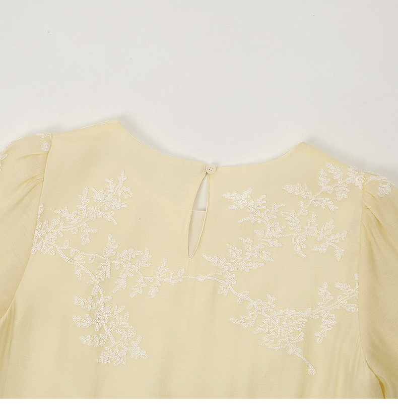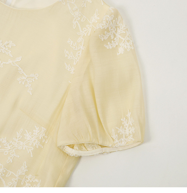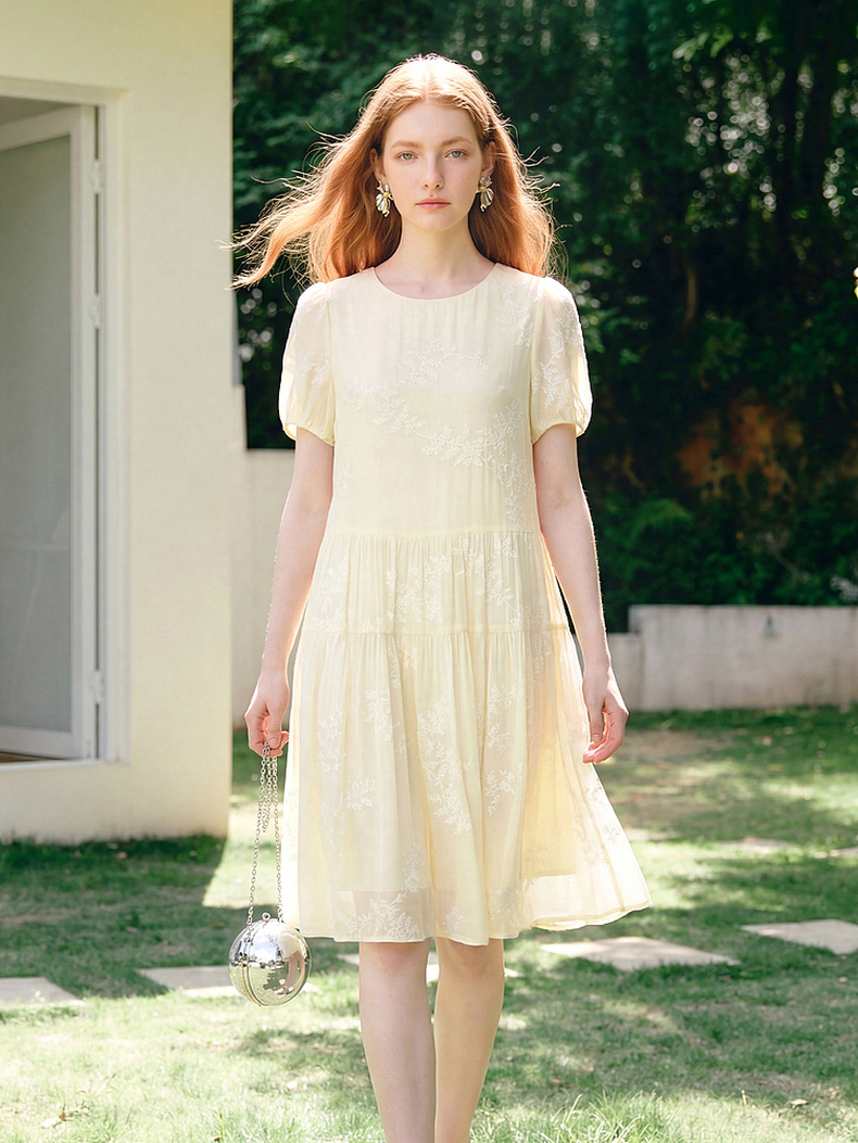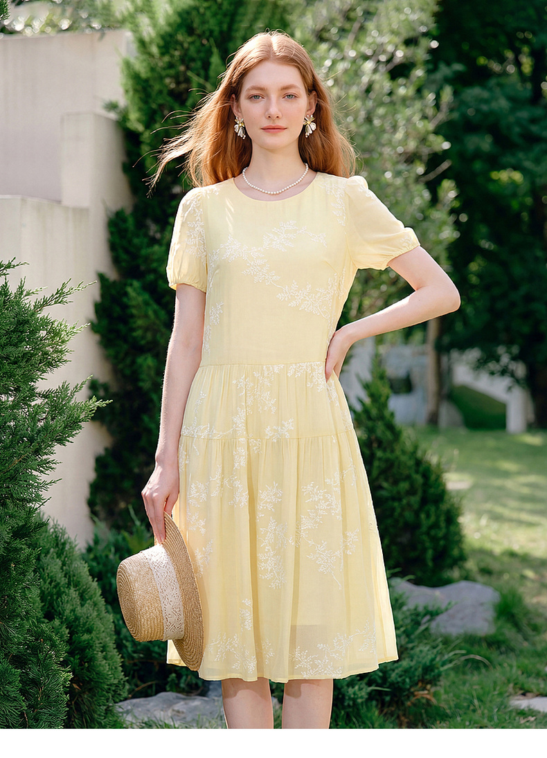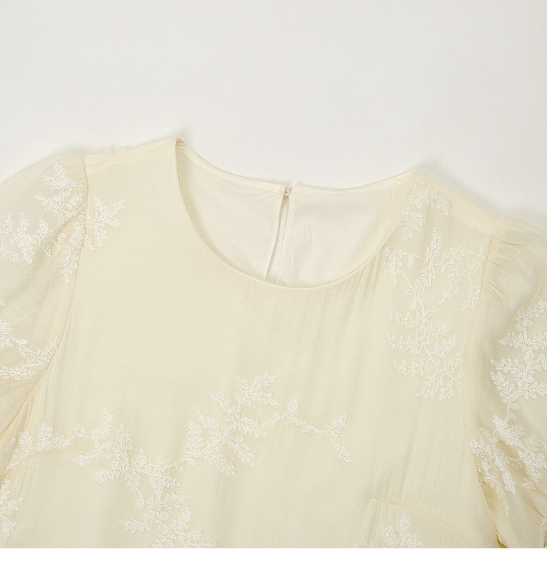 天猫同步【轻奢!中式淡雅】拉夏贝尔/La Chapelle圆领刺绣花朵后背一粒扣短袖连衣裙显瘦遮肚宽松连衣裙