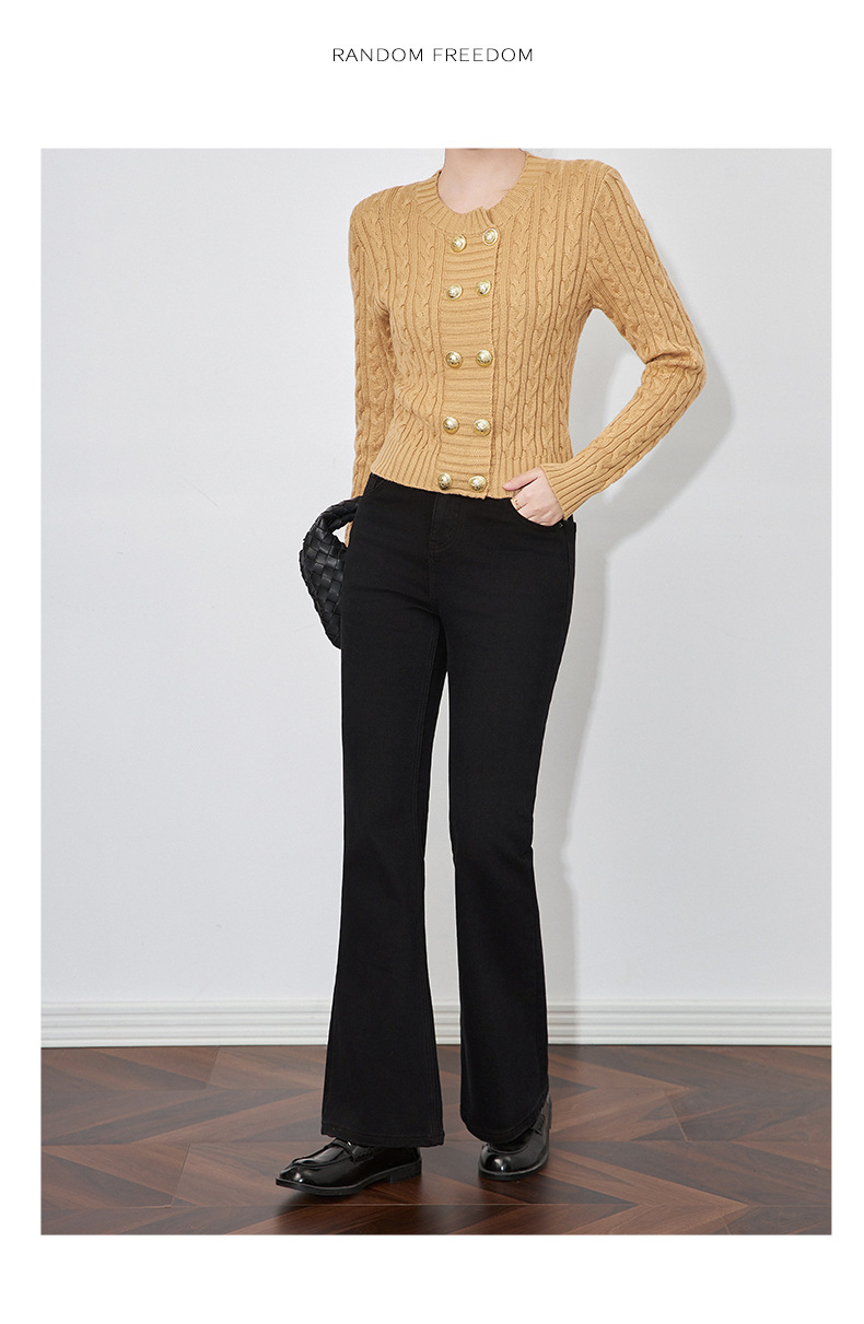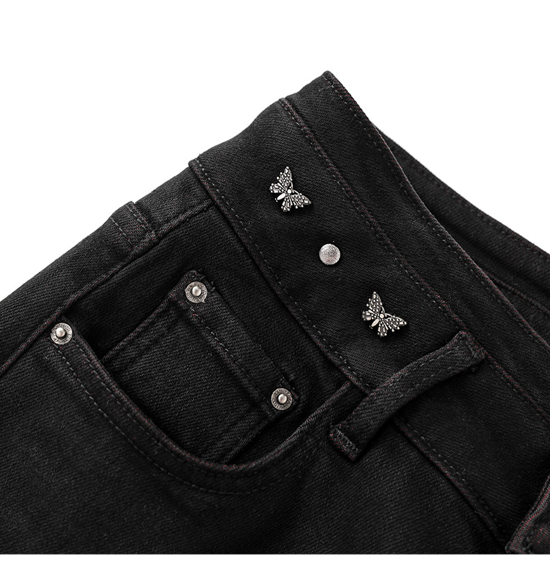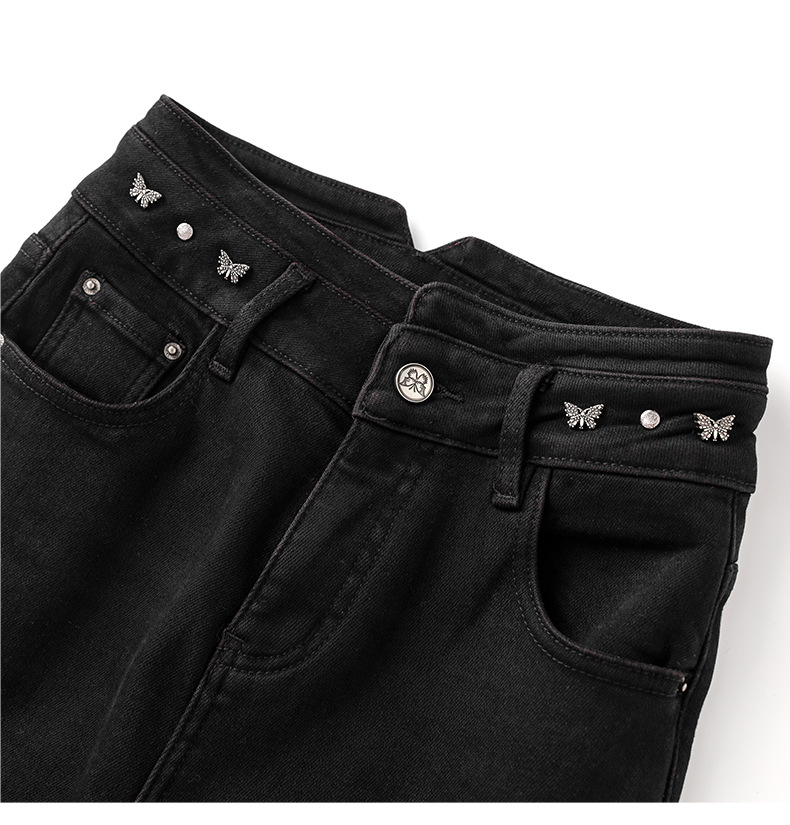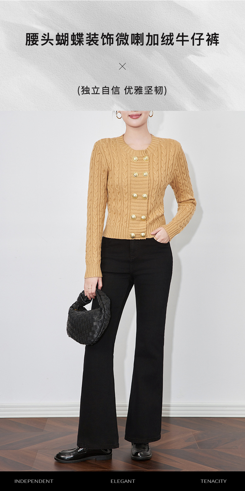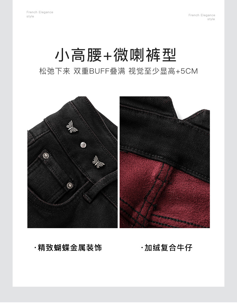 【高货wl】全新升级【铂金会员220/天猫299/差价79】(41318) 洛诗琳新款加绒保暖蝴蝶装饰时尚显瘦松身喇叭黑色牛仔裤