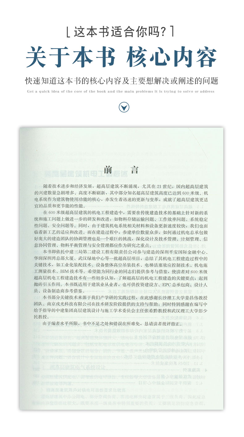 本书结合武汉绿地中心及深圳平安国际金融中心机电工程安装实践,介绍超高层建筑机电总承包施工技术,包括超高层建筑机电工程概述,600米级超高层建筑机电总承包管理,超高层建筑机电创新技术,实施案例四章内容。书中对总承包管理组织架构、深化设计及技术管理、基于BIM测量机器人指导机电工程施工技术、超高层建筑设备移动吊笼吊装技术等进行详细介绍,并配有视频及动画演示,读者可扫码观看。