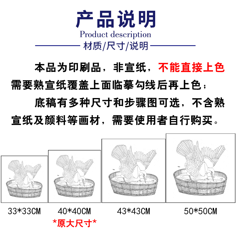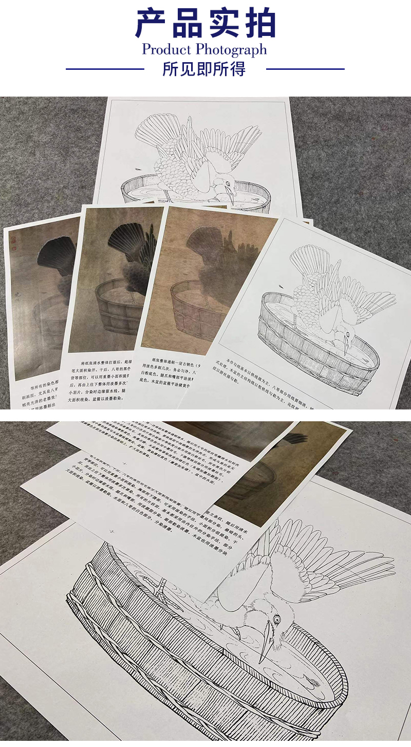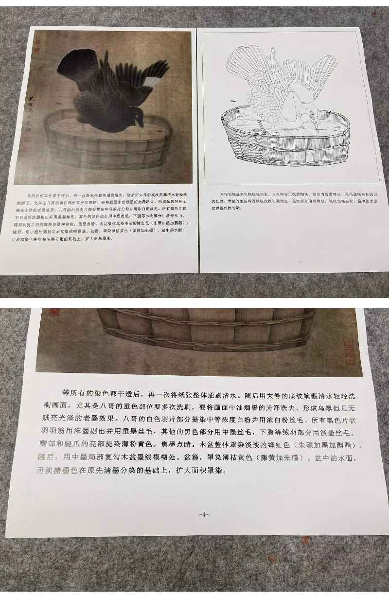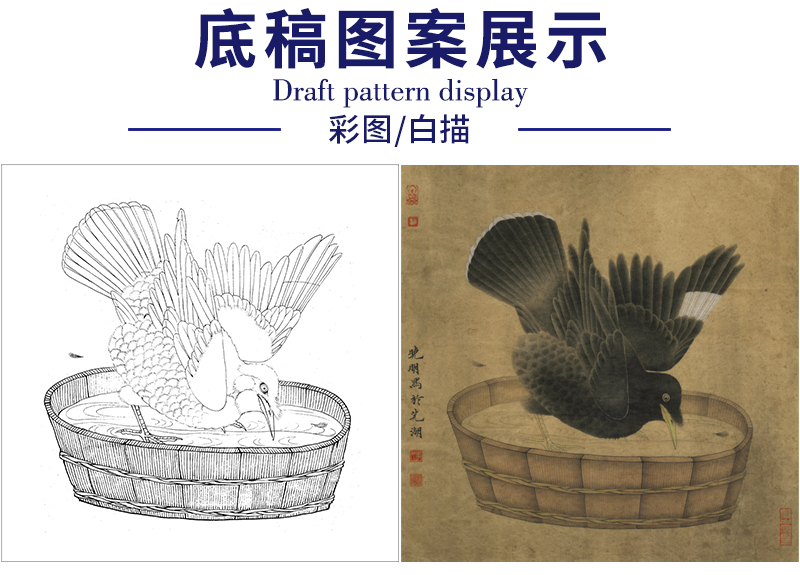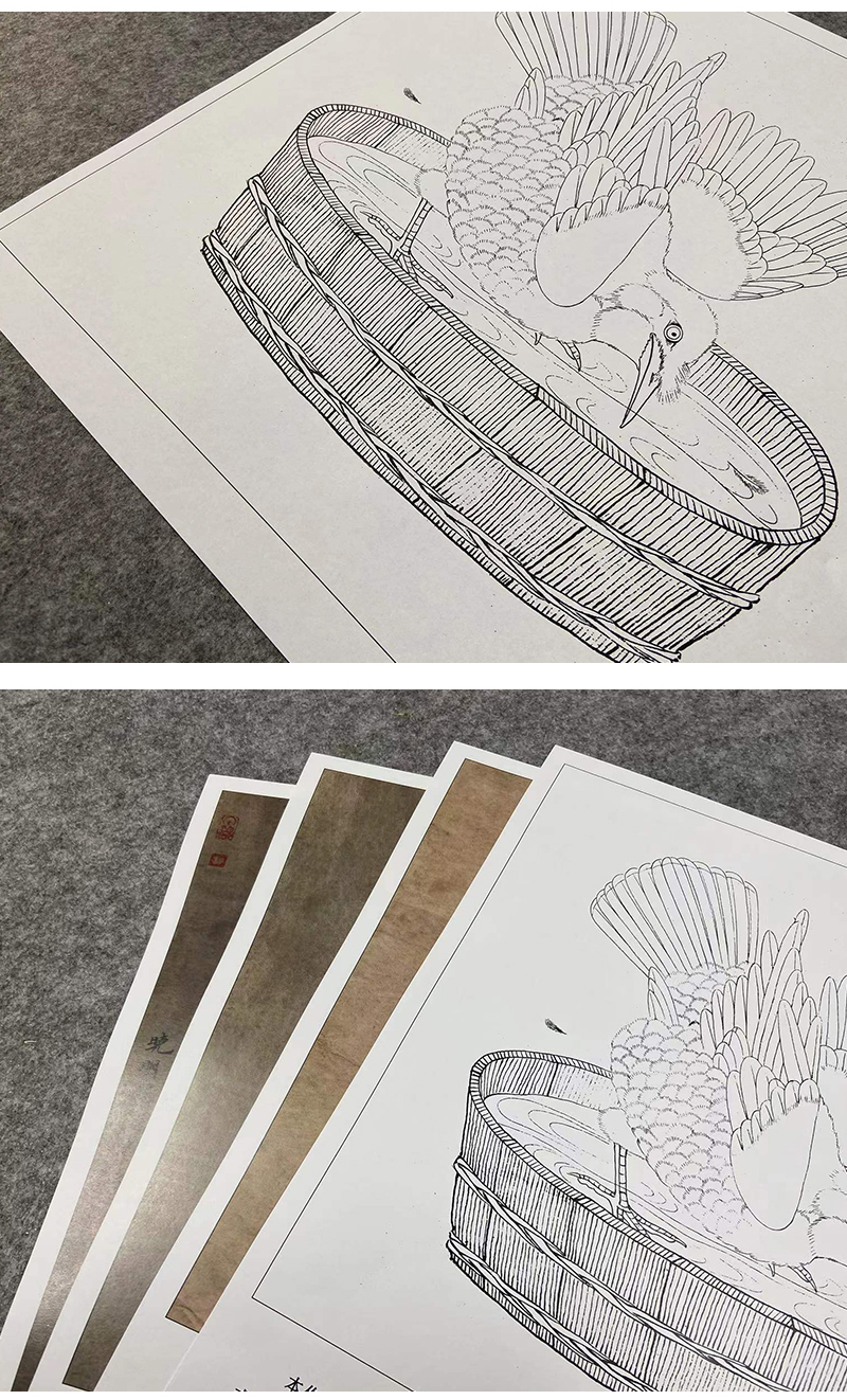 【有步骤、大彩图】李晓明工笔画白描底稿斗方小品《禽浴图》乌鸦临摹勾线动物线稿K064