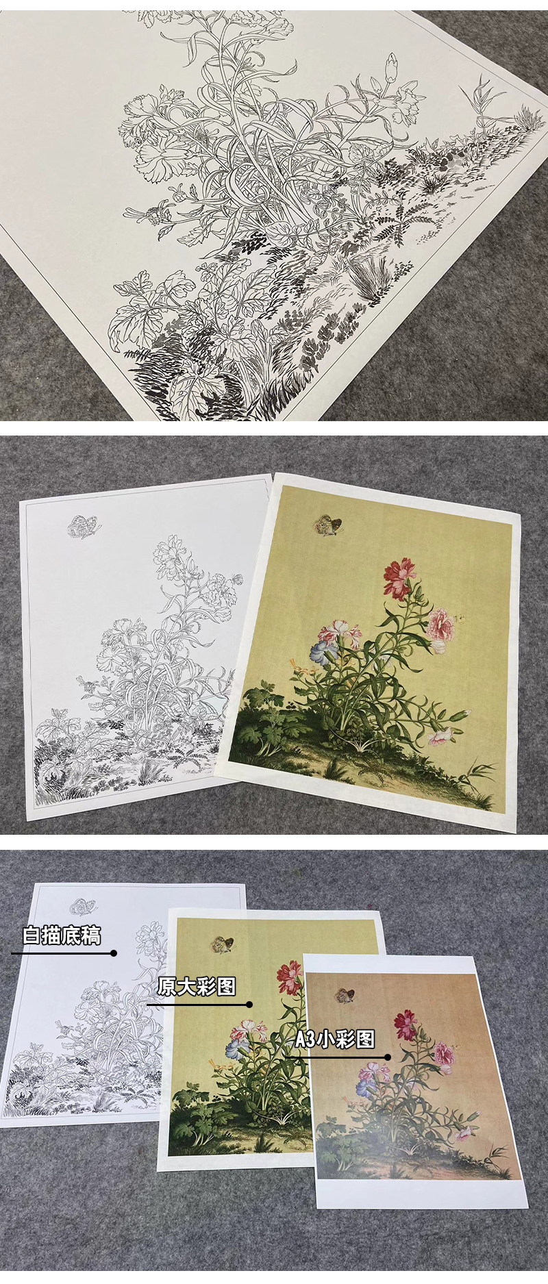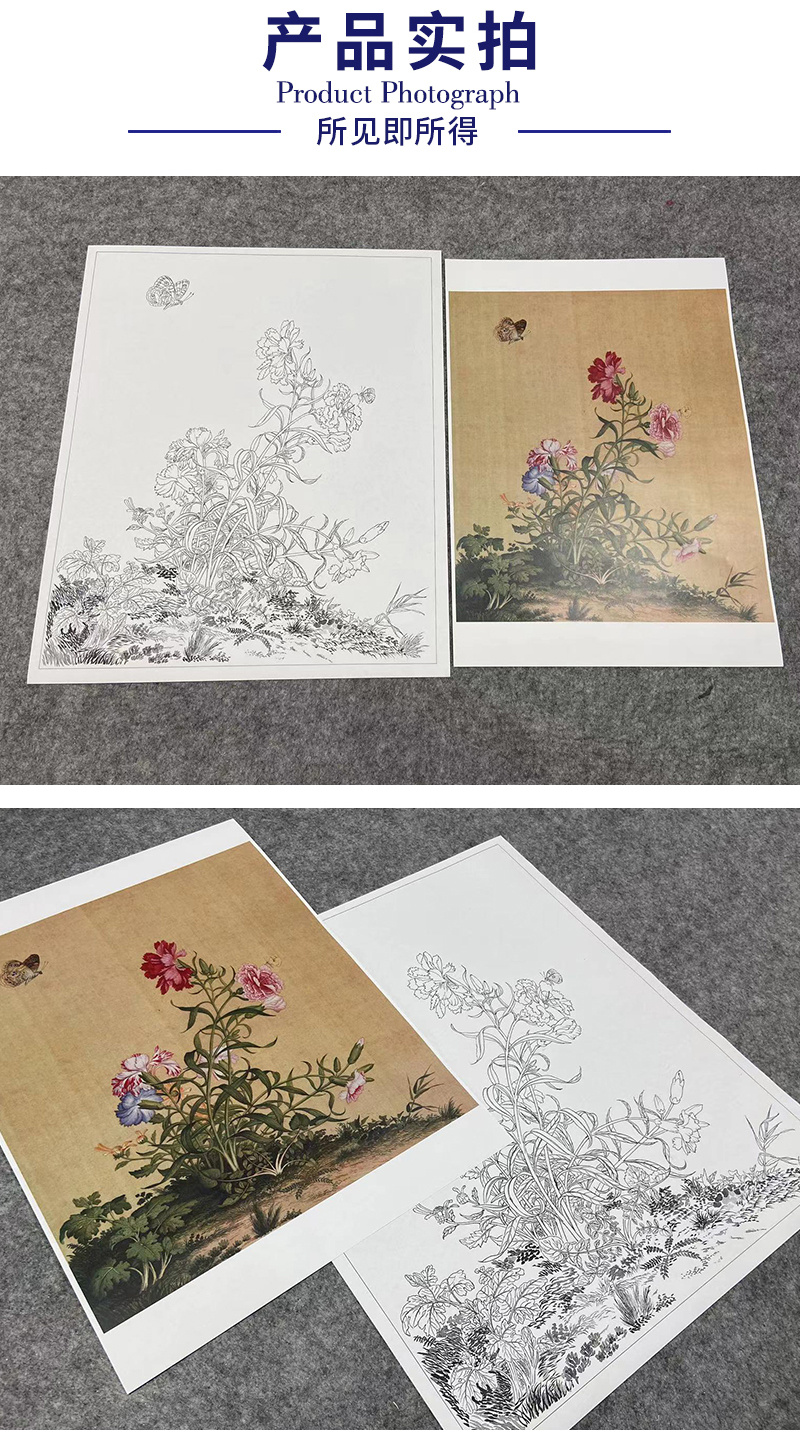 【大彩图】郎世宁工笔画白描底稿小品《仙萼长春册》虞美人与蝴蝶花临摹勾线高清打印稿LT05