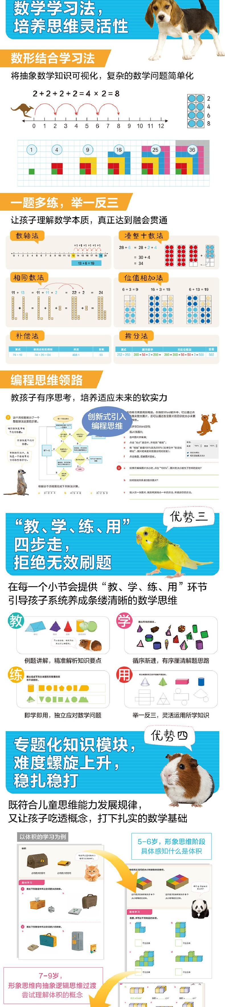 ①数形结合教学法,将复杂问题简单化;②运用编程思维解决数学问题,教孩子学会有序思考;③一题多练,举一反三,让孩子理解数学本质,真正达到融会贯通;④螺旋上升的知识体系,符合儿童思维发展规律,让孩子吃透数学概念