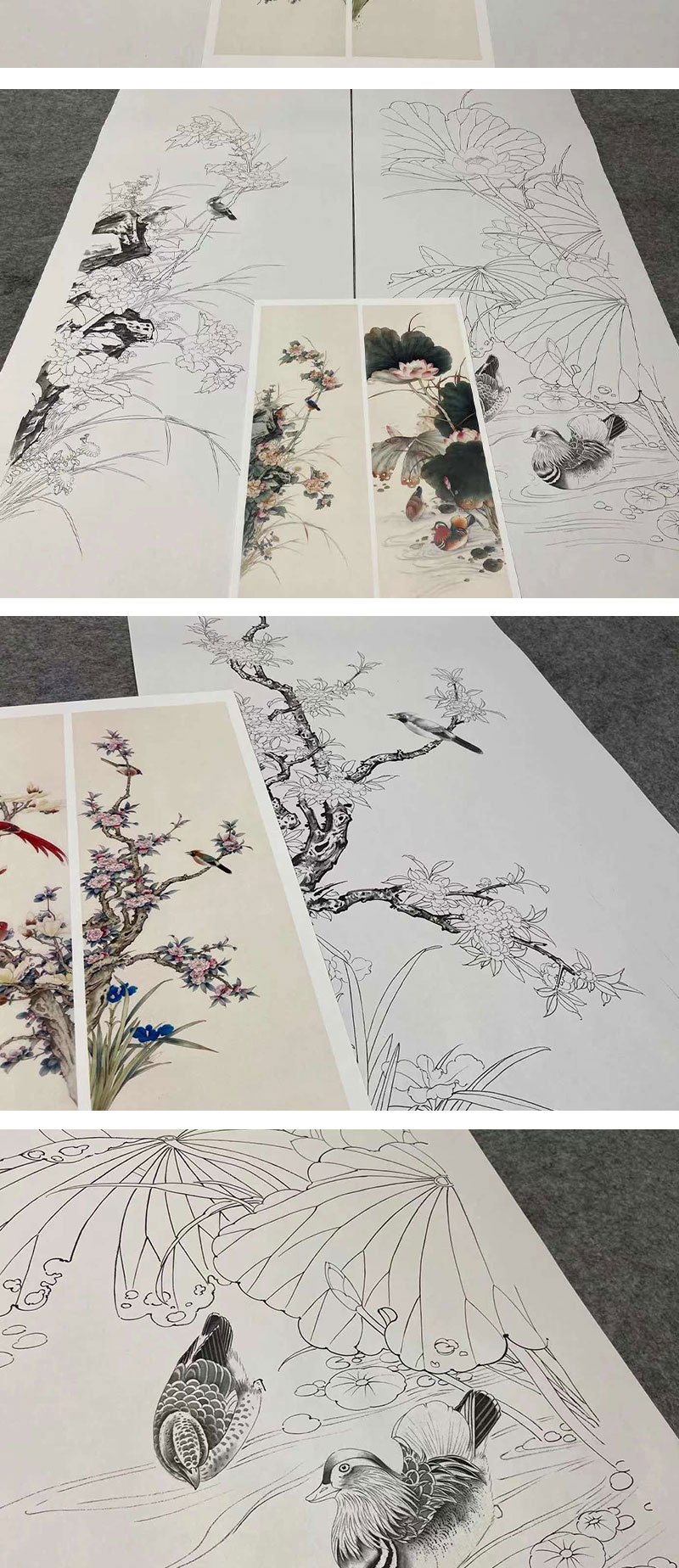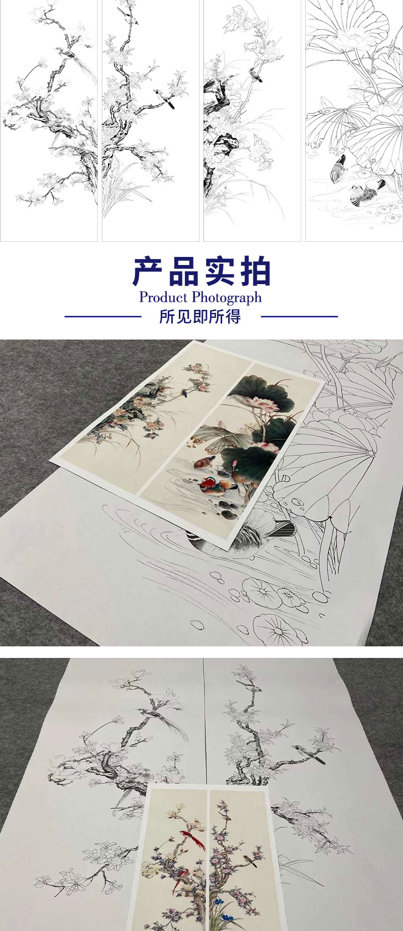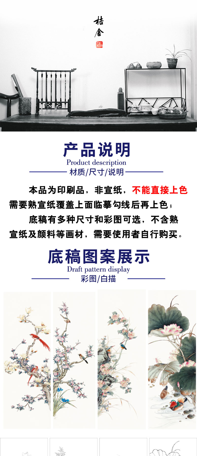 【四条屏】陈军工笔画白描稿荷花桃花临摹勾线花鸟线稿CJ60